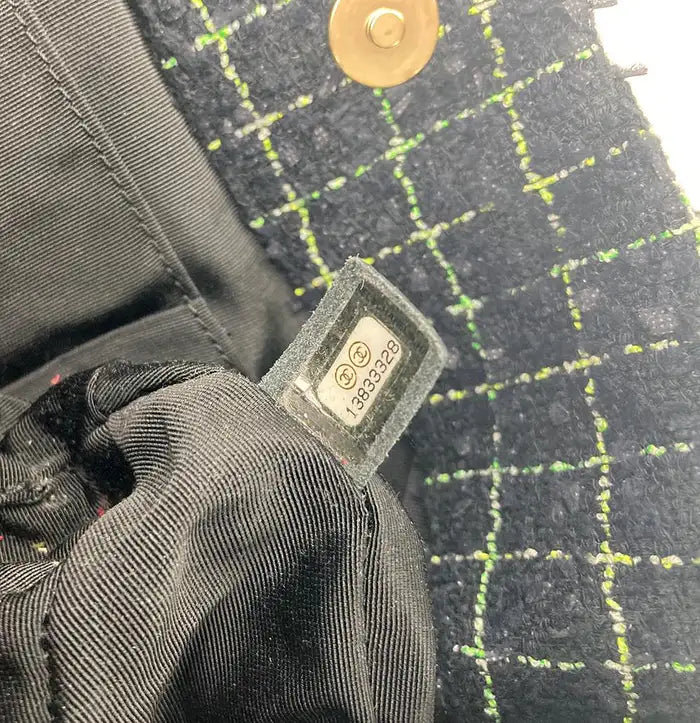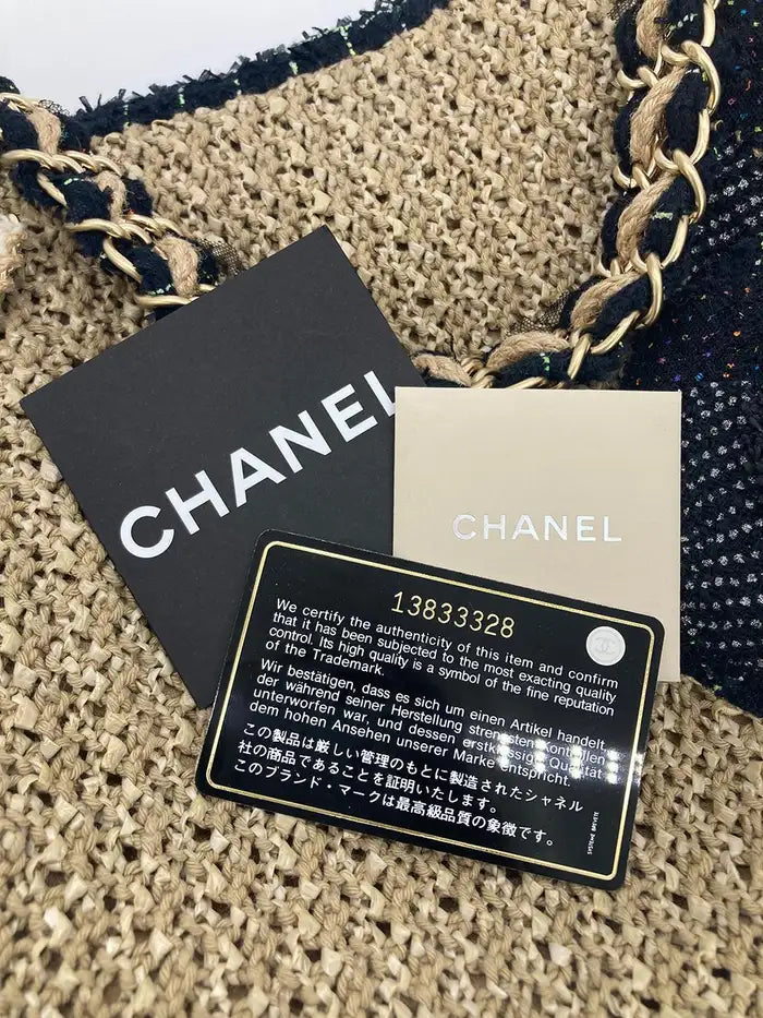 Chanel Woven Tan Rattan Straw Wool Trim Camellia Flower Shoulder Bag in excellent condition. Woven, crocheted tan straw rattan with black printed wool tweed boucle camellia flower along front side and matte gold hardware. Woven wool, straw and double chain shoulder strap. Tweed, straw and gold CC logo charm attached on end of strap. Top snap closure opens to a black nylon and tweed lined interior with 2 slit and 1 zipped side pockets and a black leather attached key strap. No stains smells or pulls in straw. Clean corners, edges and interior. Perfect for collectors and fashion lovers alike. Purchase includes a dust cover. Measurements: 16"x10"x5"
