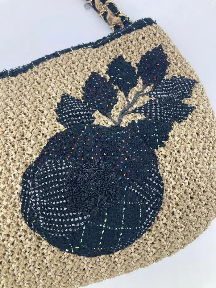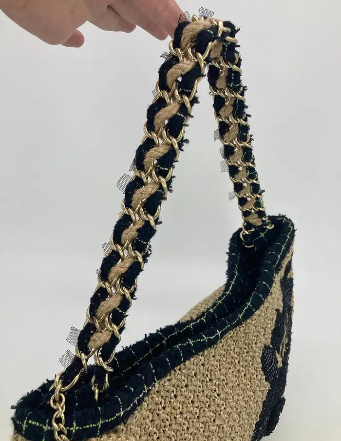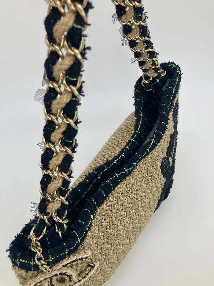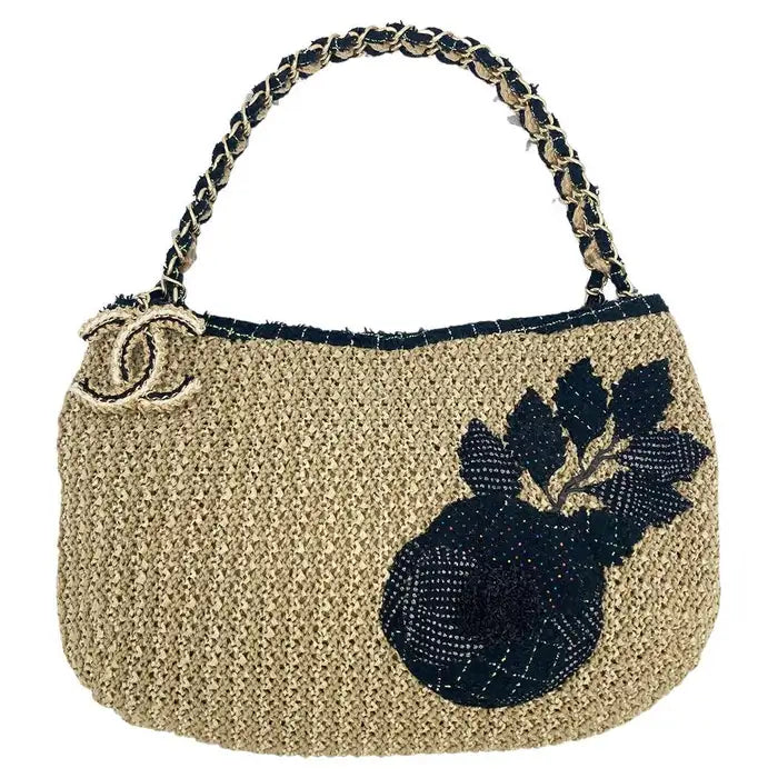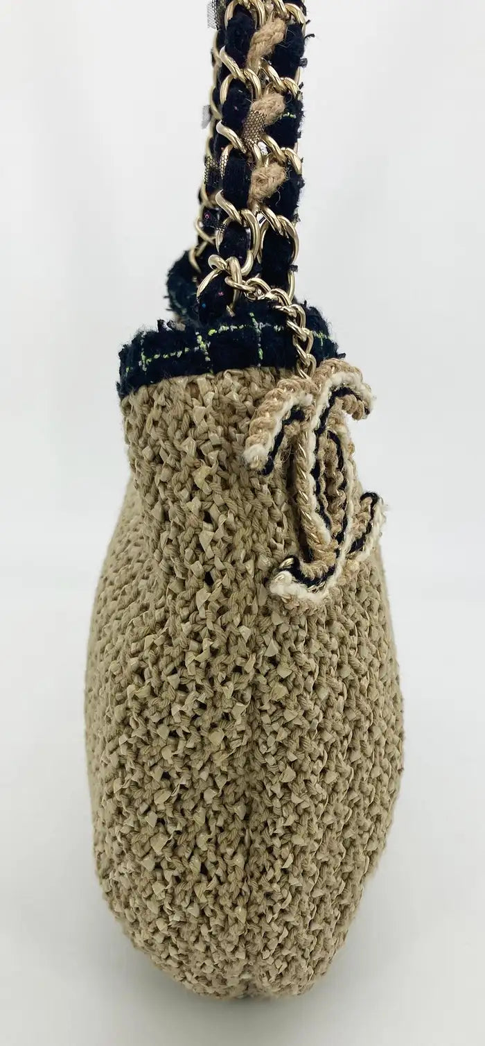 Chanel Woven Tan Rattan Straw Wool Trim Camellia Flower Shoulder Bag