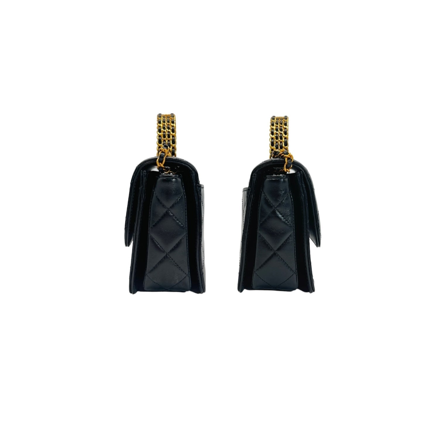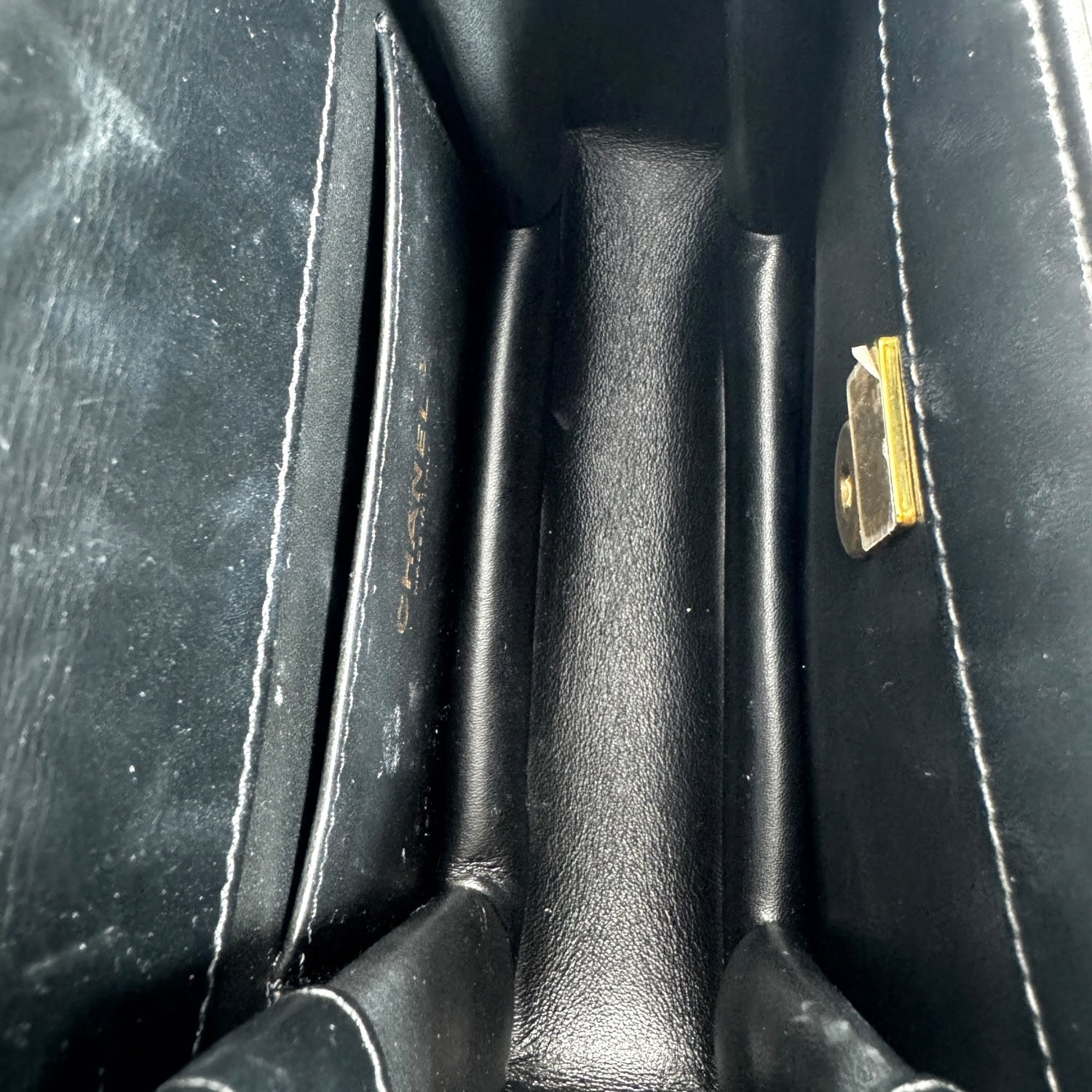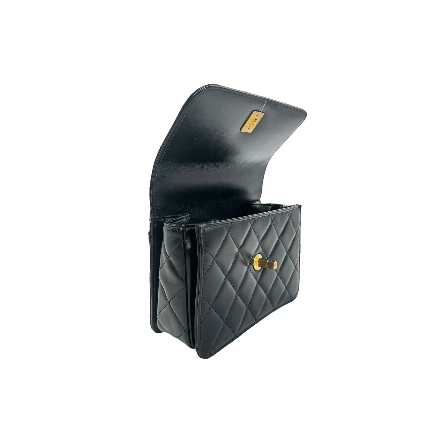 Expertly crafted by designer Chanel, this black lambskin leather flap bag is a timeless luxury. Threaded with gold-tone hardware and featuring a single interior and exterior flat pocket, it's both stylish and practical. The iconic CC turn-lock closure adds a touch of elegance. Made in Italy and in very good condition.
