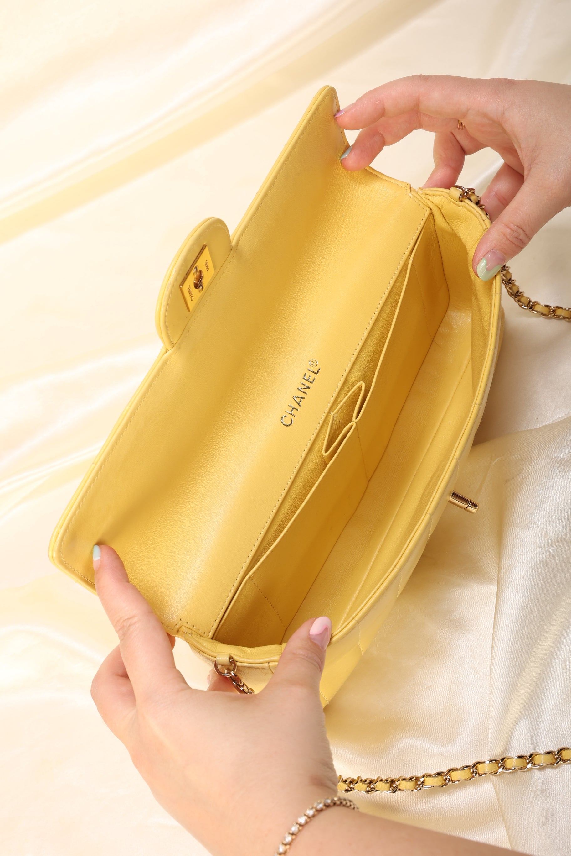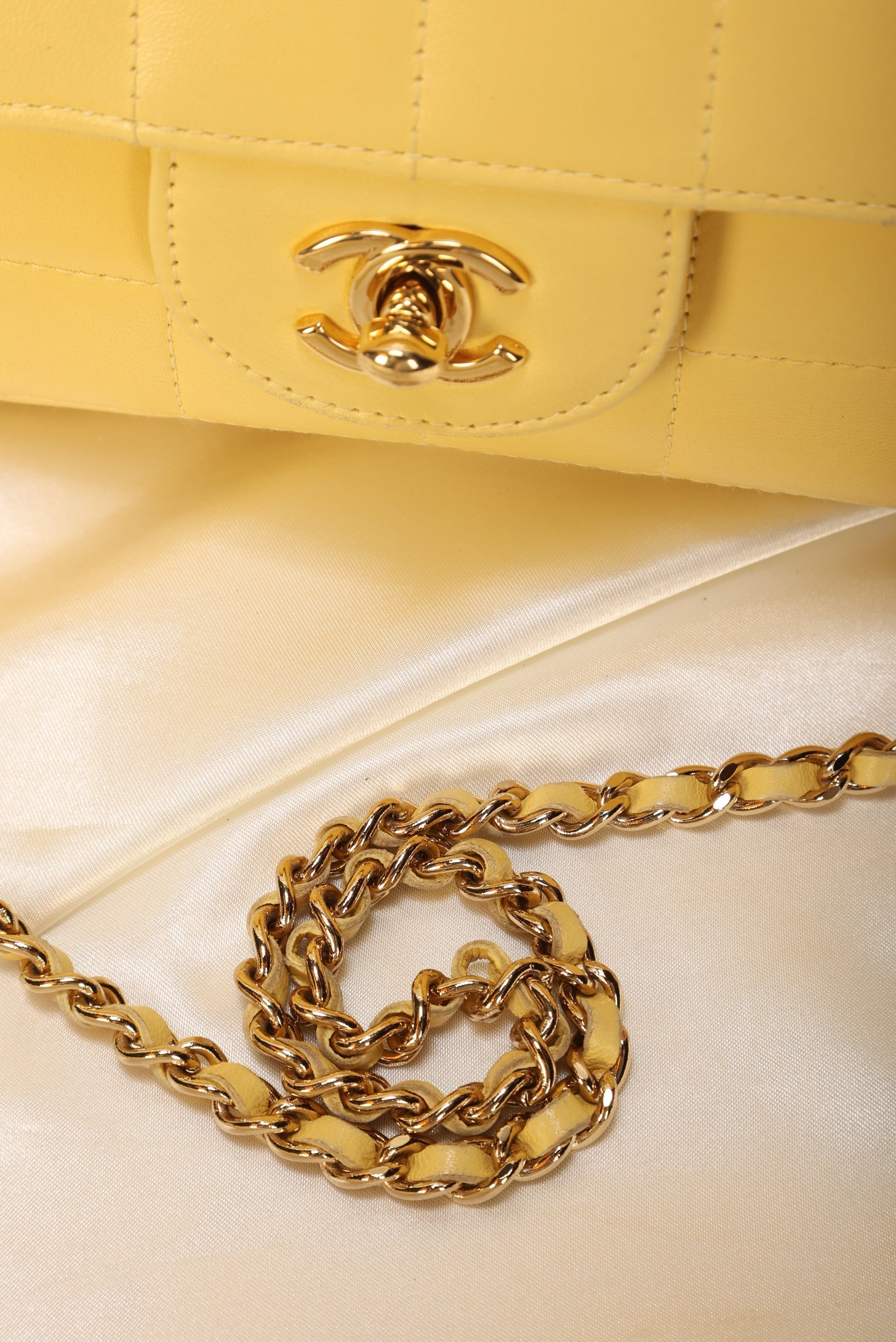 Perfect starter Chanel bag for someone just starting out with their collection!! (This style was also my first Chanel :)). Adorned in the iconic CC logo and crafted in?lambskin?in a beautiful pastel yellow pop of color.??