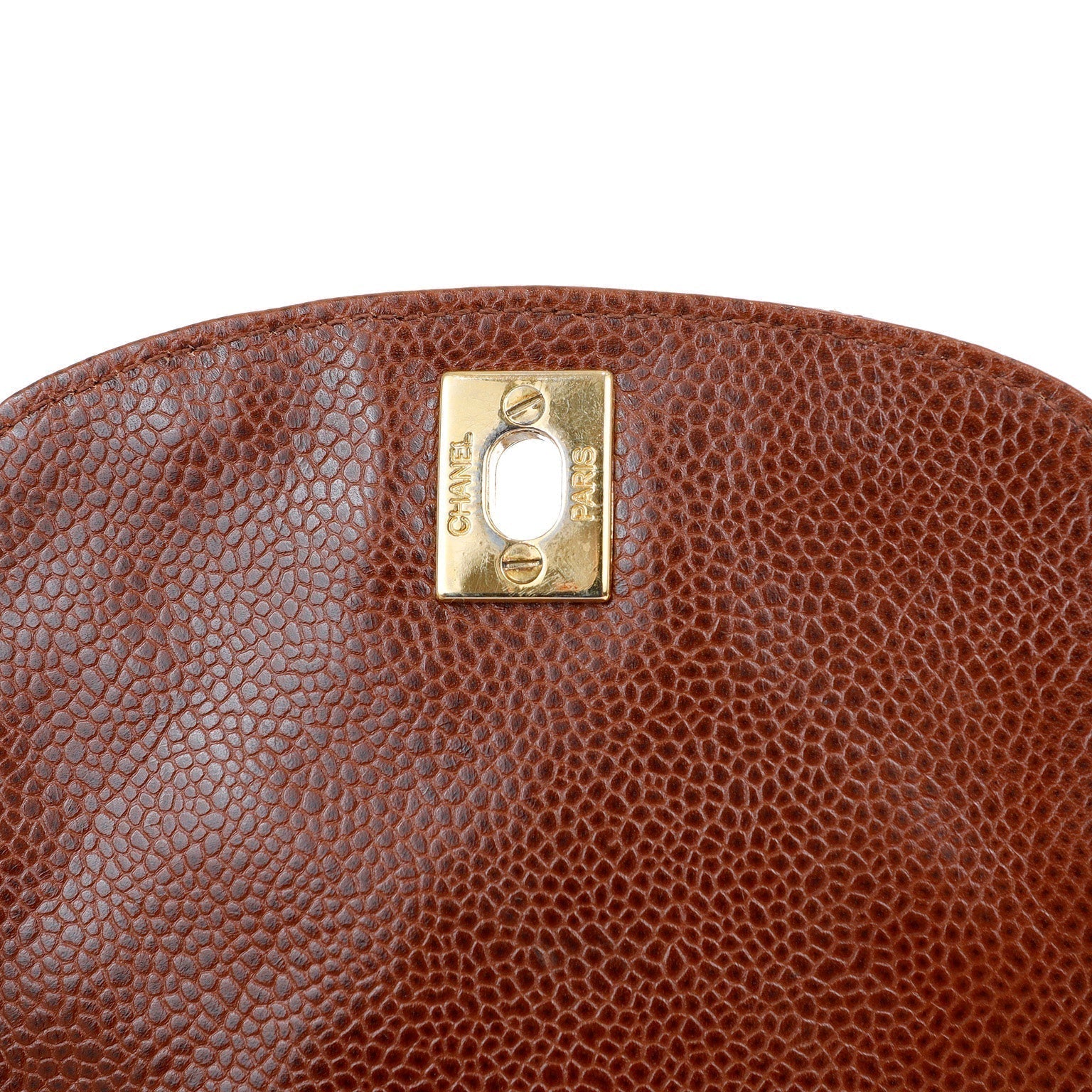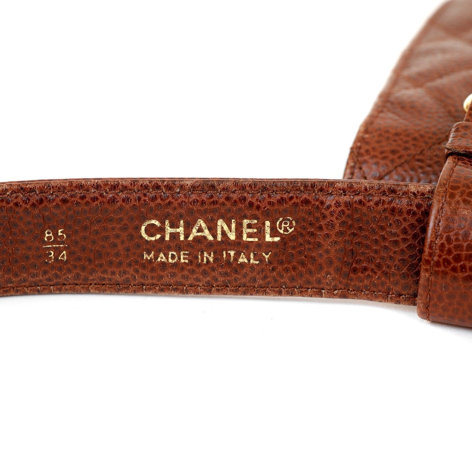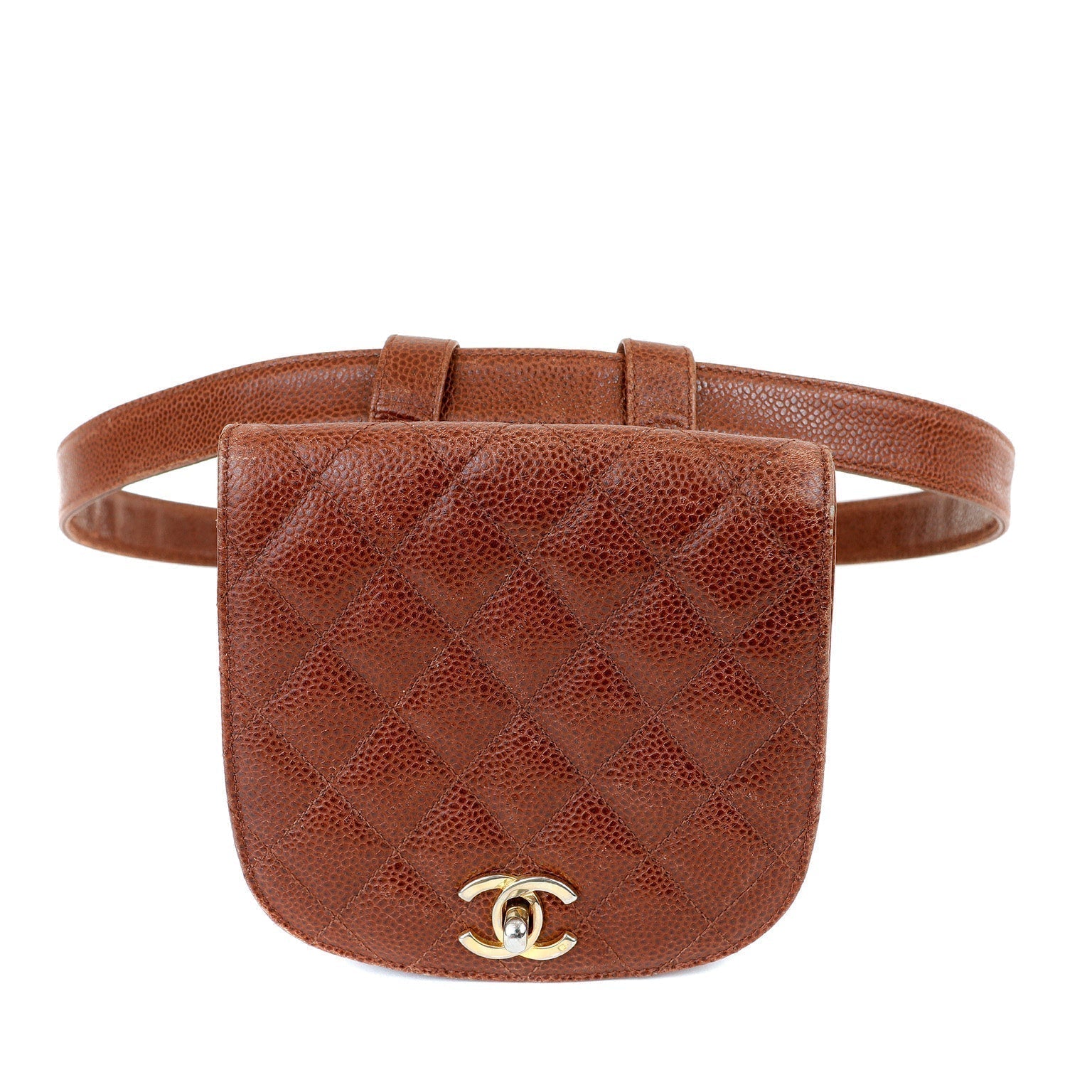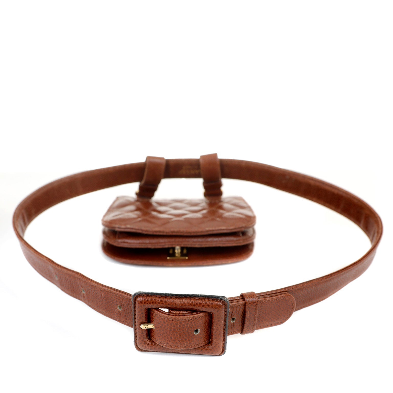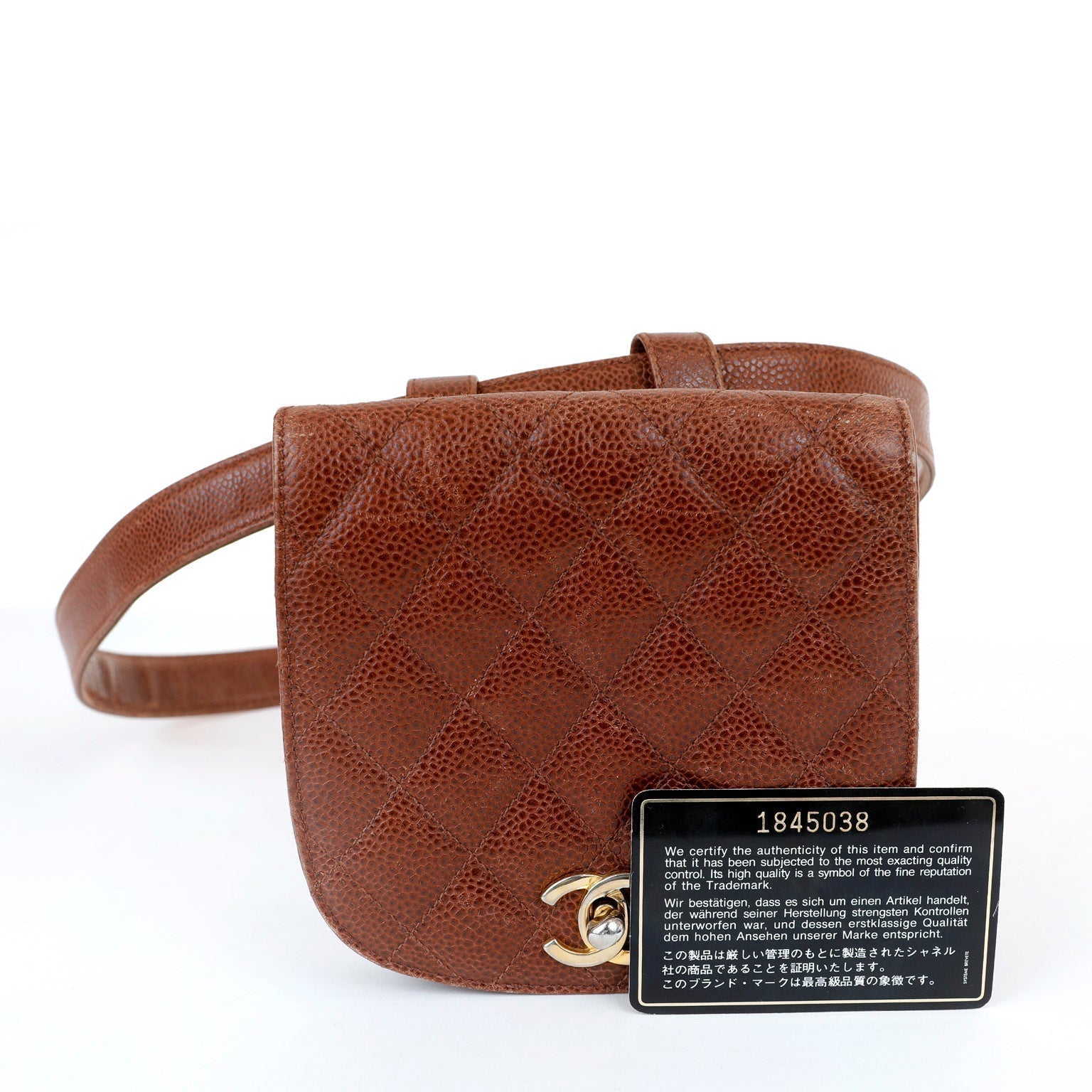 This Chanel Brown Caviar Waist Bag is in very New vintage condition. Durable and textured brown caviar leather is quilted in signature Chanel diamond pattern. Interlocking CC twist lock secures the small flapped pouch. Adjustable buckled belt. Dust bag included.
