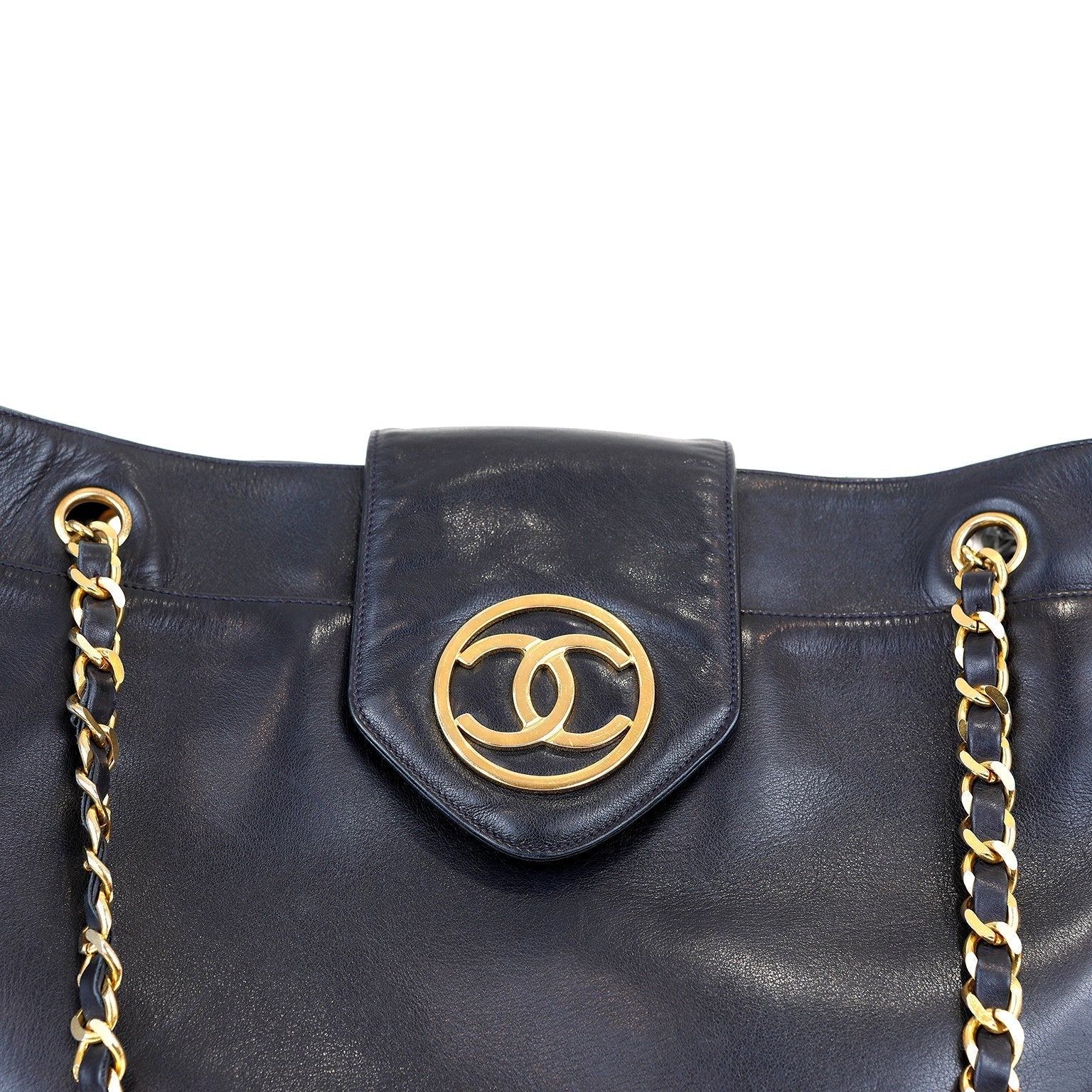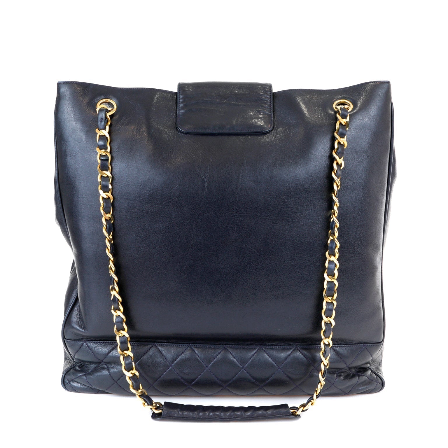 Rich navy blue lambskin tall totehas areinforced quilted bottom. Flap over withsnap closure has signature gold interlocking CC insignia. Leather lining has one side zippered pocket. Double leather and gold chain entwined straps are comfortably carried on the shoulder. Dust bag included.