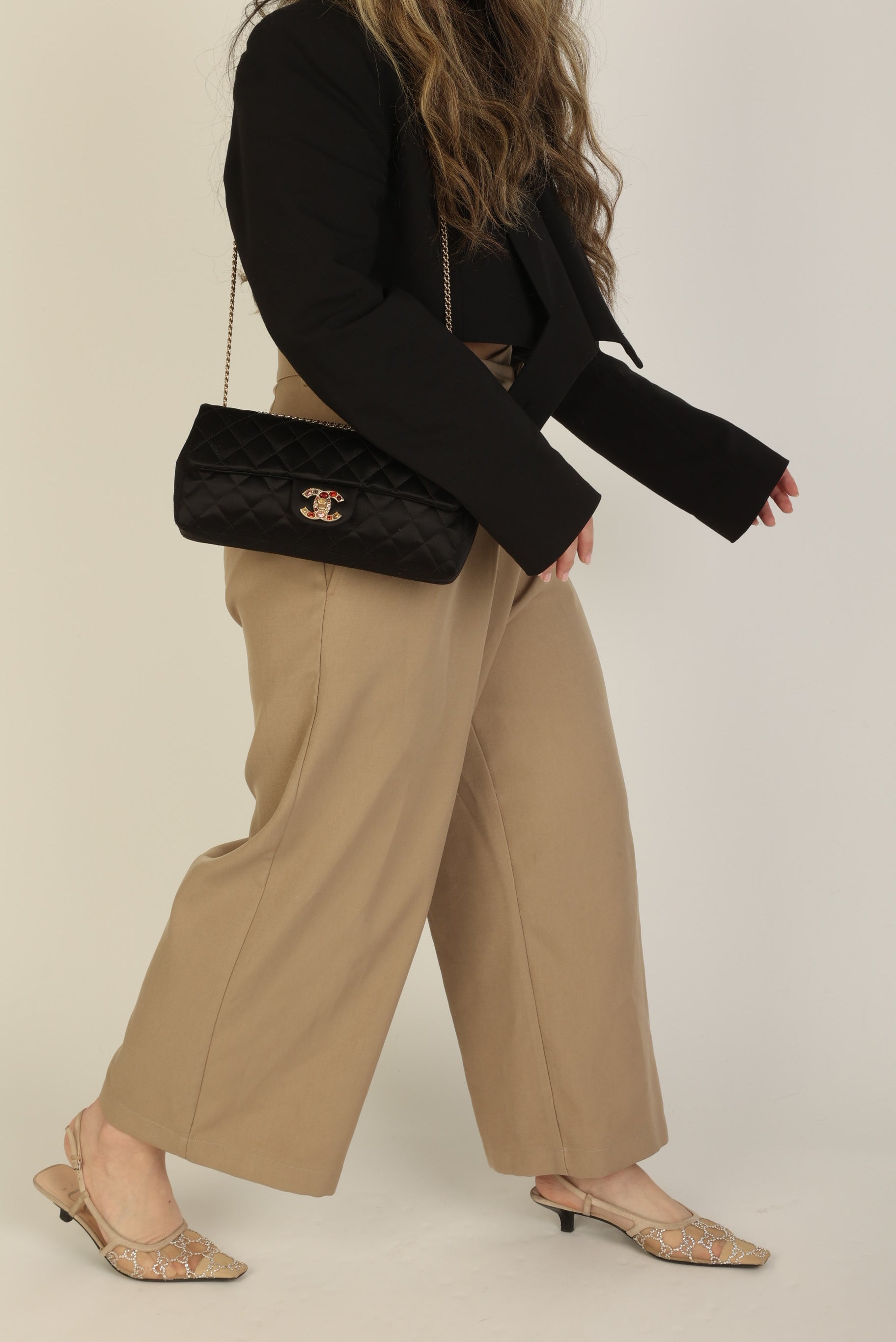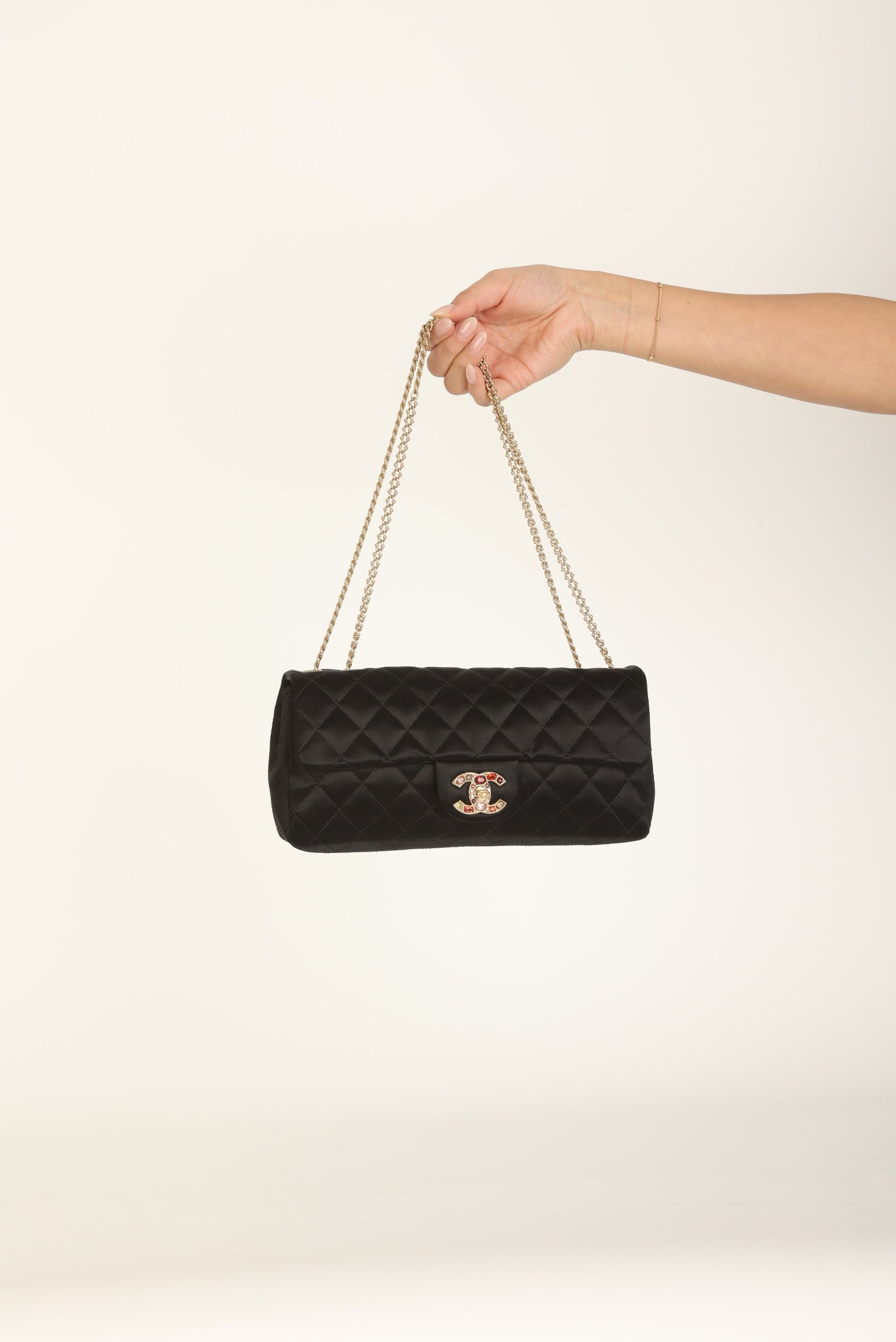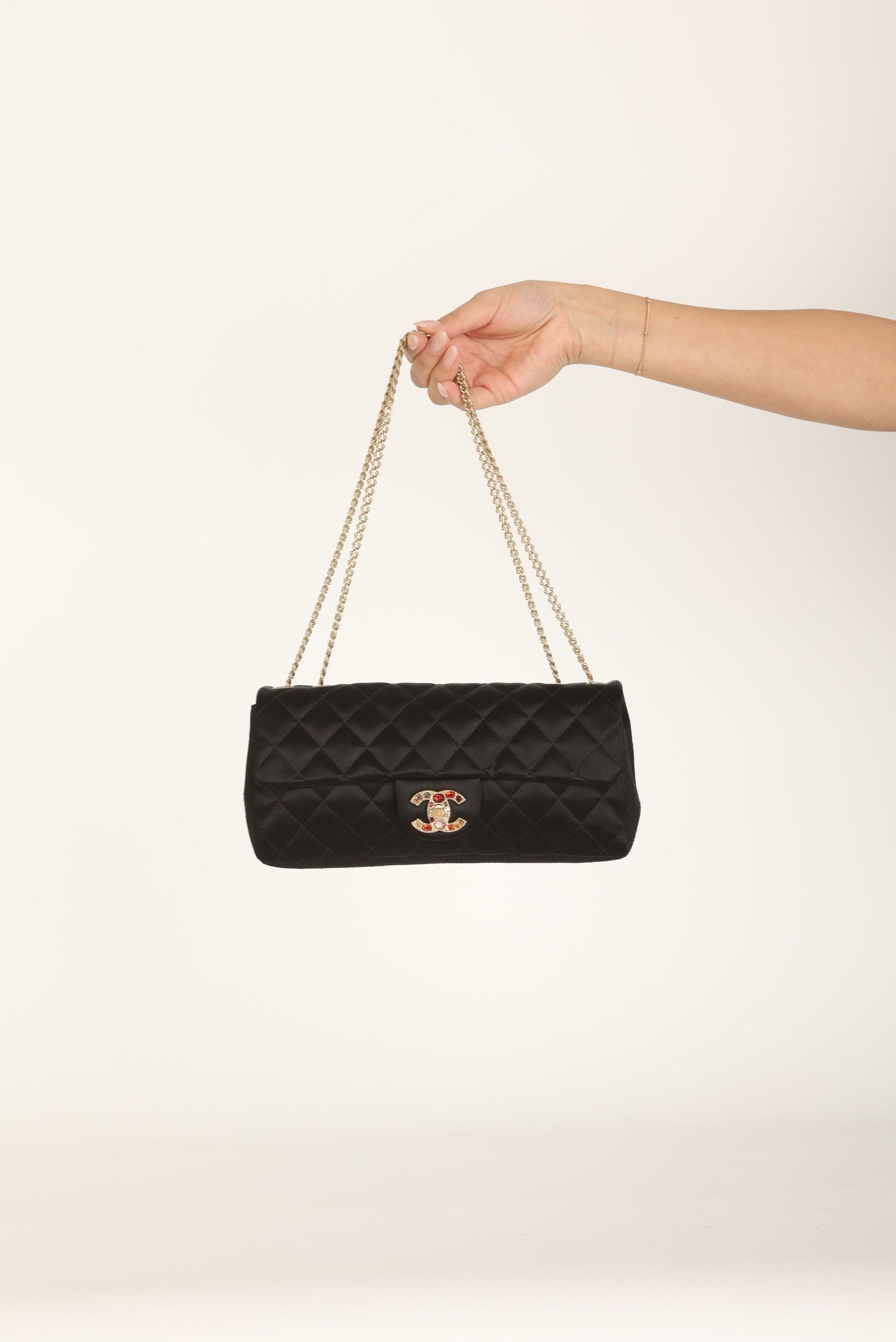 Dropping in the shop is a beautiful Chanel Satin Gemstone East West in black with gold hardware! This beauty is such a unique piece for its east west design (which is now discontinued), the gorgeous chain detail, and the eye-catching gemstones on the CC turnlock. This is such a great date night or special occasion bag. and can wear as a long or short shoulder bag. You can fit your phone, keys, wallet, sunglasses, and a few of your smaller essentials.