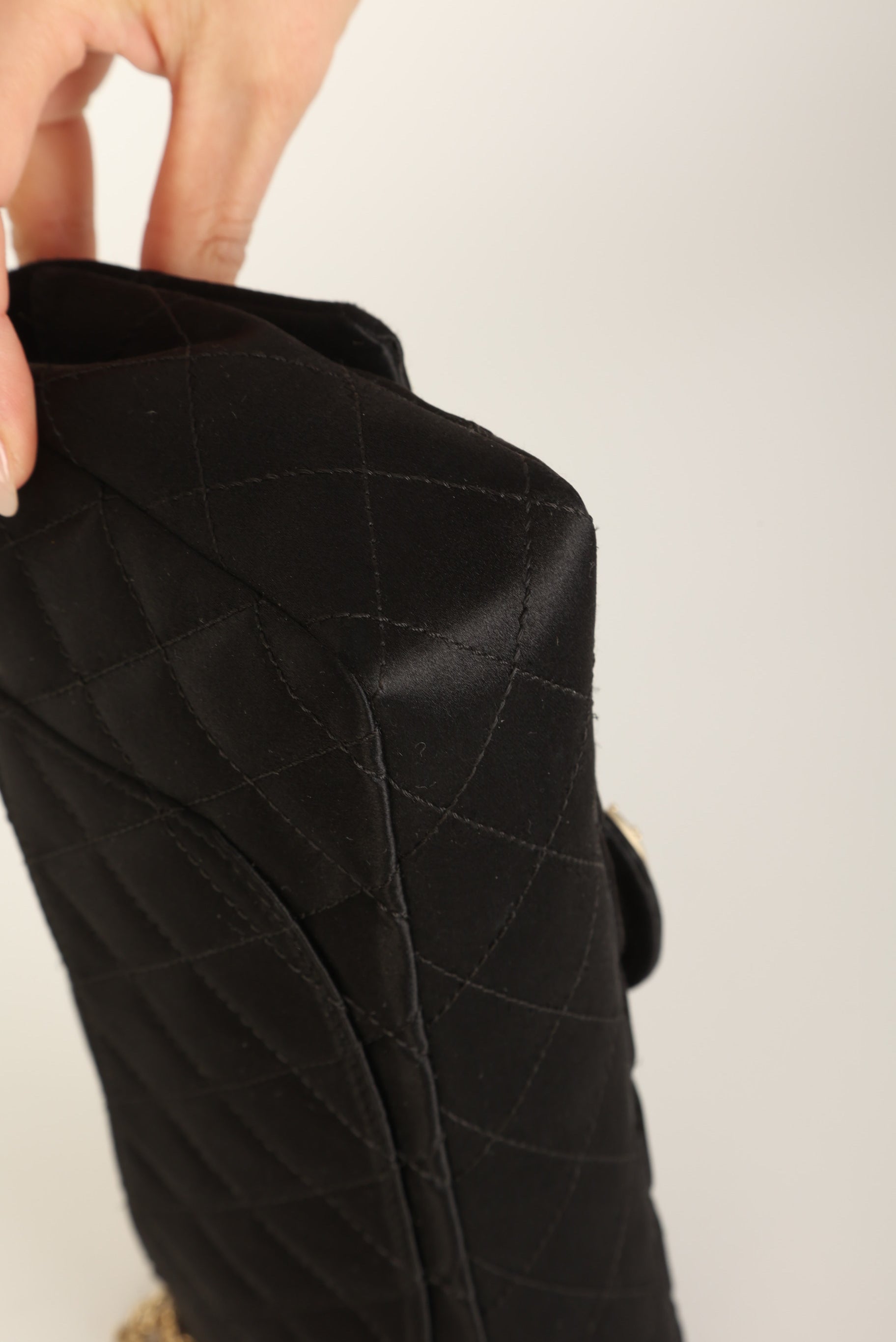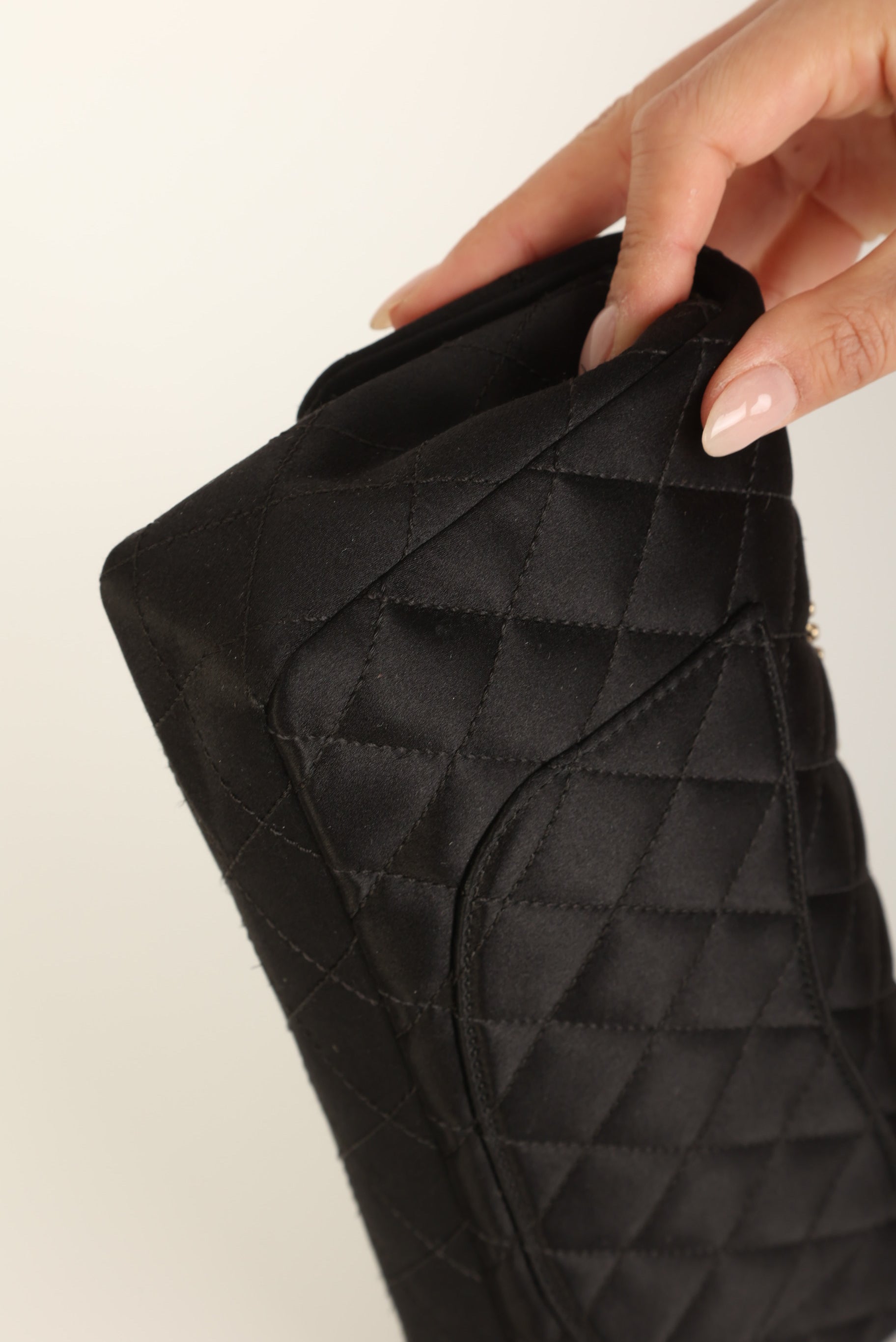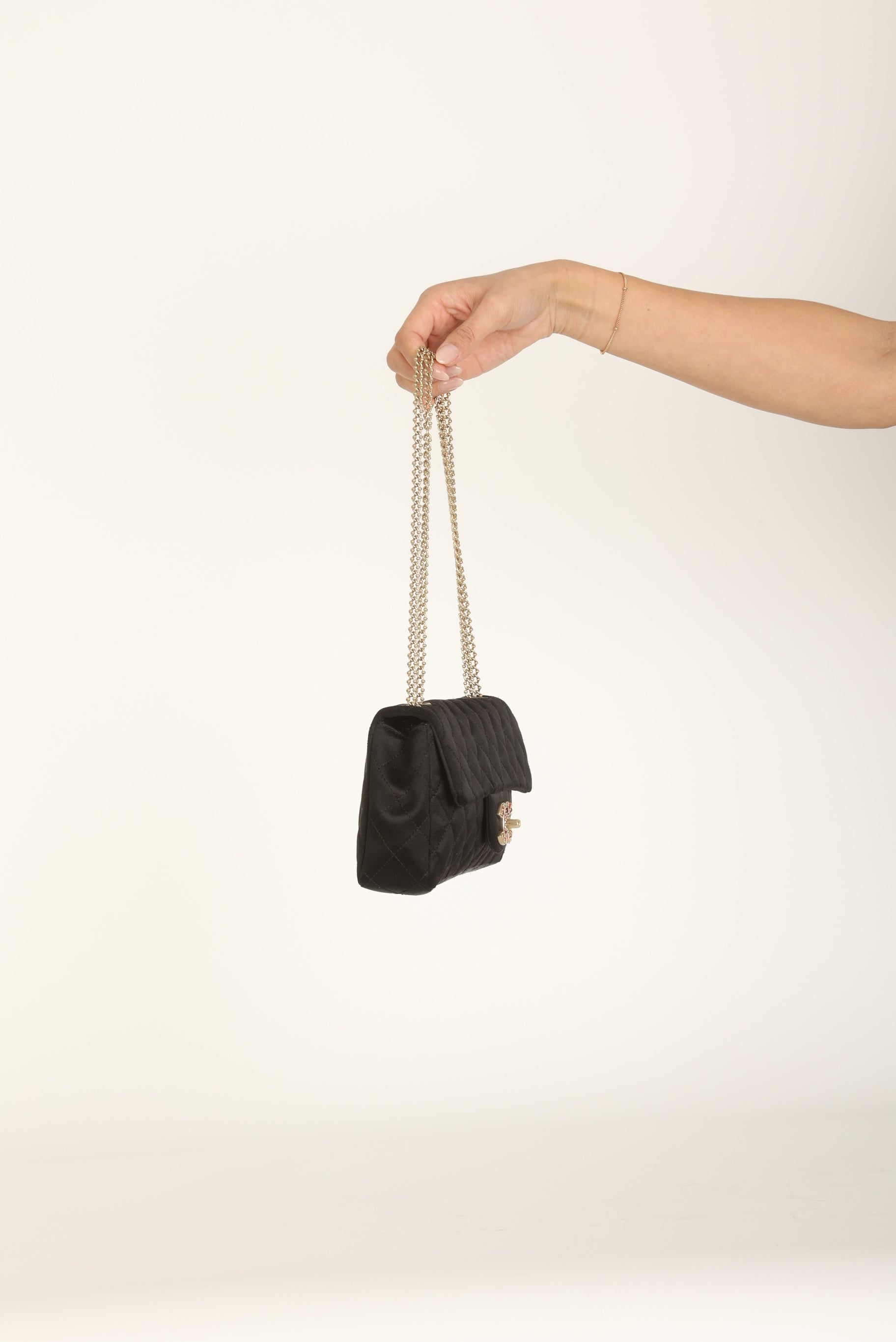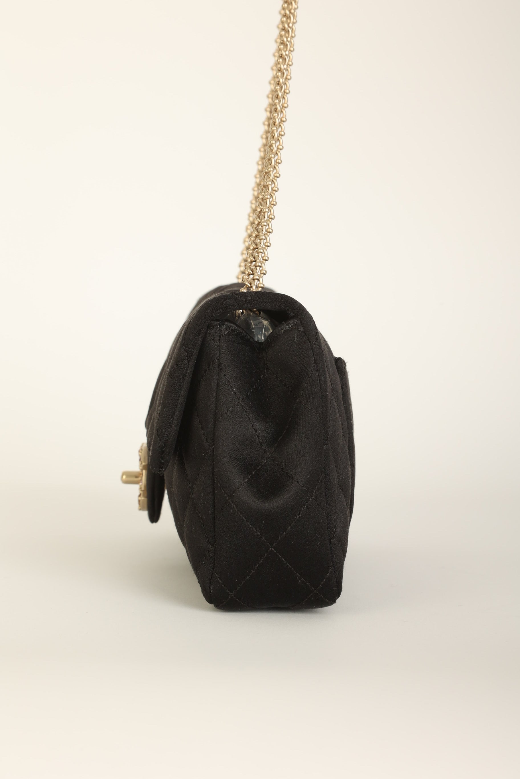 Dropping in the shop is a beautiful Chanel Satin Gemstone East West in black with gold hardware! This beauty is such a unique piece for its east west design (which is now discontinued), the gorgeous chain detail, and the eye-catching gemstones on the CC turnlock. This is such a great date night or special occasion bag. and can wear as a long or short shoulder bag. You can fit your phone, keys, wallet, sunglasses, and a few of your smaller essentials.