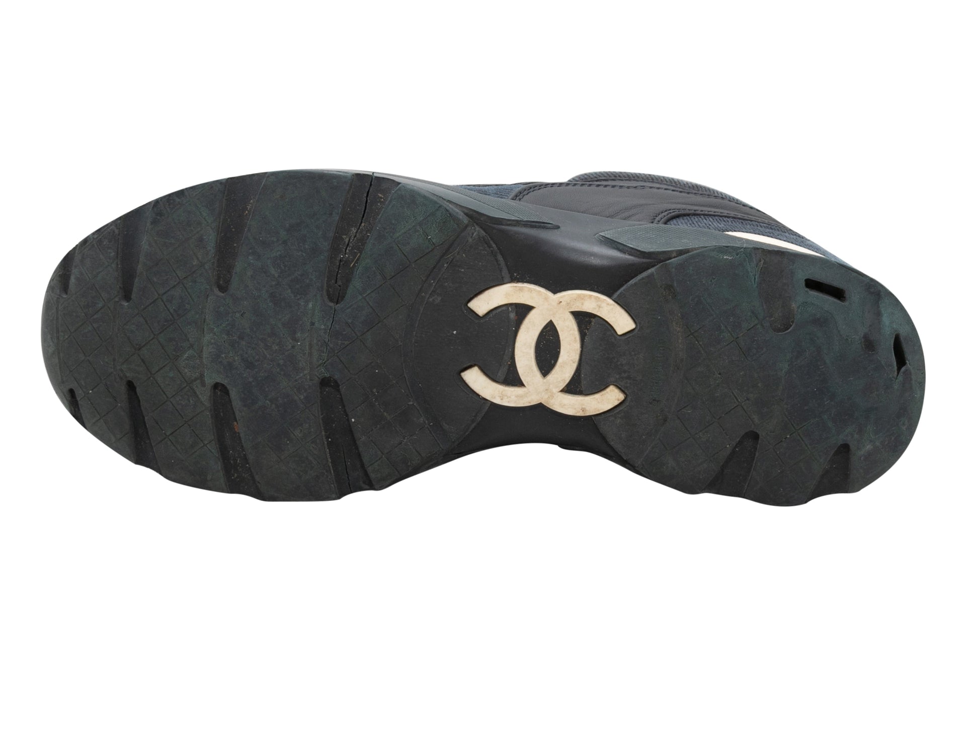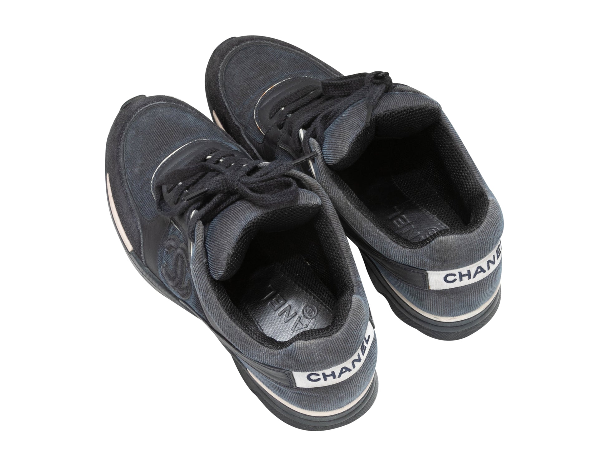 Product Details:Charcoal and navy CC corduroy low-top sneakers by Chanel. Rubber soles. Lace-up tie closures at tops. 1" platform height, 1"heel height.