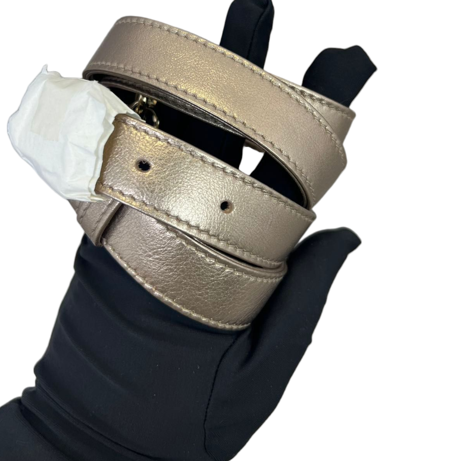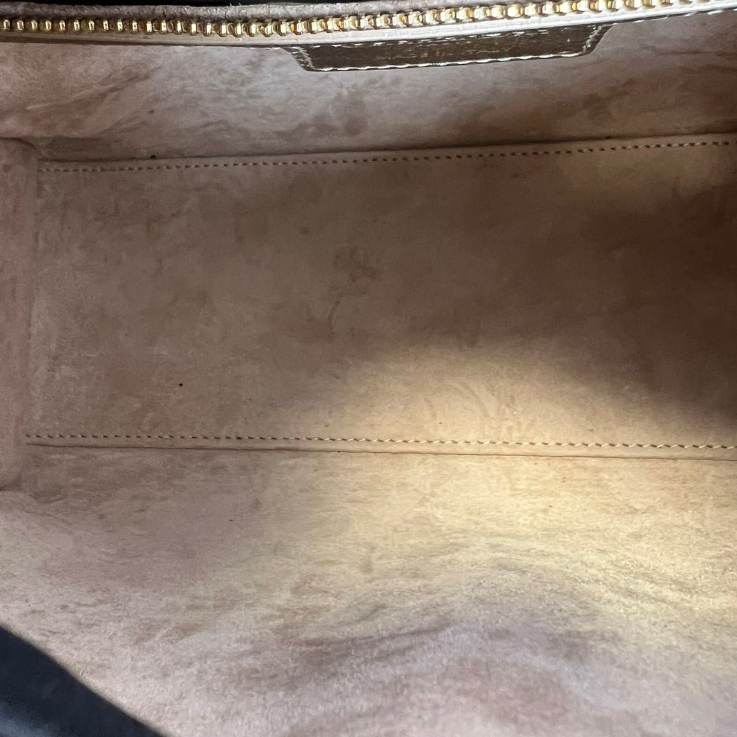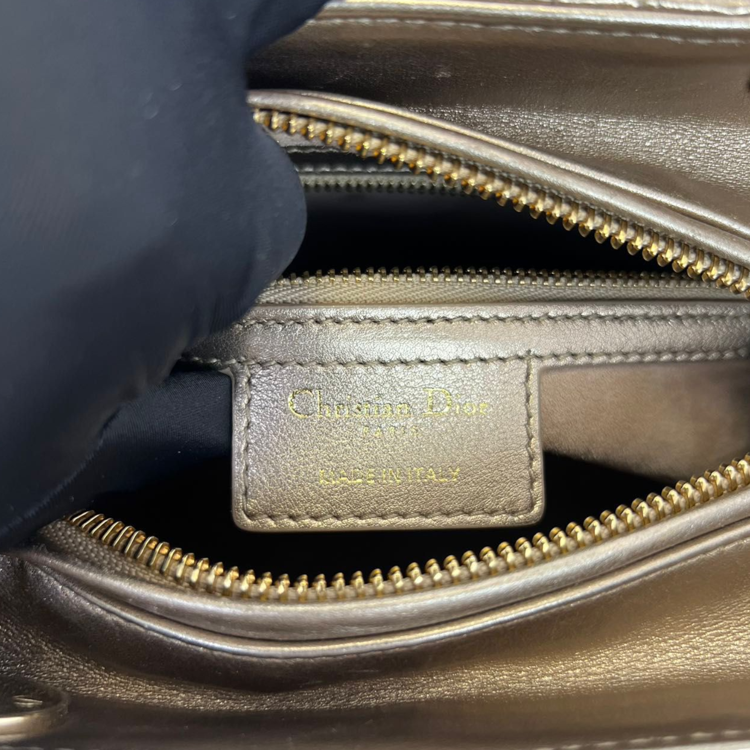 This is an Christian Dior Calfskin Cannage Medium Lady Dior in Gold. This is a stylish tote crafted of Dior signature geometric embroidered calfskin leather in gold. The bag boasts robust rolled leather top handles, accented by exquisite gold links and, complete with a charming Dior logo charm. It also offers the versatility of an adjustable leather shoulder strap. The bag's top opens effortlessly with a secure zipper, revealing a grey suede interior adorned with a convenient zipper pocket.