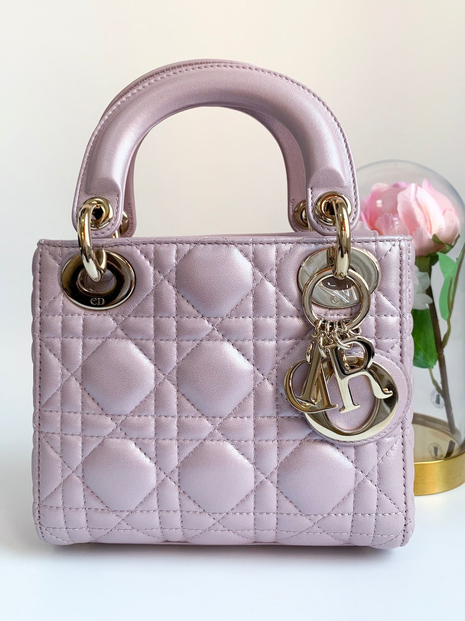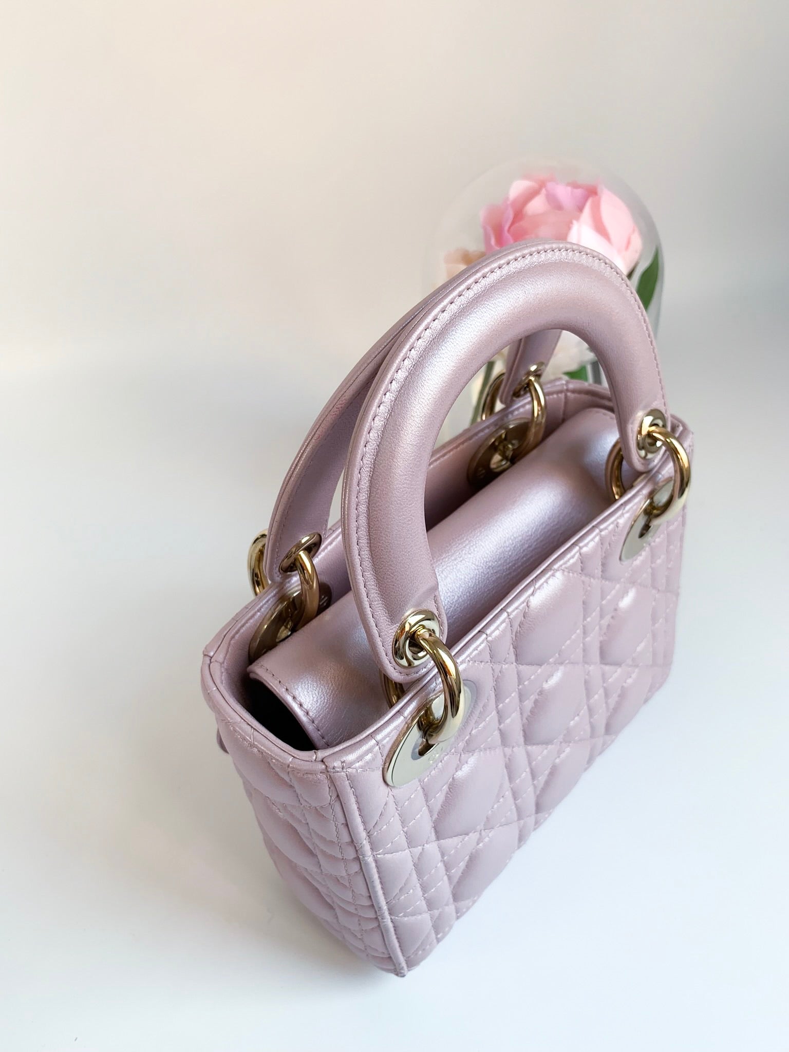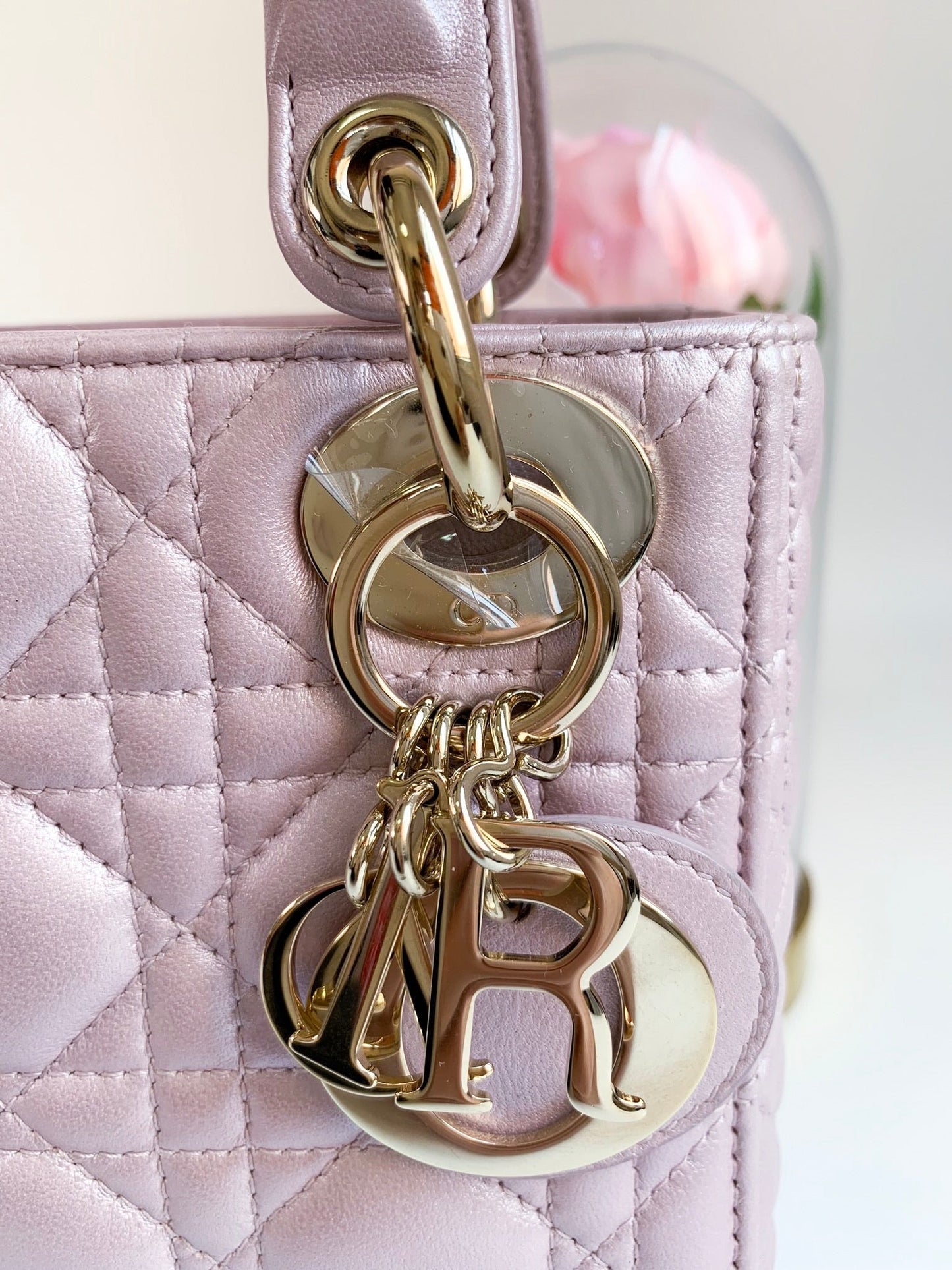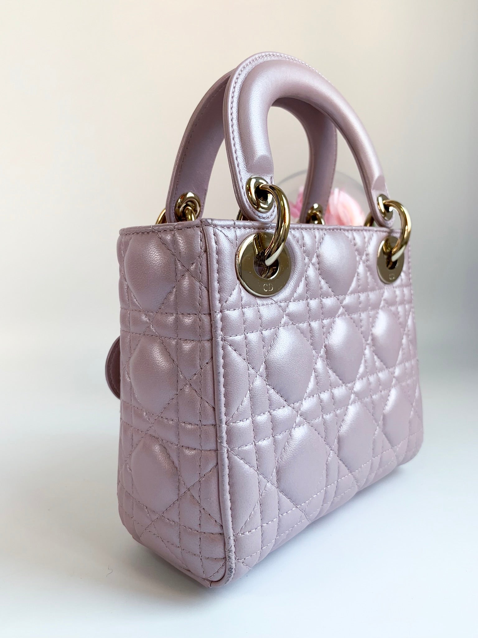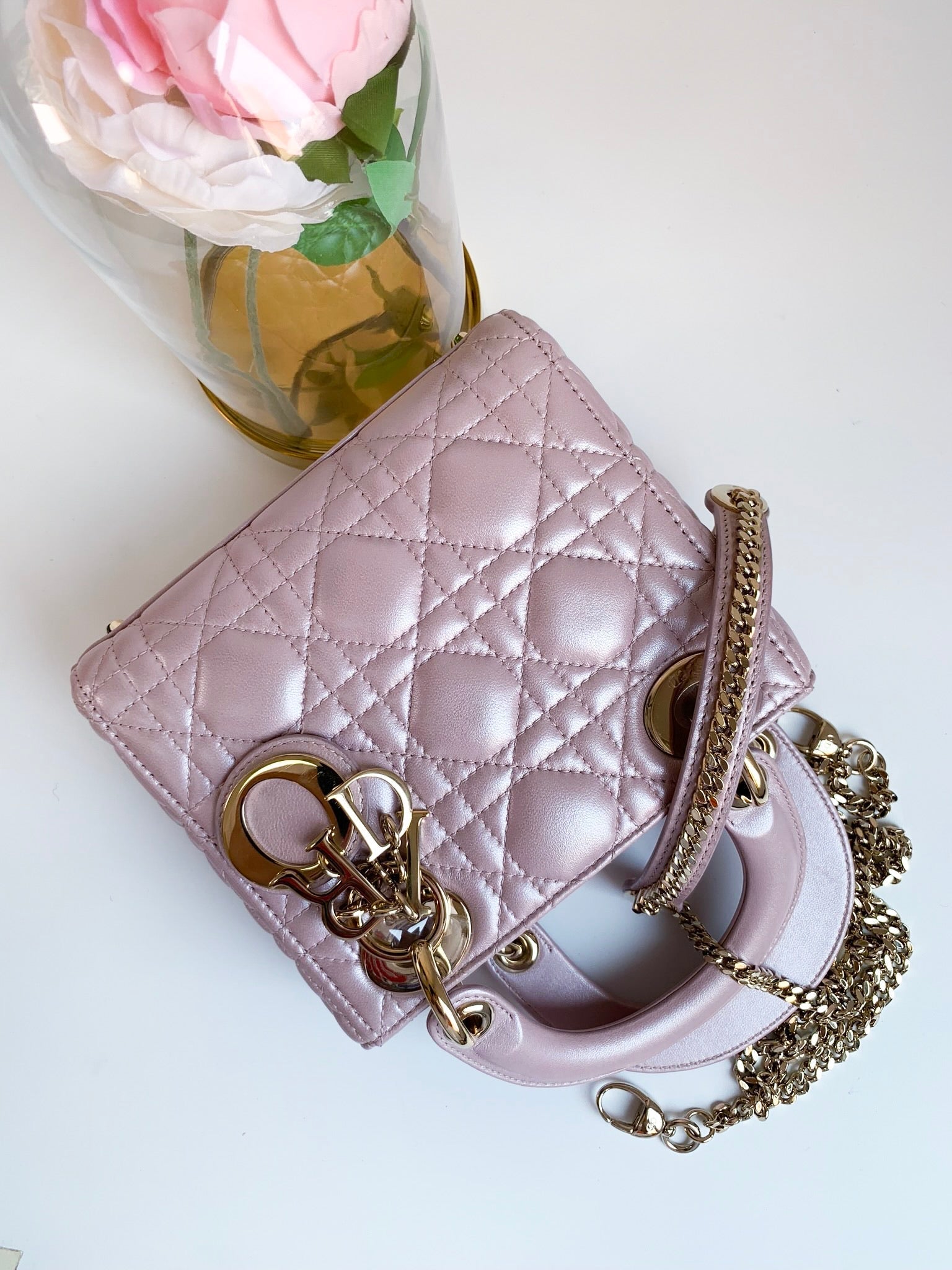 Christian Dior Metallic Calfskin Cannage Mini Lady Dior Pink