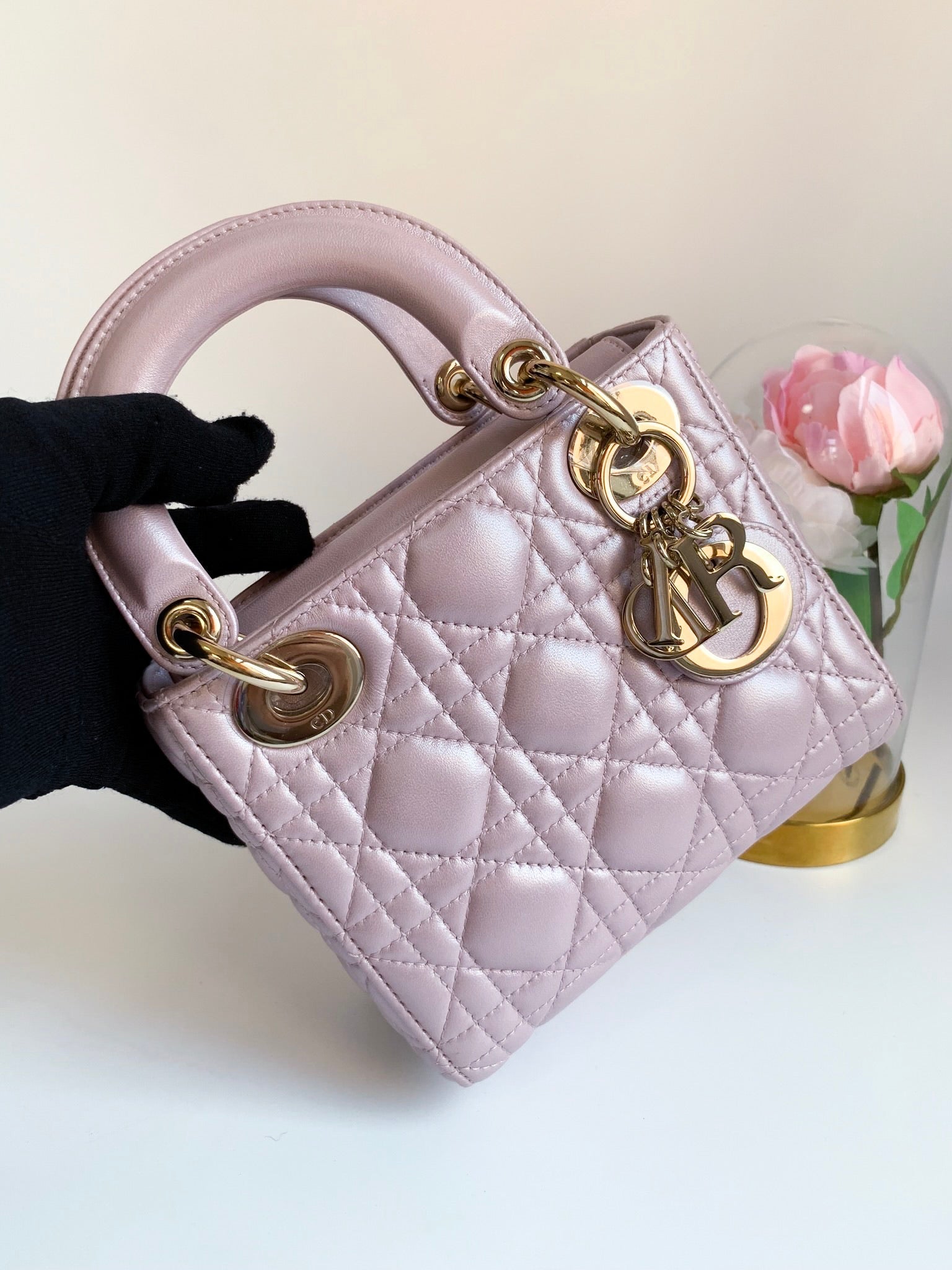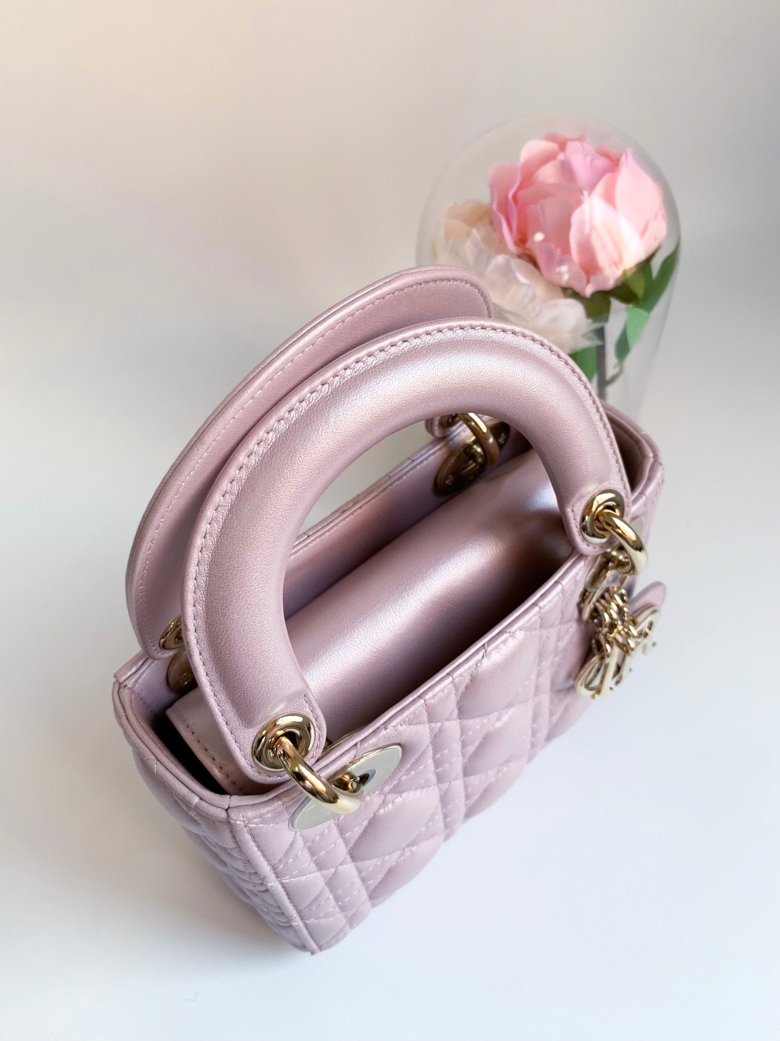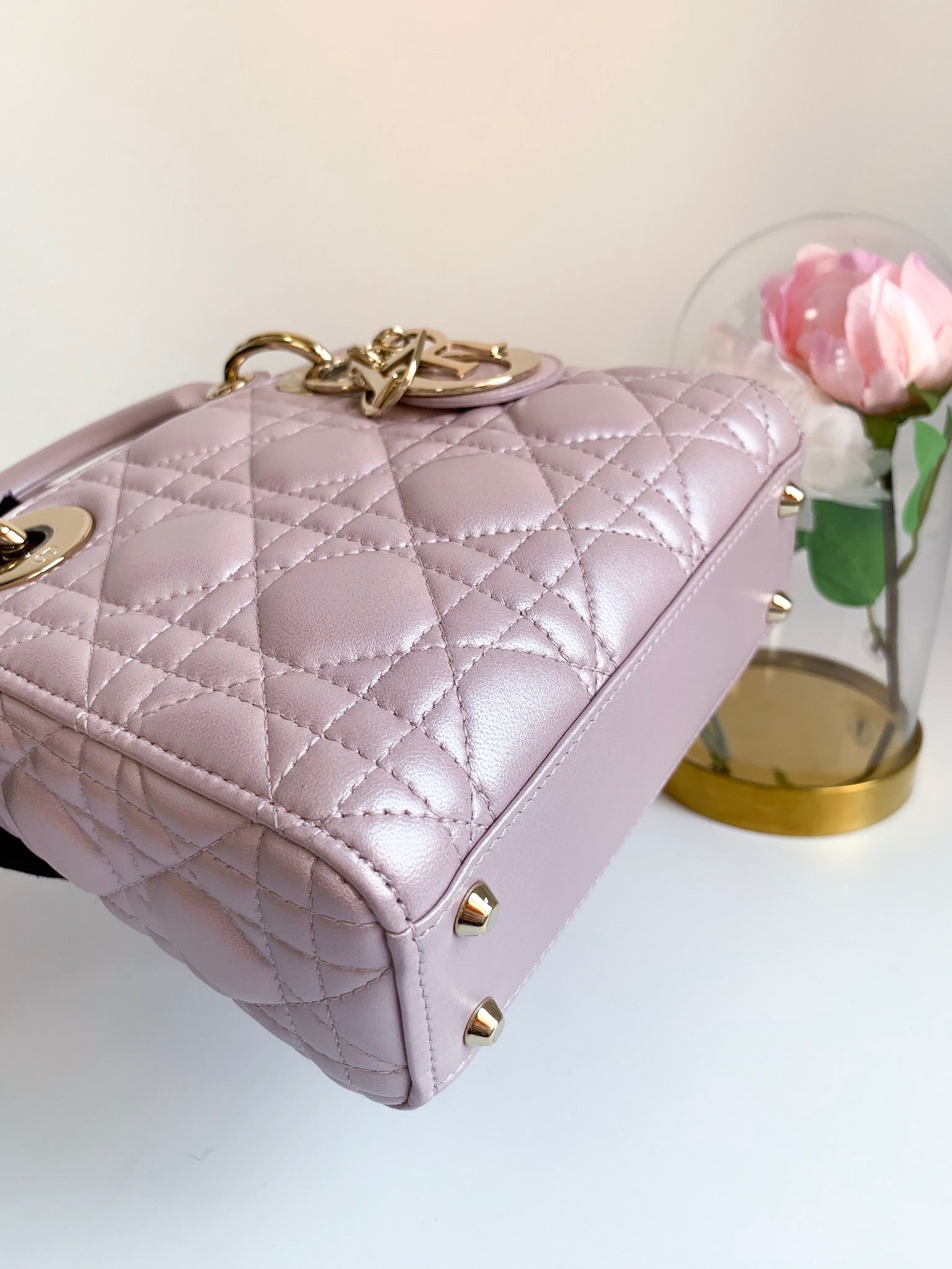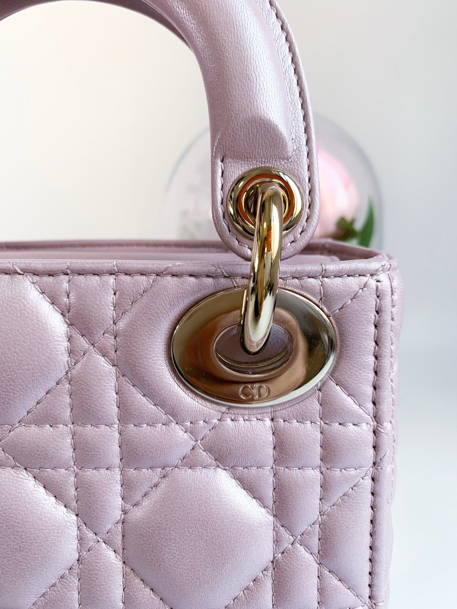 Christian Dior Metallic Calfskin Cannage Mini Lady Dior Pink