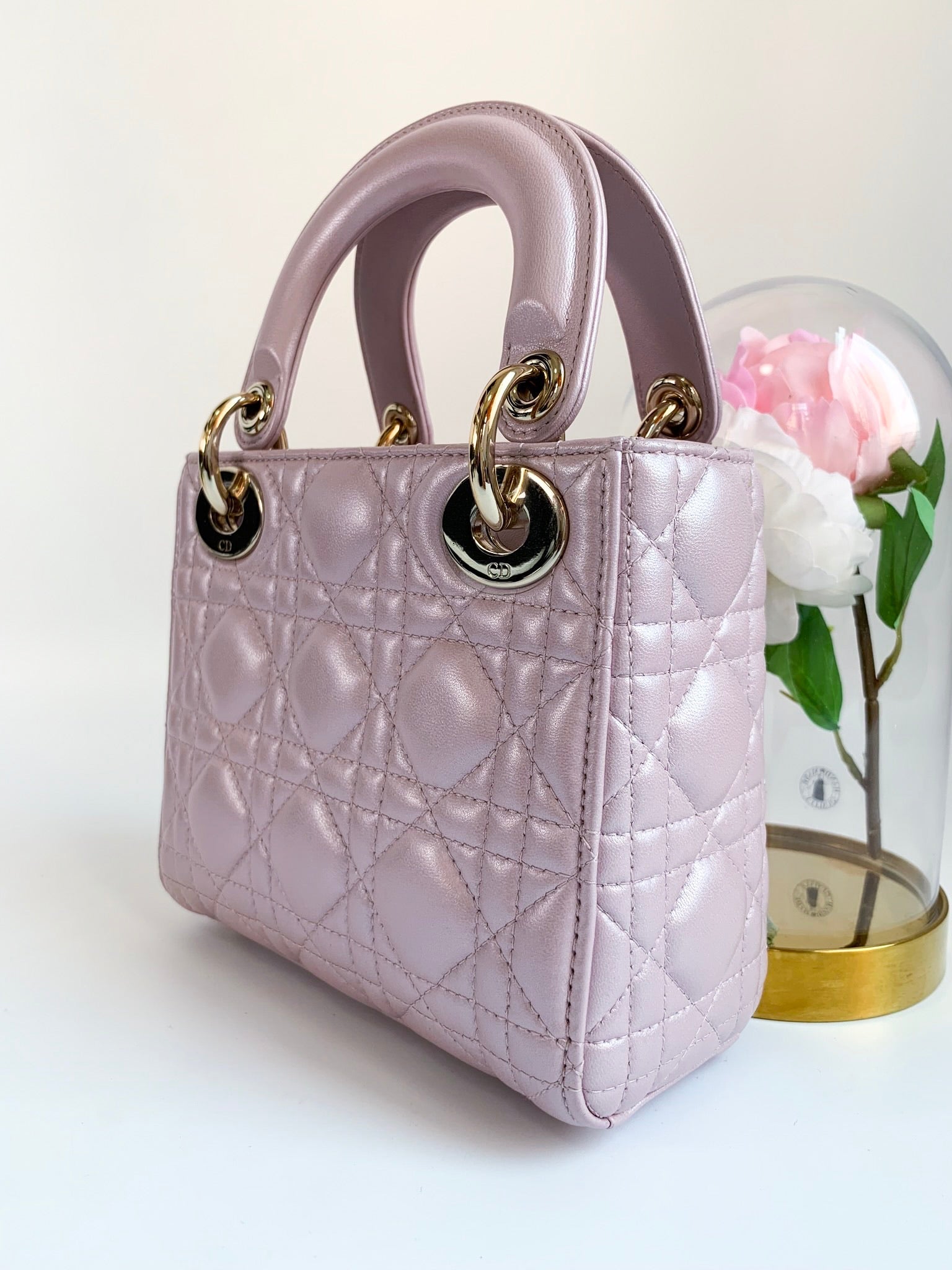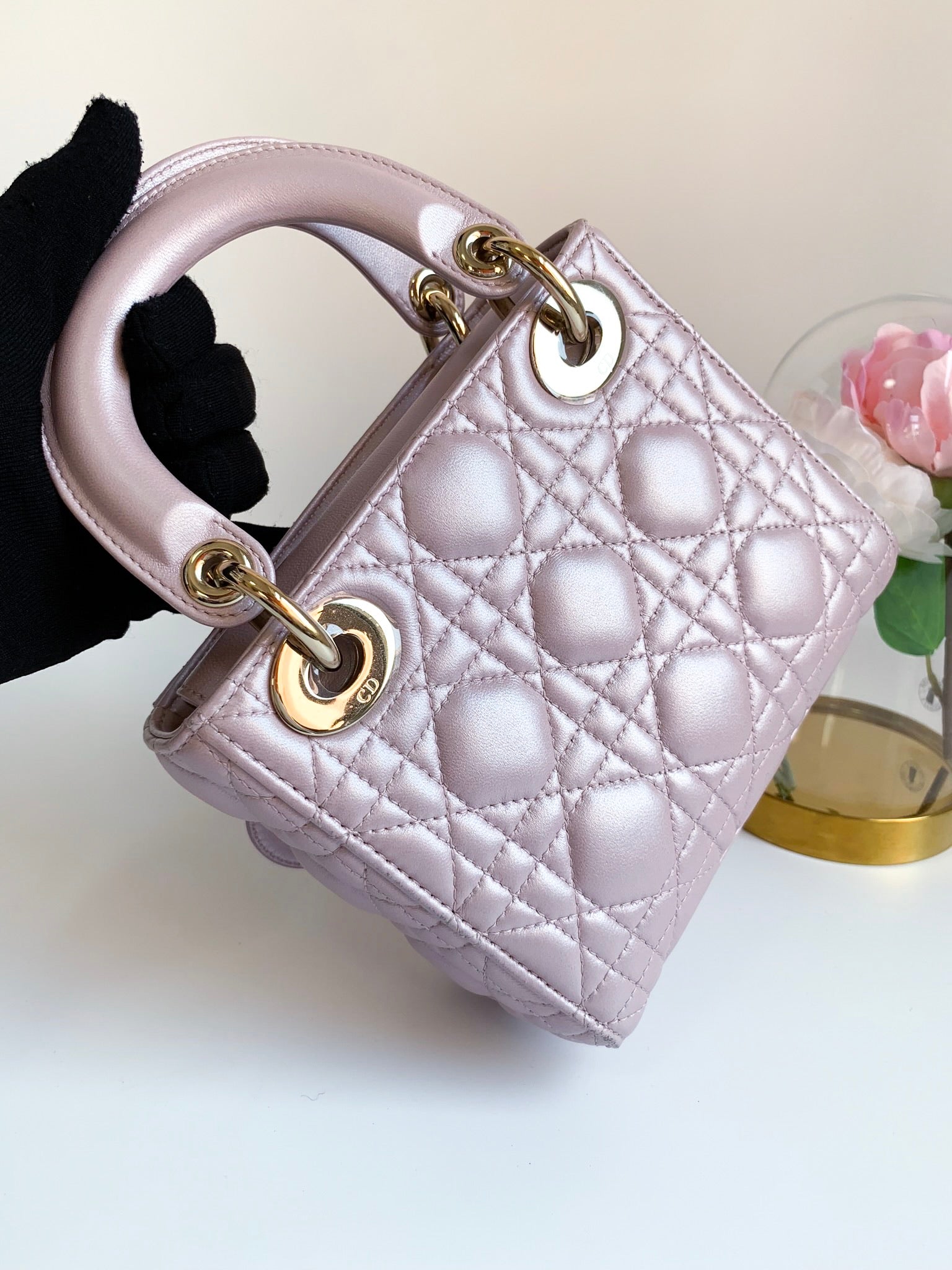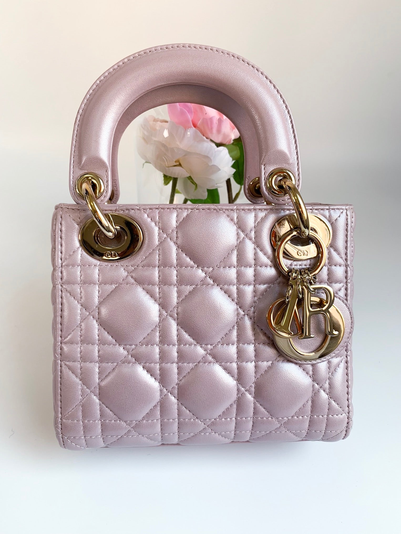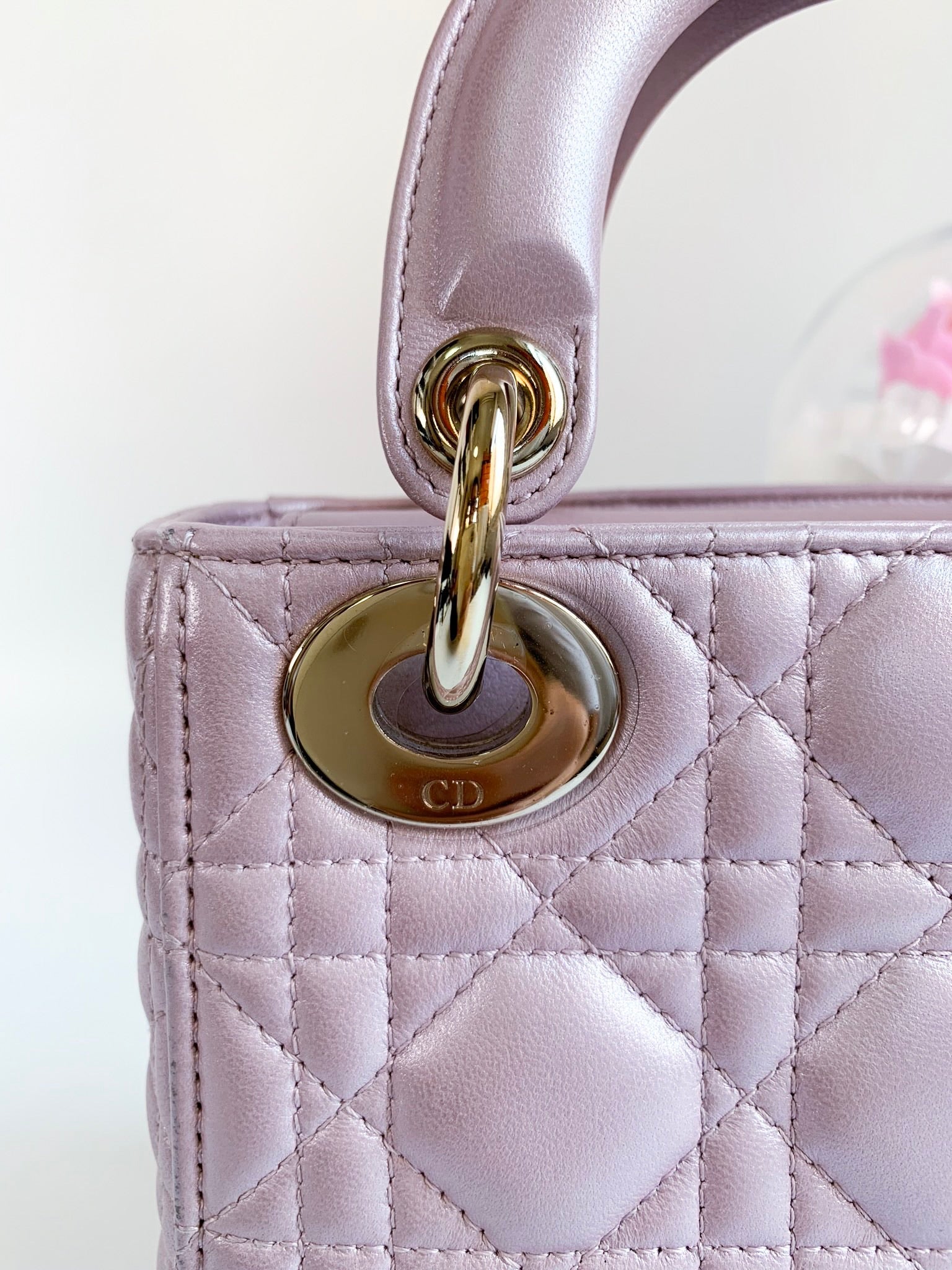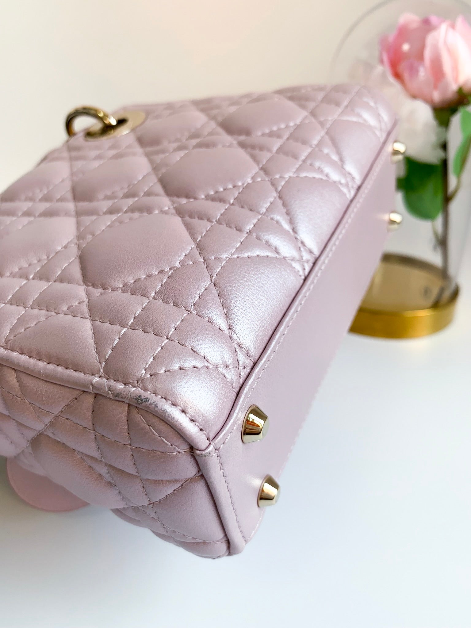 Christian Dior Metallic Calfskin Cannage Mini Lady Dior Pink