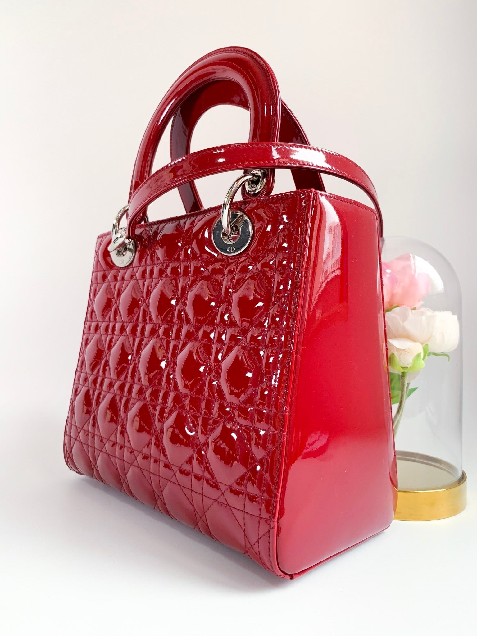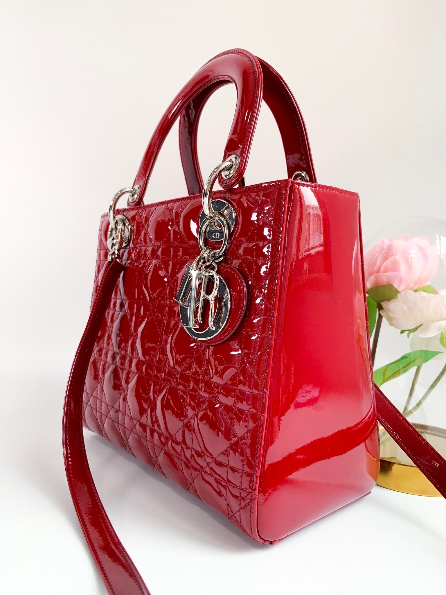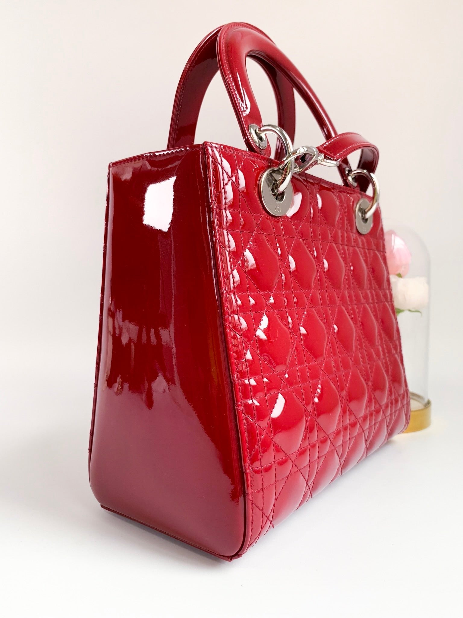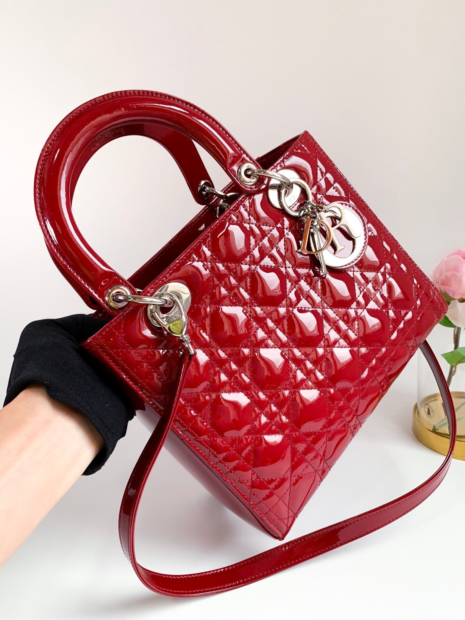 Christian Dior Patent Cannage Medium Lady Dior Red Silver Hardware