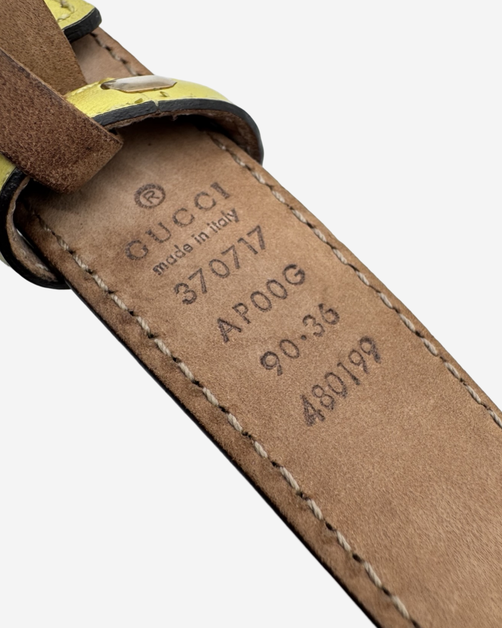 • Descripcin: Cinturn en piel color amarillo, interior en gamuza, hebilla GG caracterstica, hardware color dorado