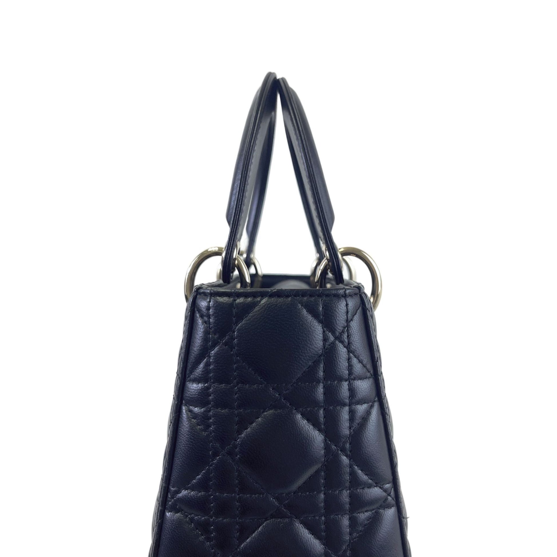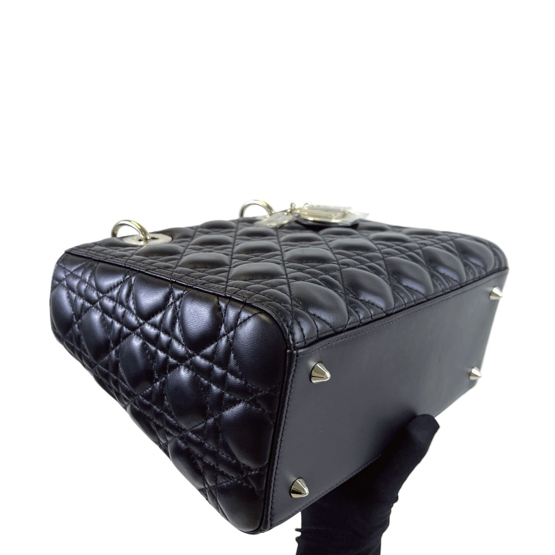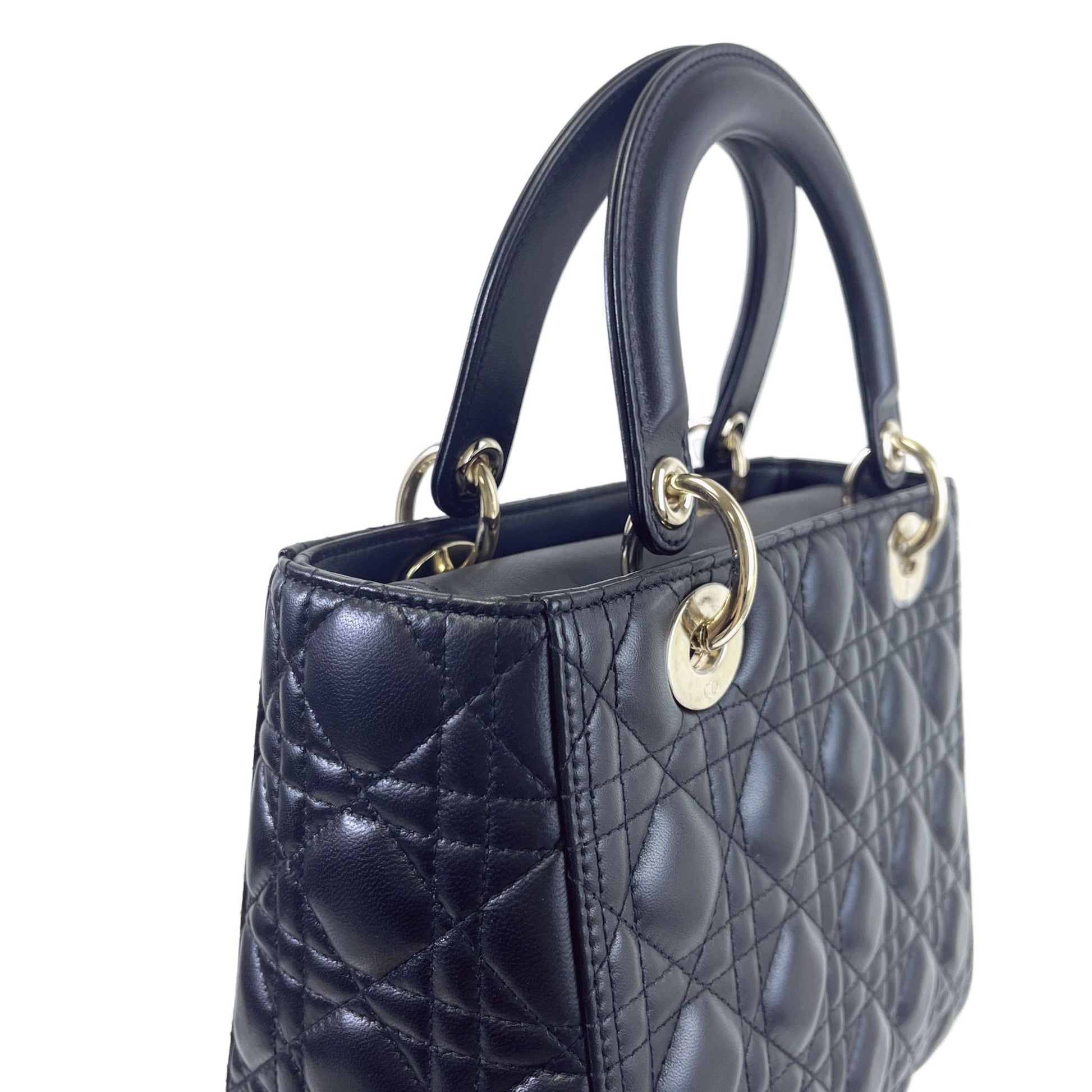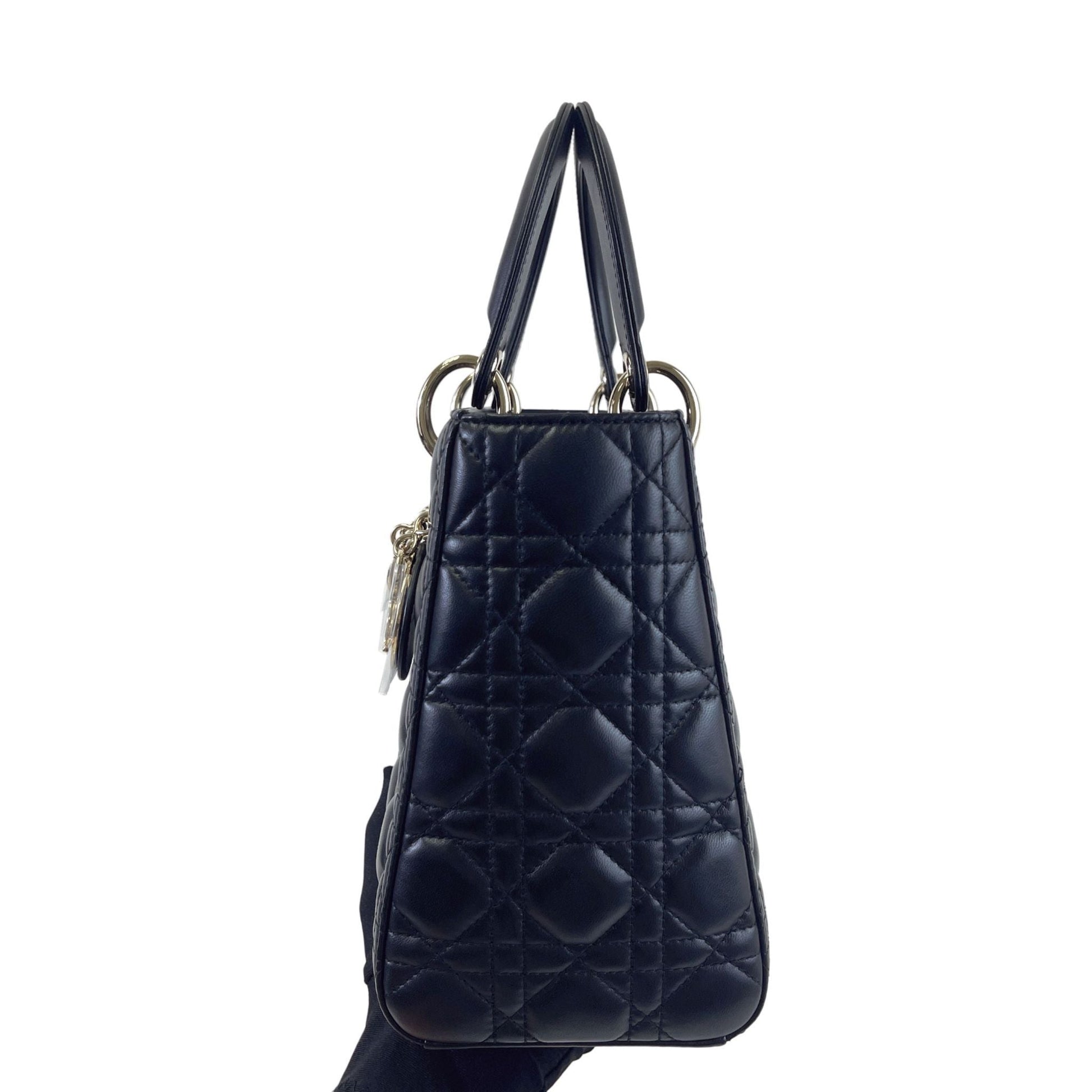 This Christian Dior Lambskin Cannage Medium Lady Dior in black is aquintessential classic bag from the house of Dior.This bag features a black lambskin leather exterior, and a convenient top flap. This classic Lady Dior Bag is an ideal day to day accessory.