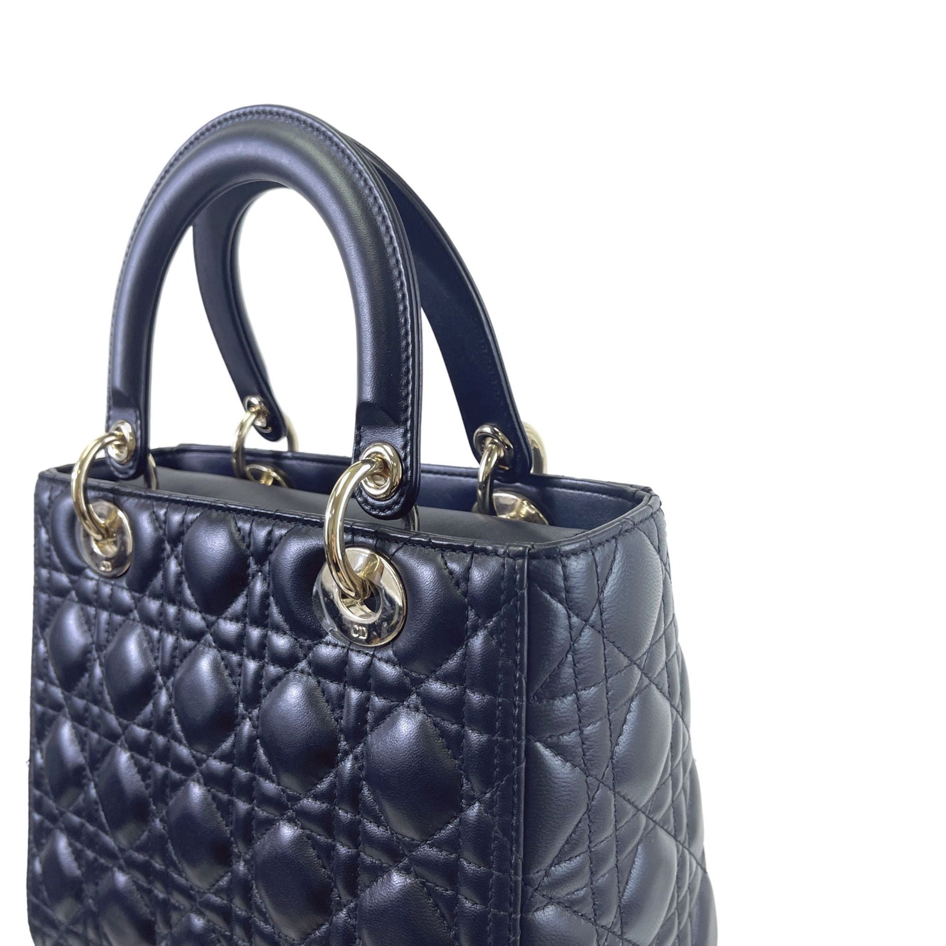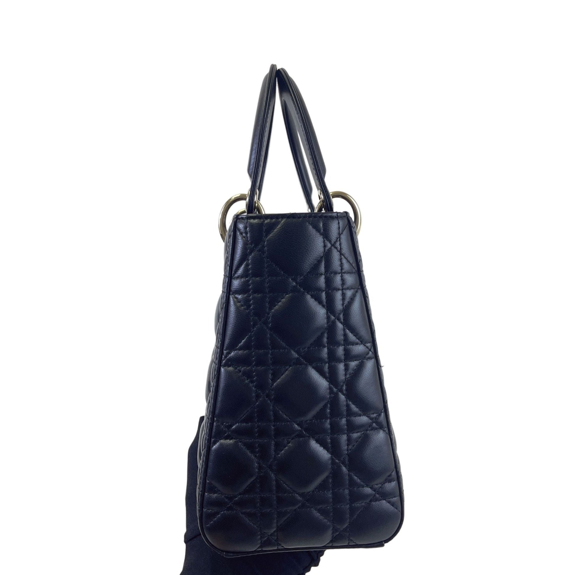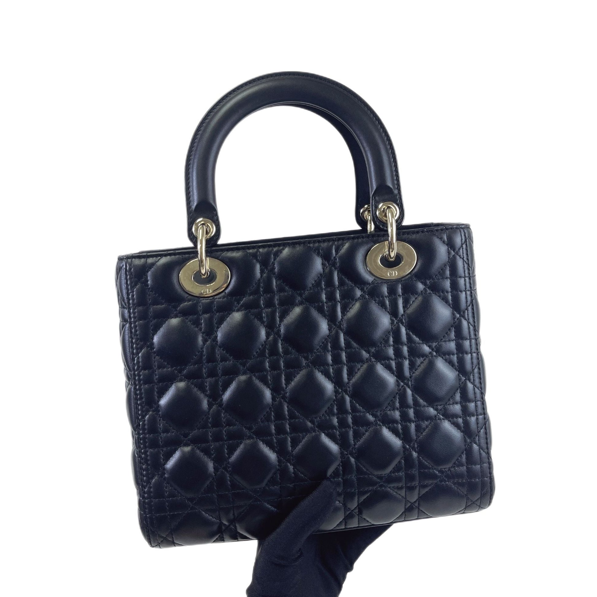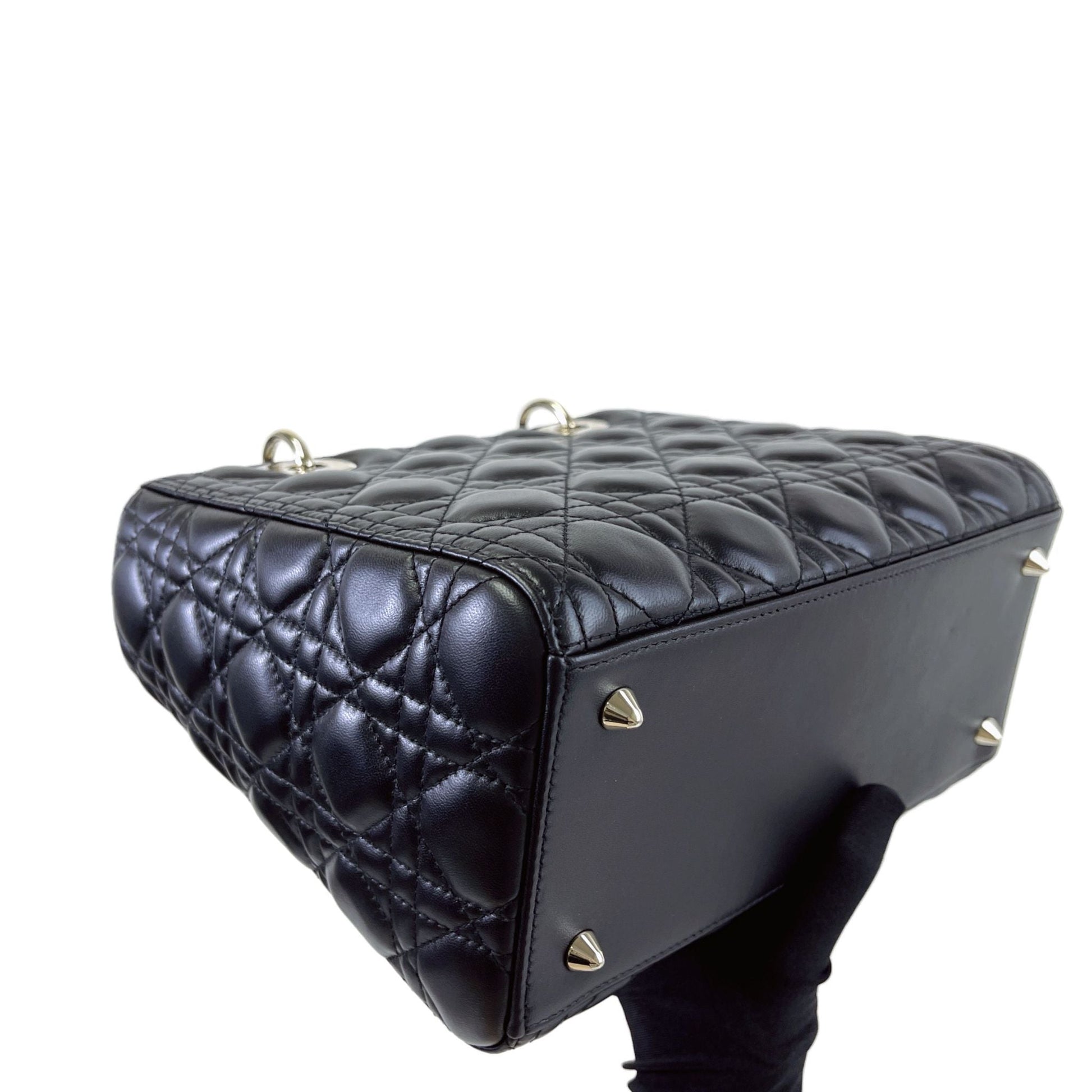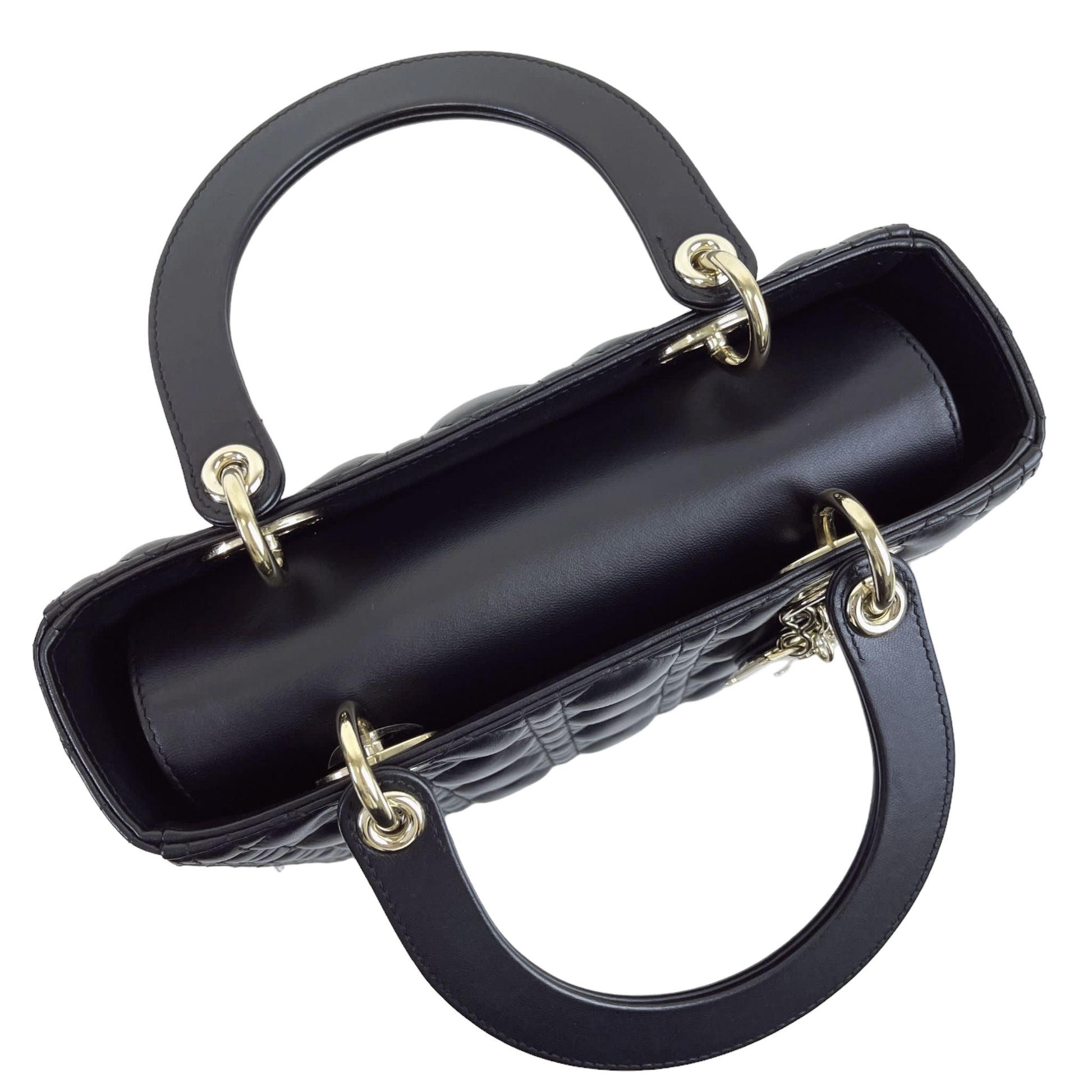 This Christian Dior Lambskin Cannage Medium Lady Dior in black is aquintessential classic bag from the house of Dior.This bag features a black lambskin leather exterior, and a convenient top flap. This classic Lady Dior Bag is an ideal day to day accessory.