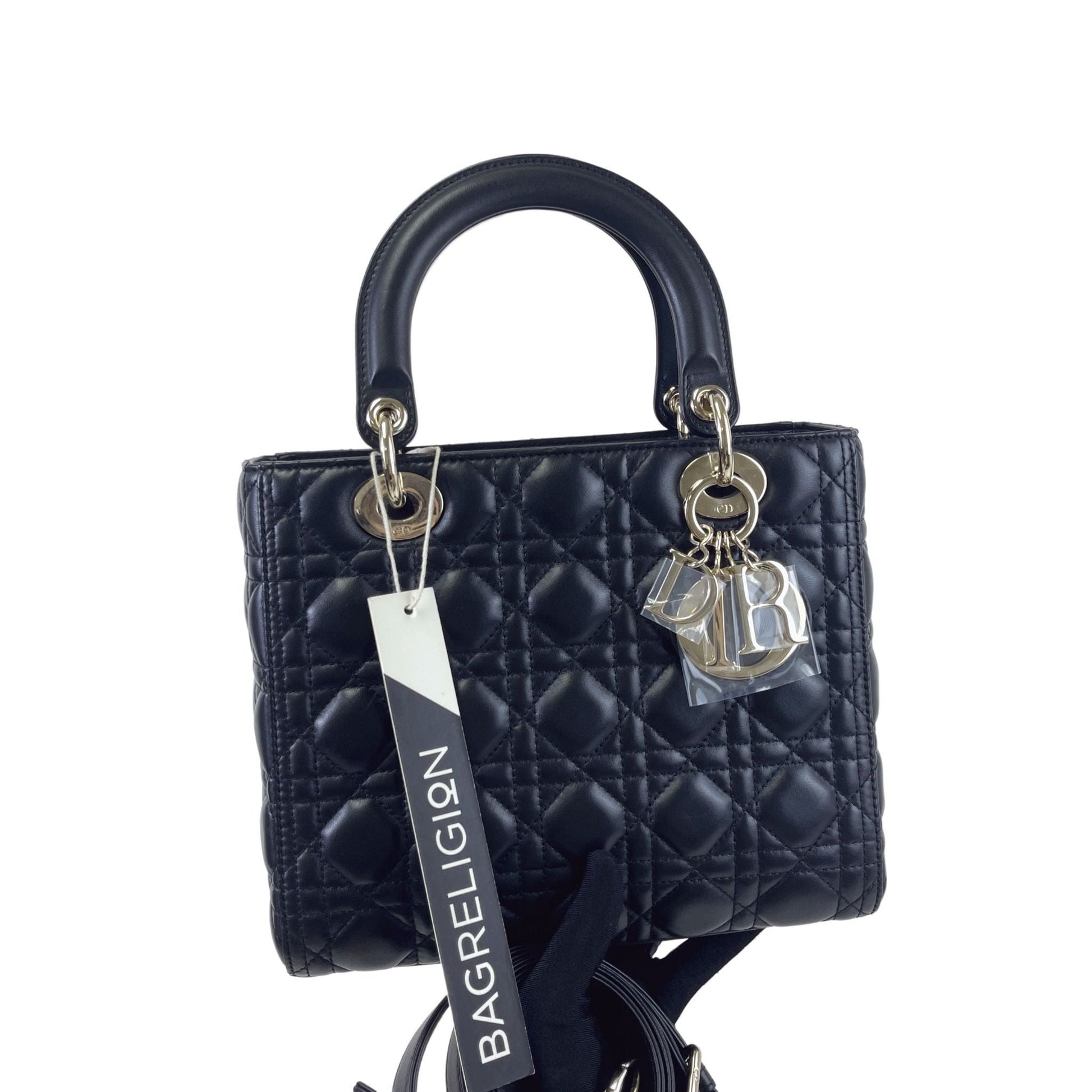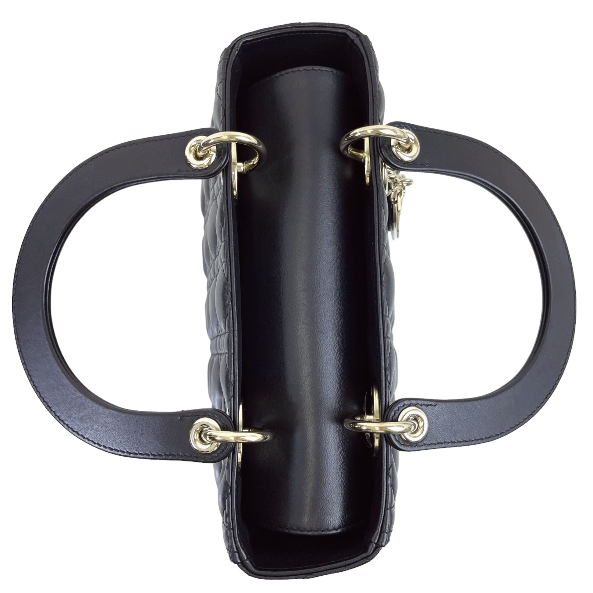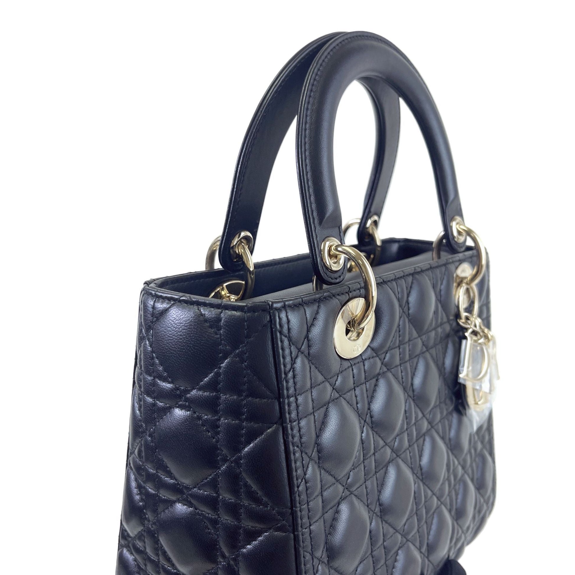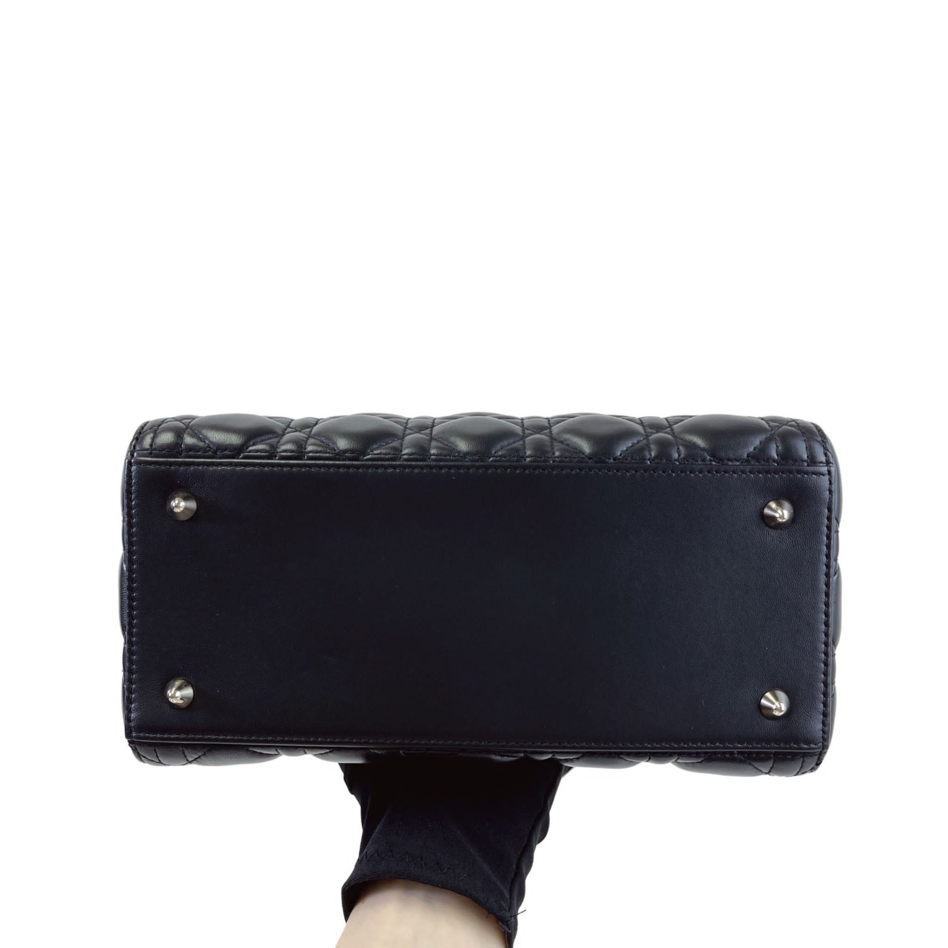This Christian Dior Lambskin Cannage Medium Lady Dior in black is aquintessential classic bag from the house of Dior.This bag features a black lambskin leather exterior, and a convenient top flap. This classic Lady Dior Bag is an ideal day to day accessory.