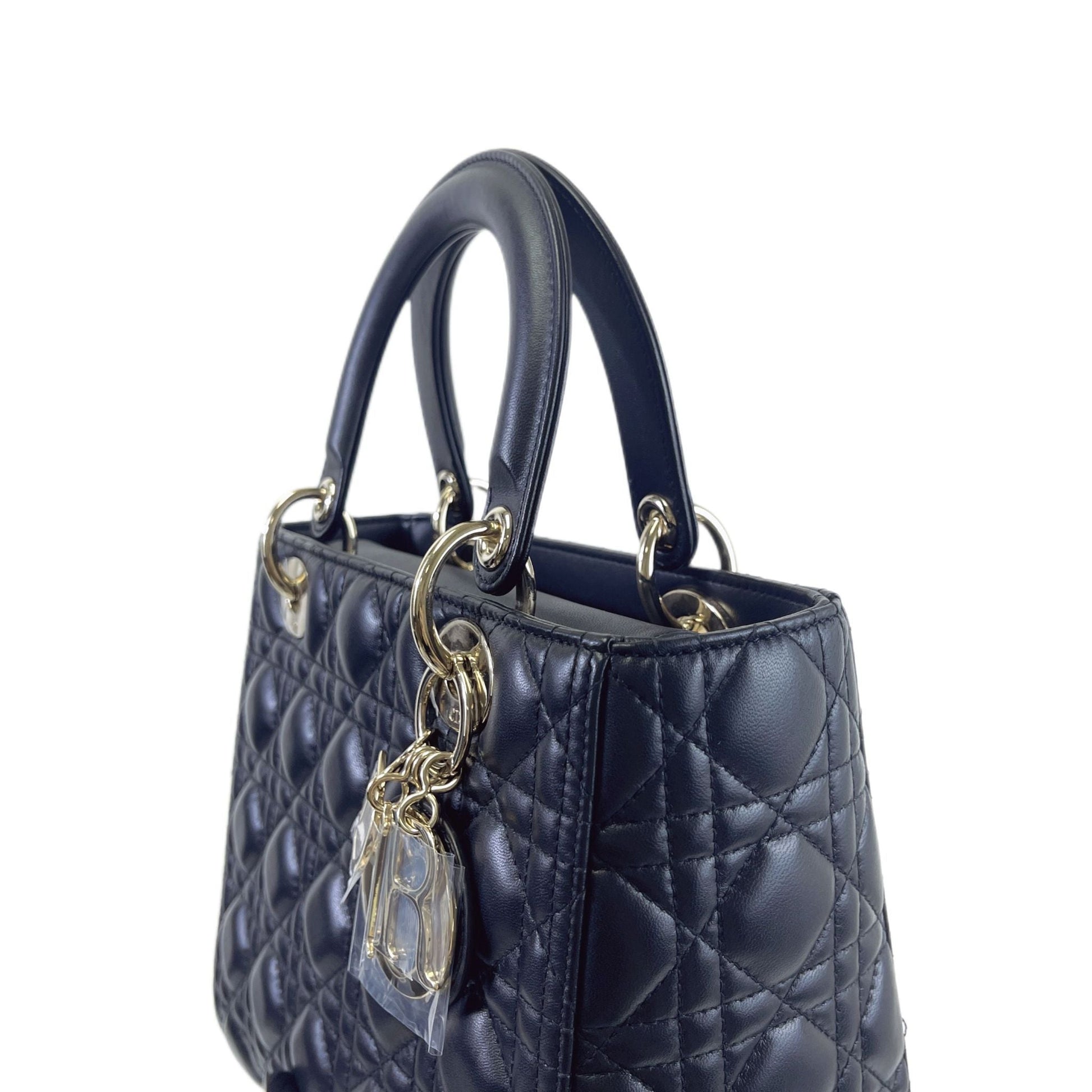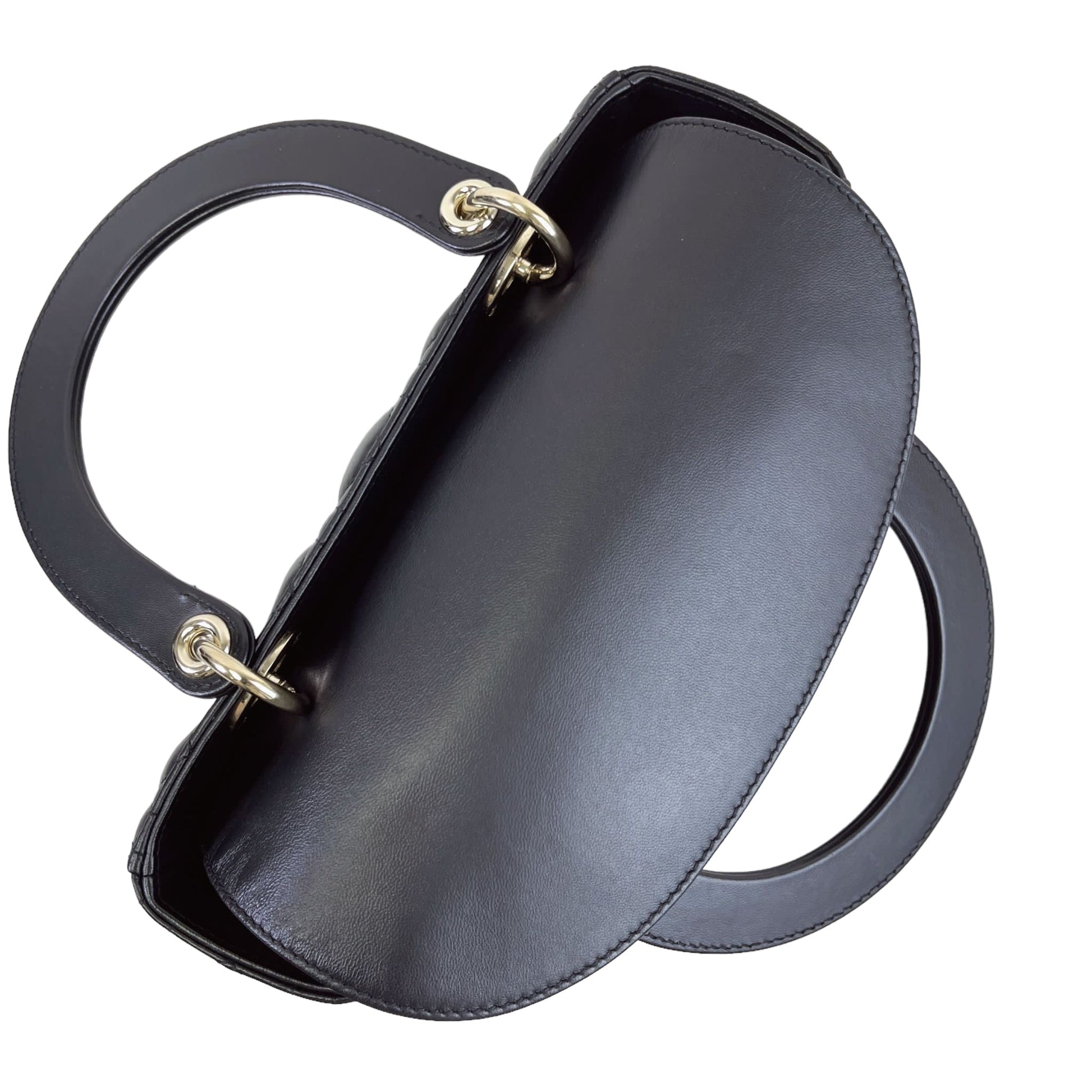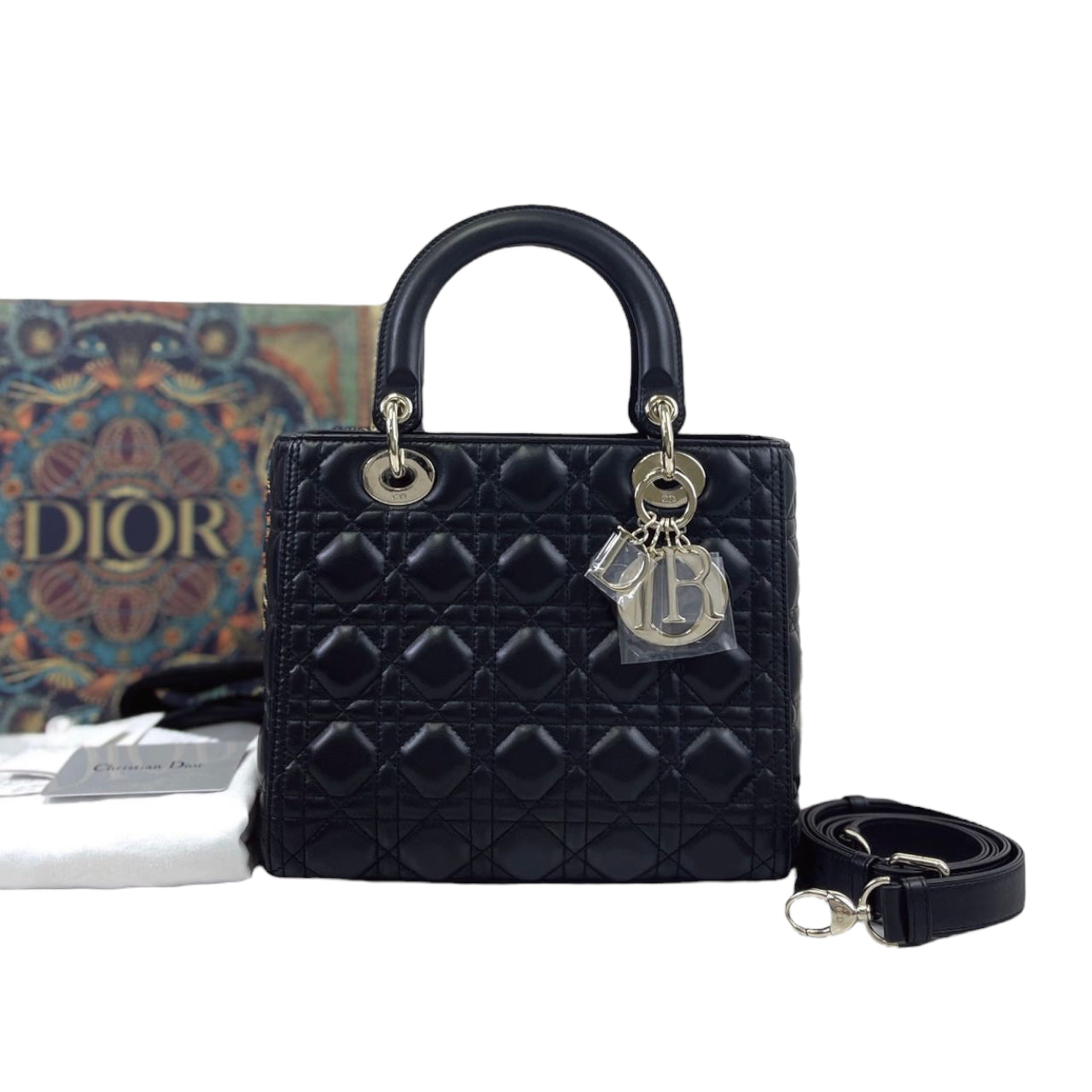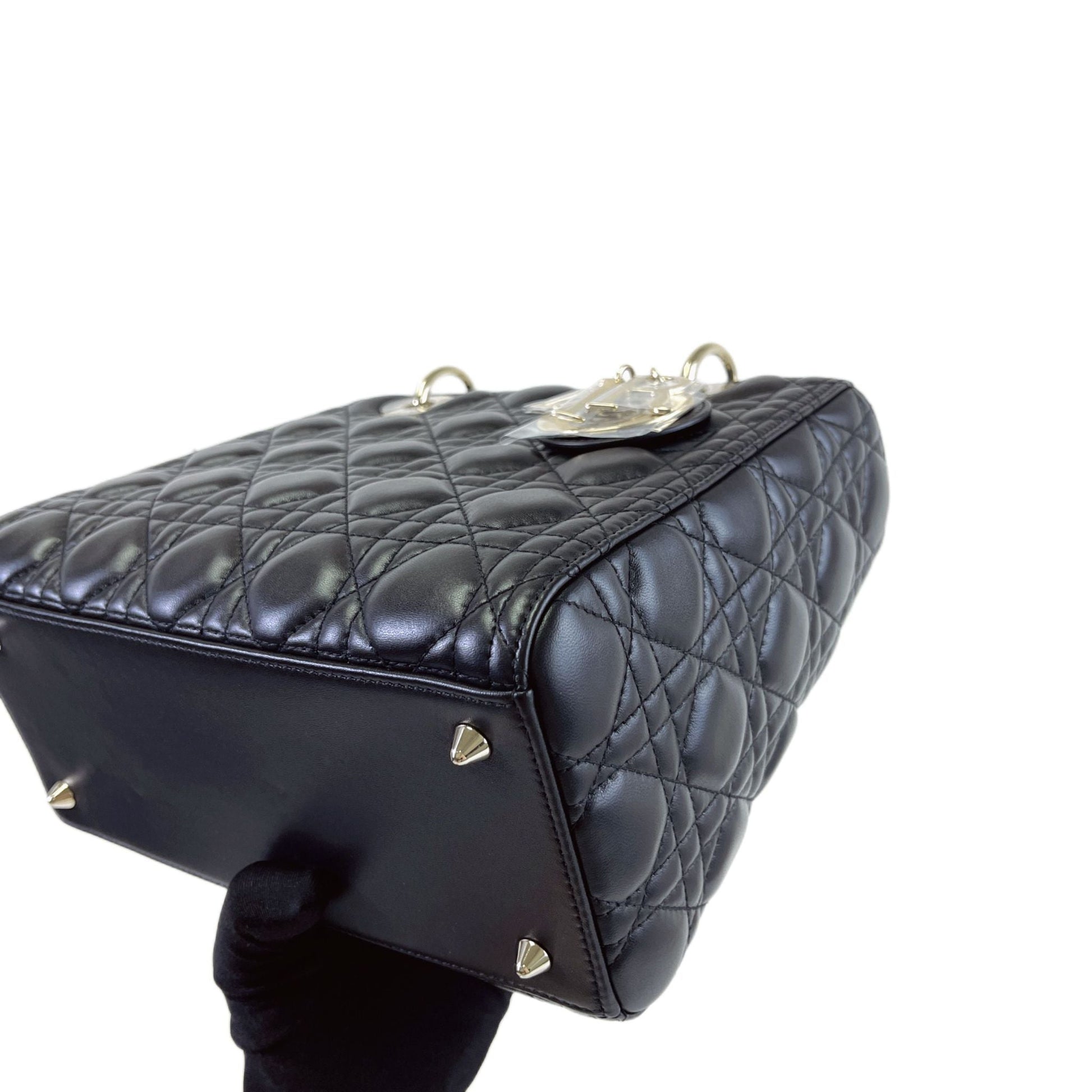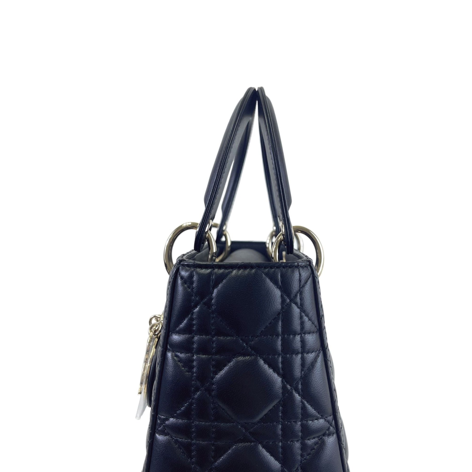 This Christian Dior Lambskin Cannage Medium Lady Dior in black is aquintessential classic bag from the house of Dior.This bag features a black lambskin leather exterior, and a convenient top flap. This classic Lady Dior Bag is an ideal day to day accessory.