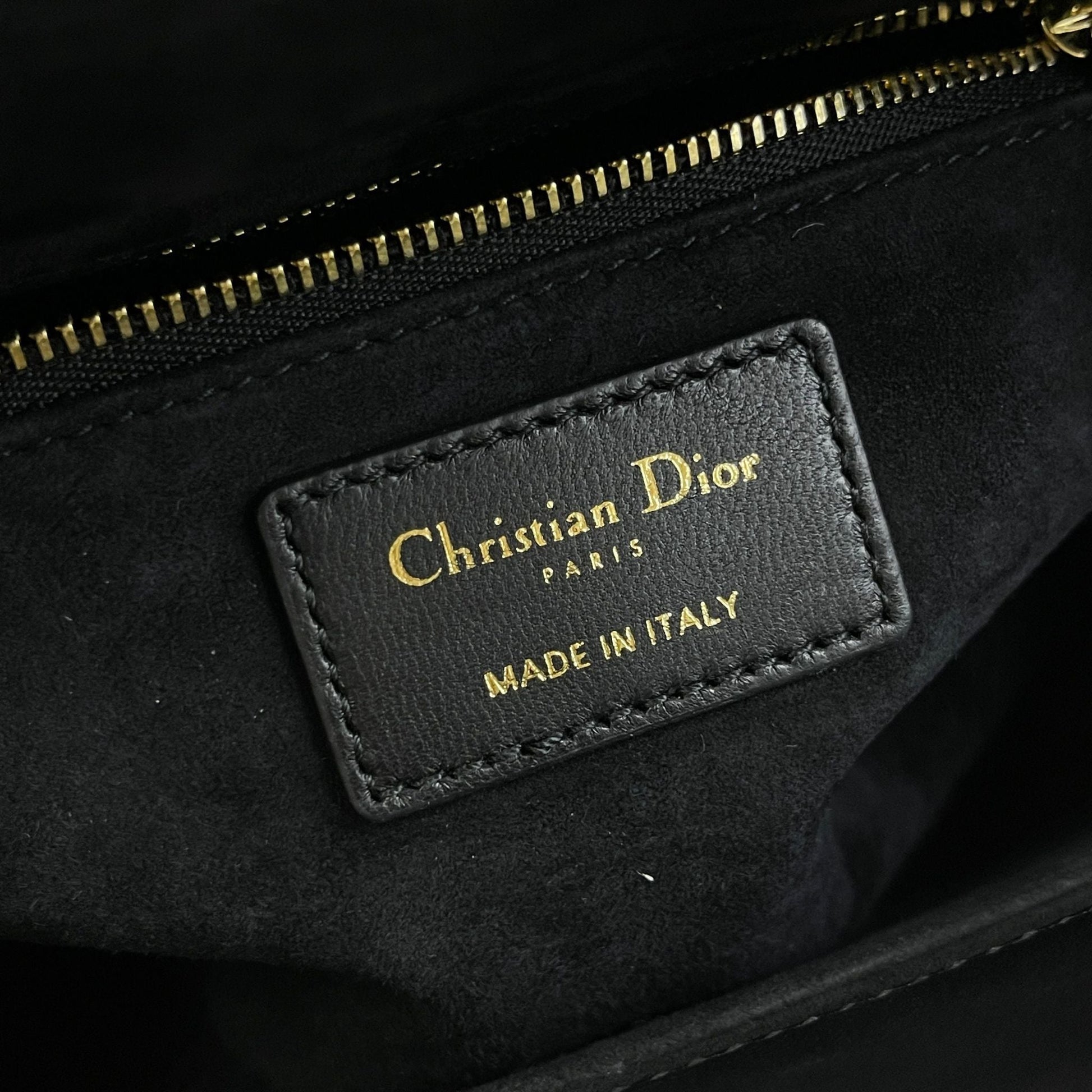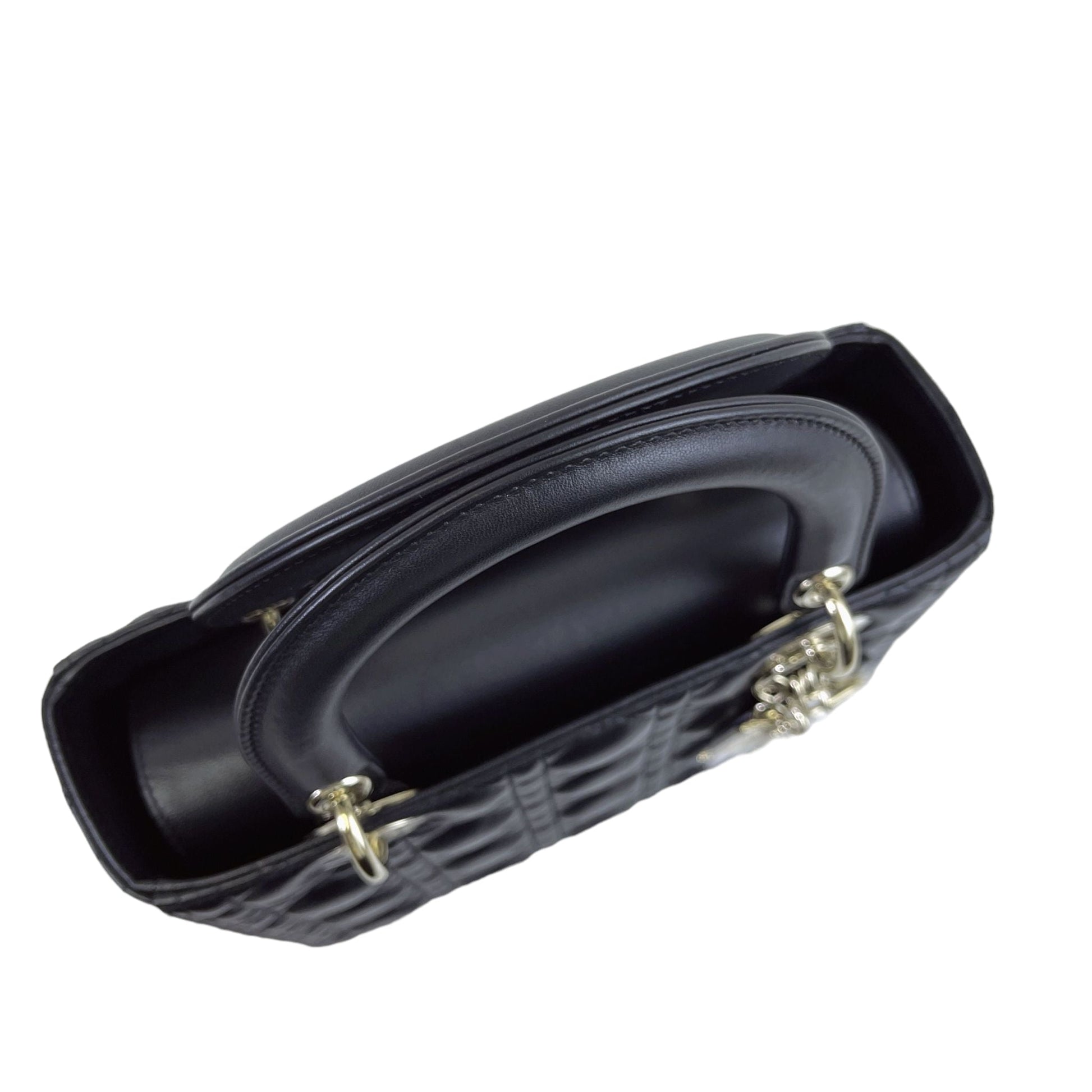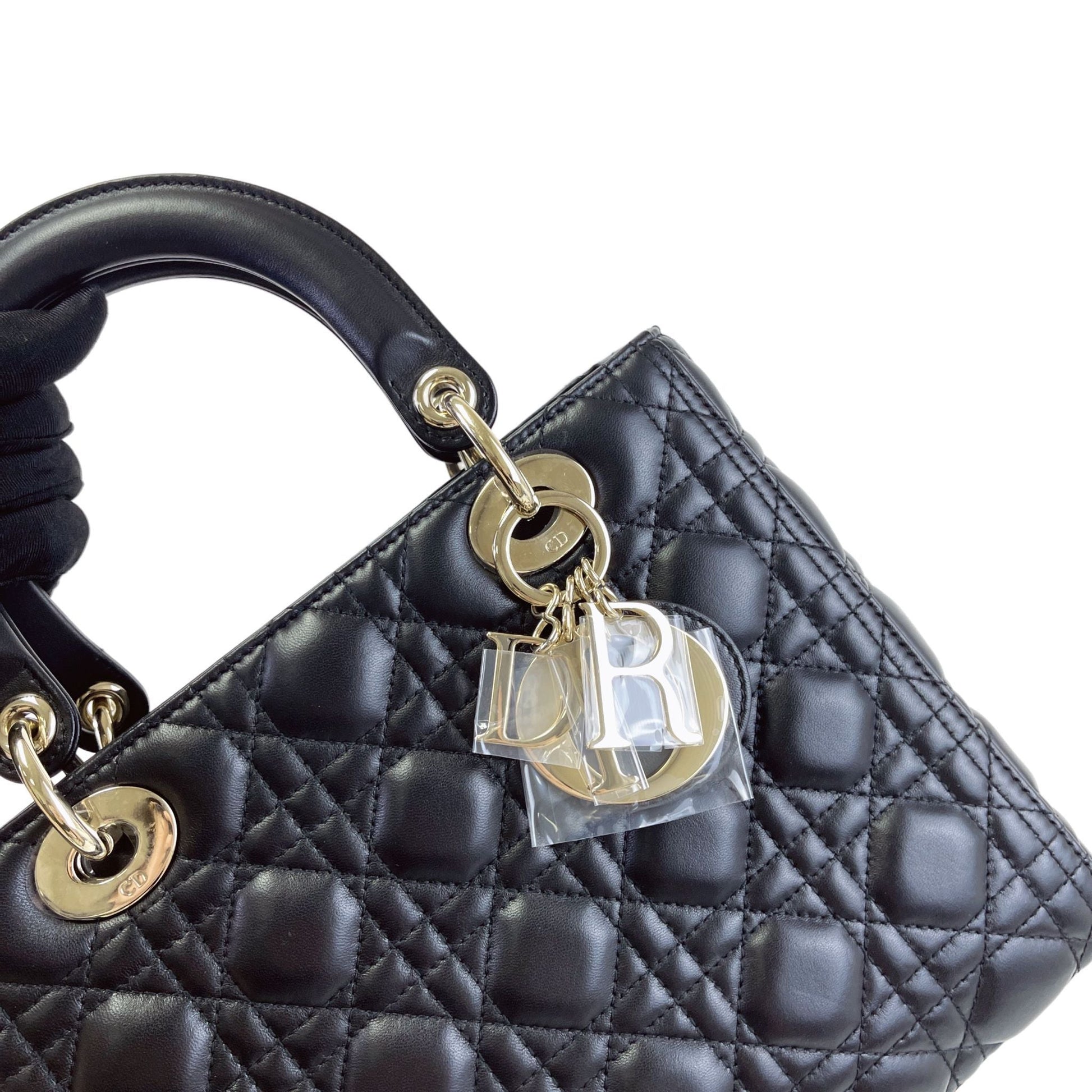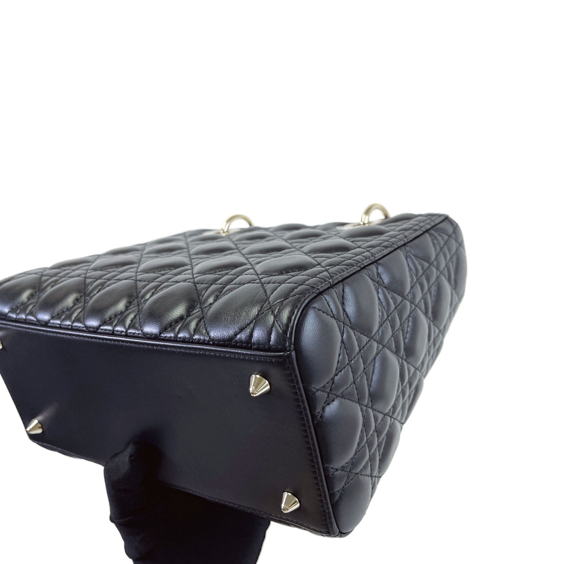 This Christian Dior Lambskin Cannage Medium Lady Dior in black is aquintessential classic bag from the house of Dior.This bag features a black lambskin leather exterior, and a convenient top flap. This classic Lady Dior Bag is an ideal day to day accessory.