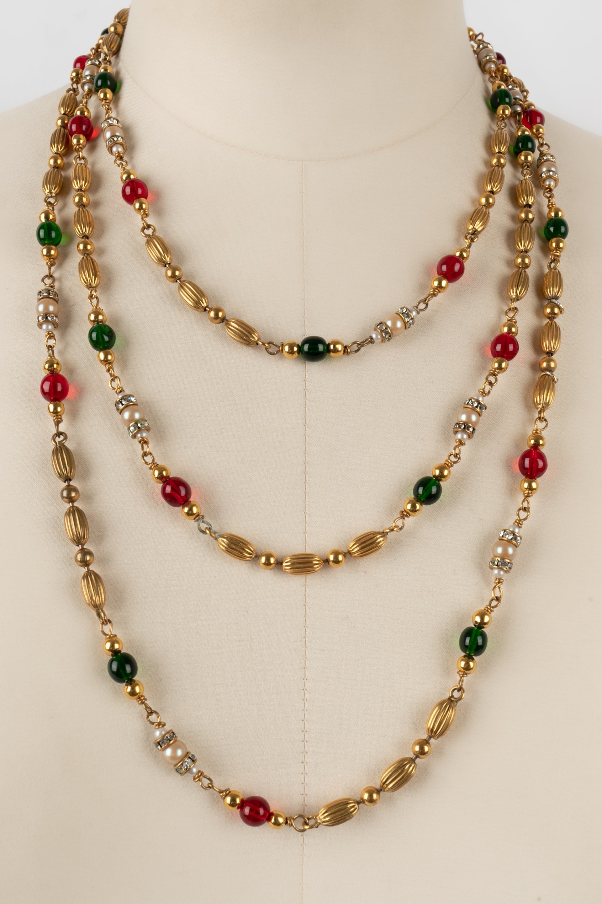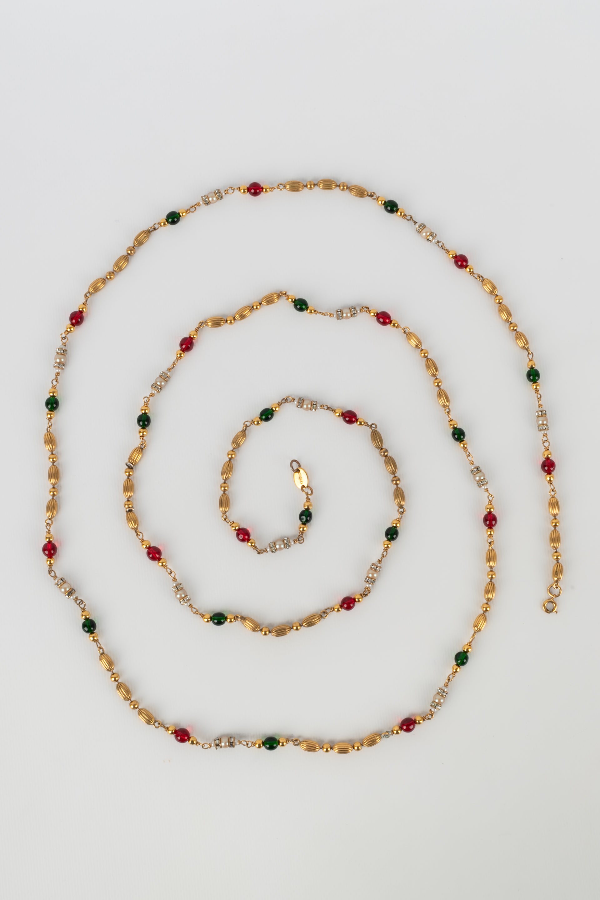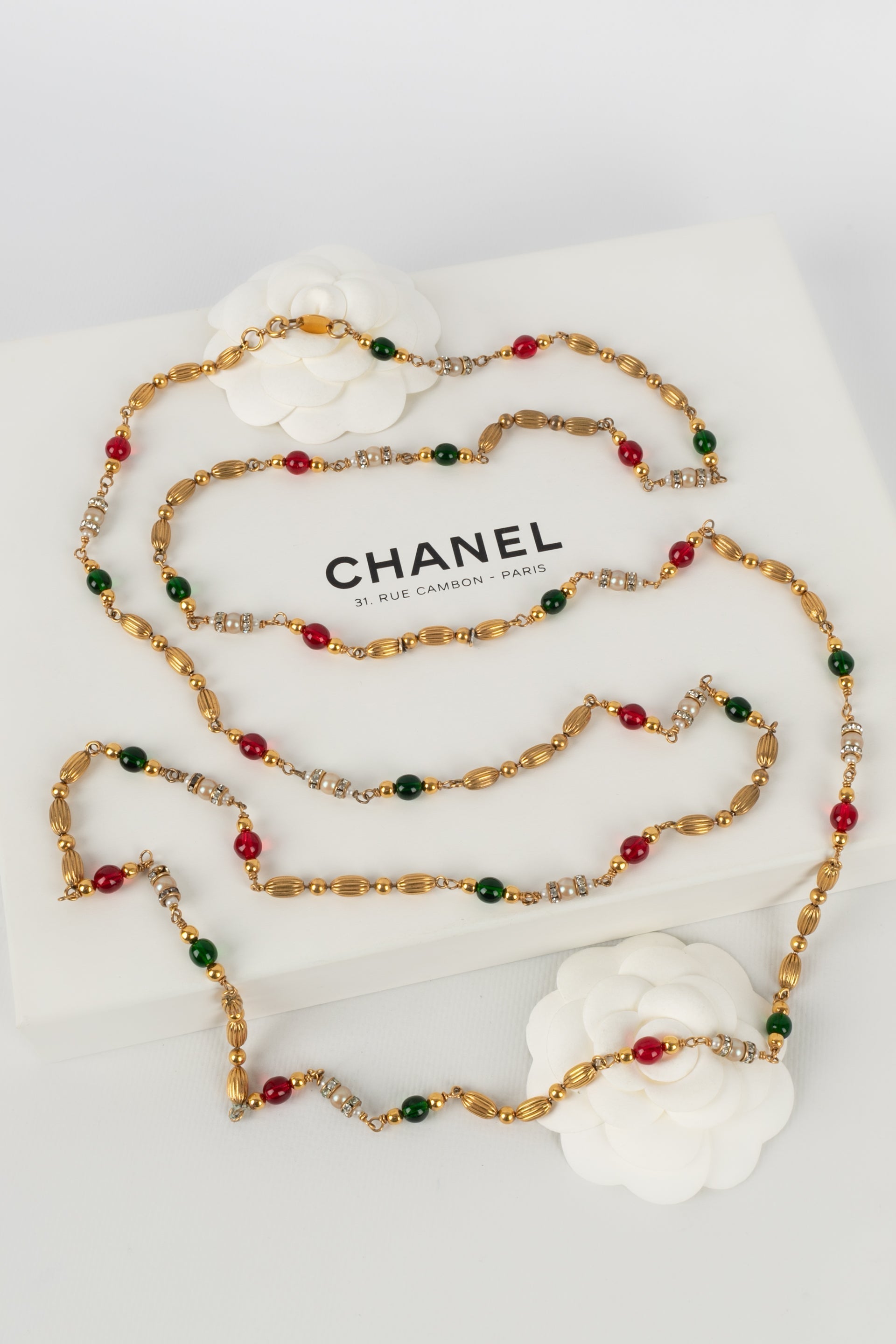 CHANEL - (Made in France) Sautoir en mtal dor compos de perles mtalliques, de rondelles de strass et de perles de verre dans les tons rouge, vert et nacr. Bijou datant des annes 1960.