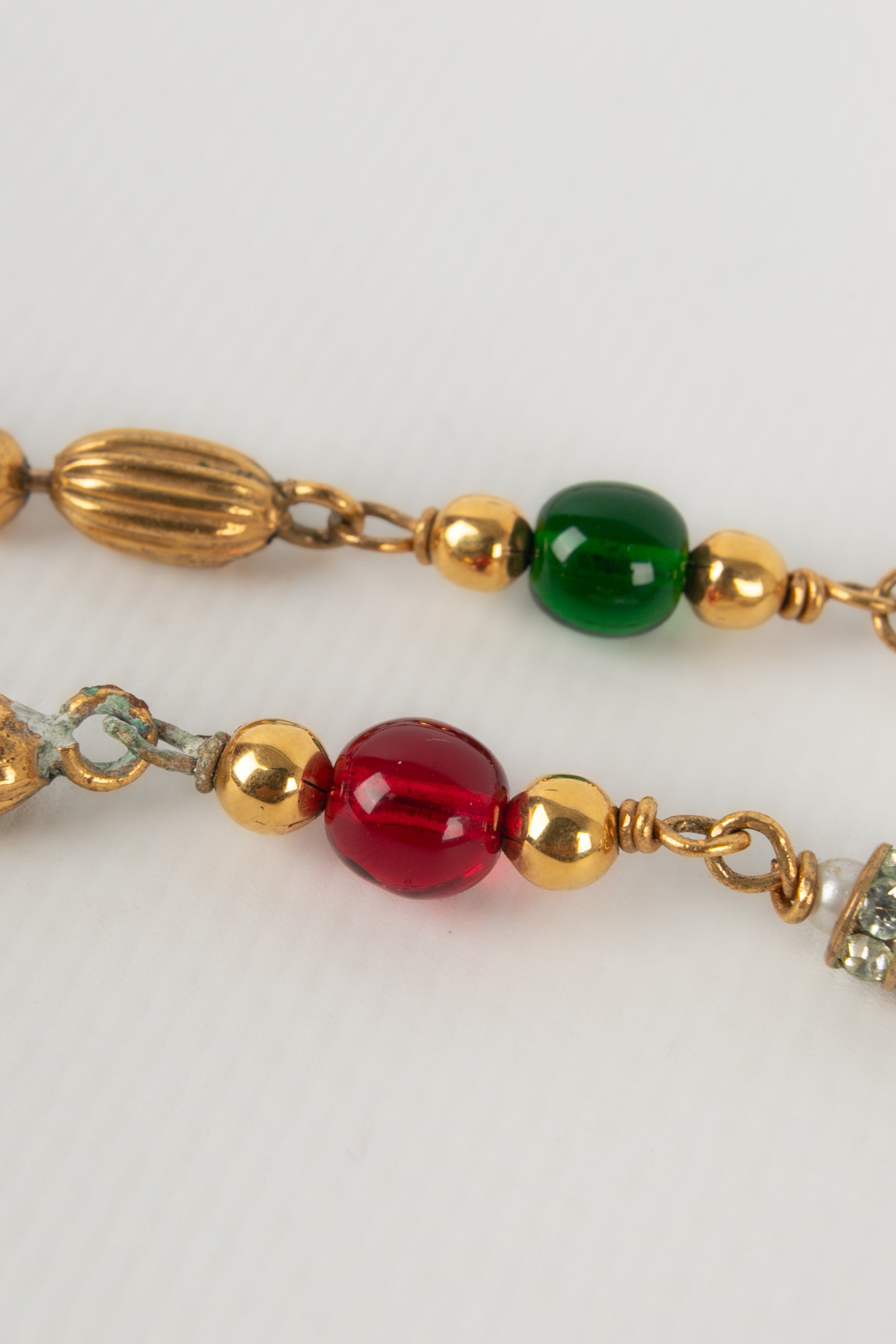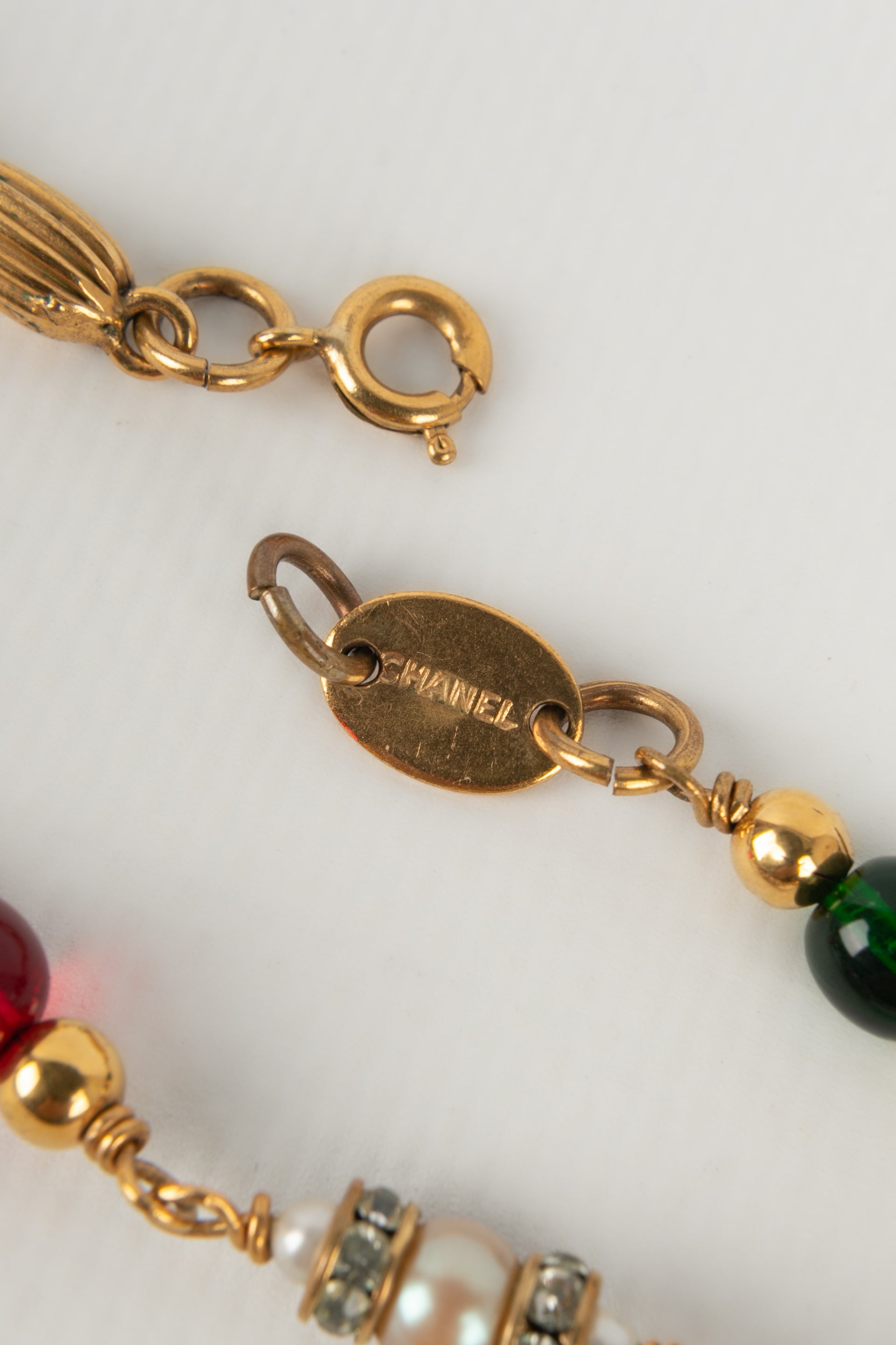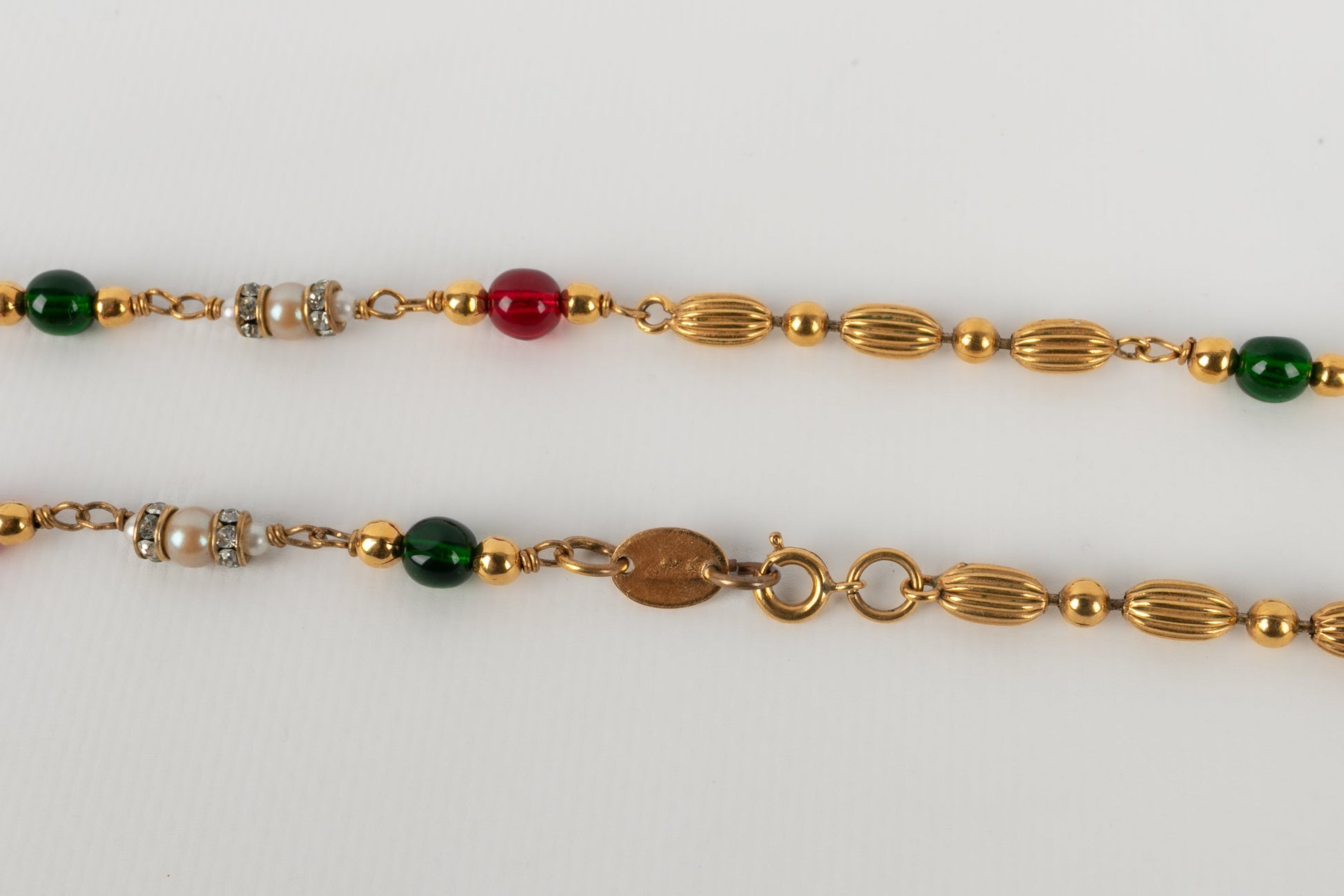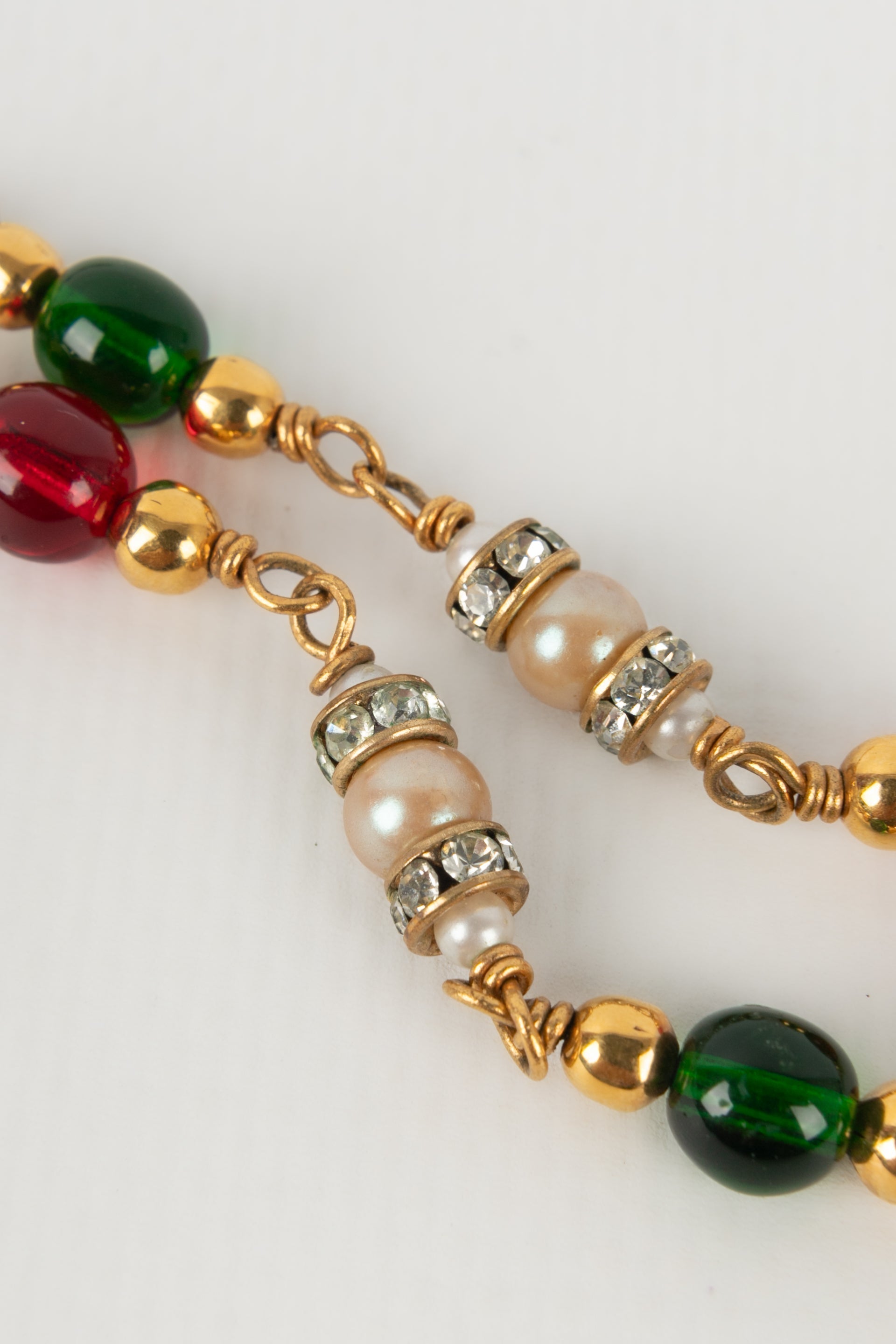 CHANEL - (Made in France) Sautoir en mtal dor compos de perles mtalliques, de rondelles de strass et de perles de verre dans les tons rouge, vert et nacr. Bijou datant des annes 1960.