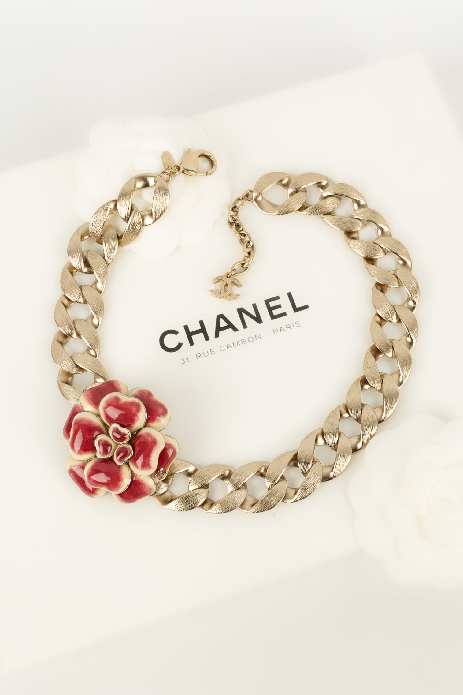 CHANEL - (Made in France) Collier en mtal dor clair compos d'une chane gourmette et d'un camlia maill. Collection Automne-Hiver 2008.