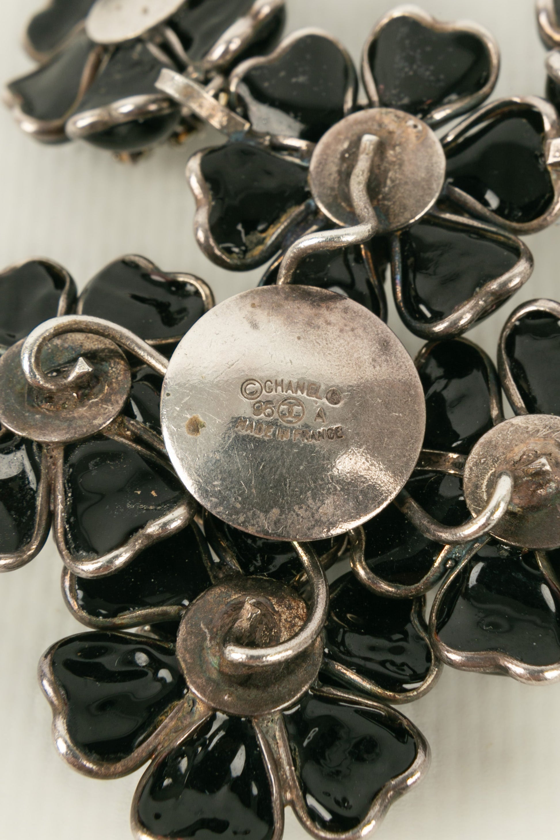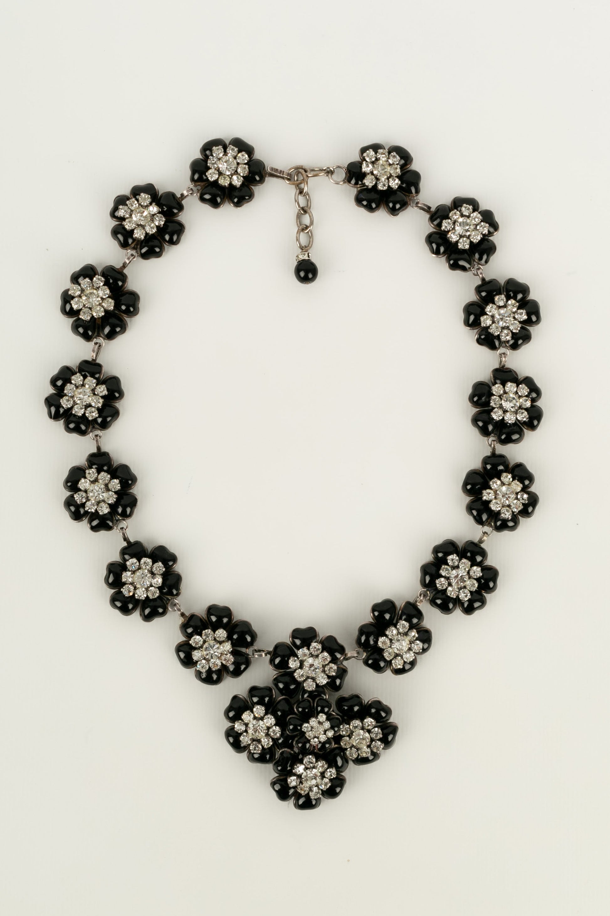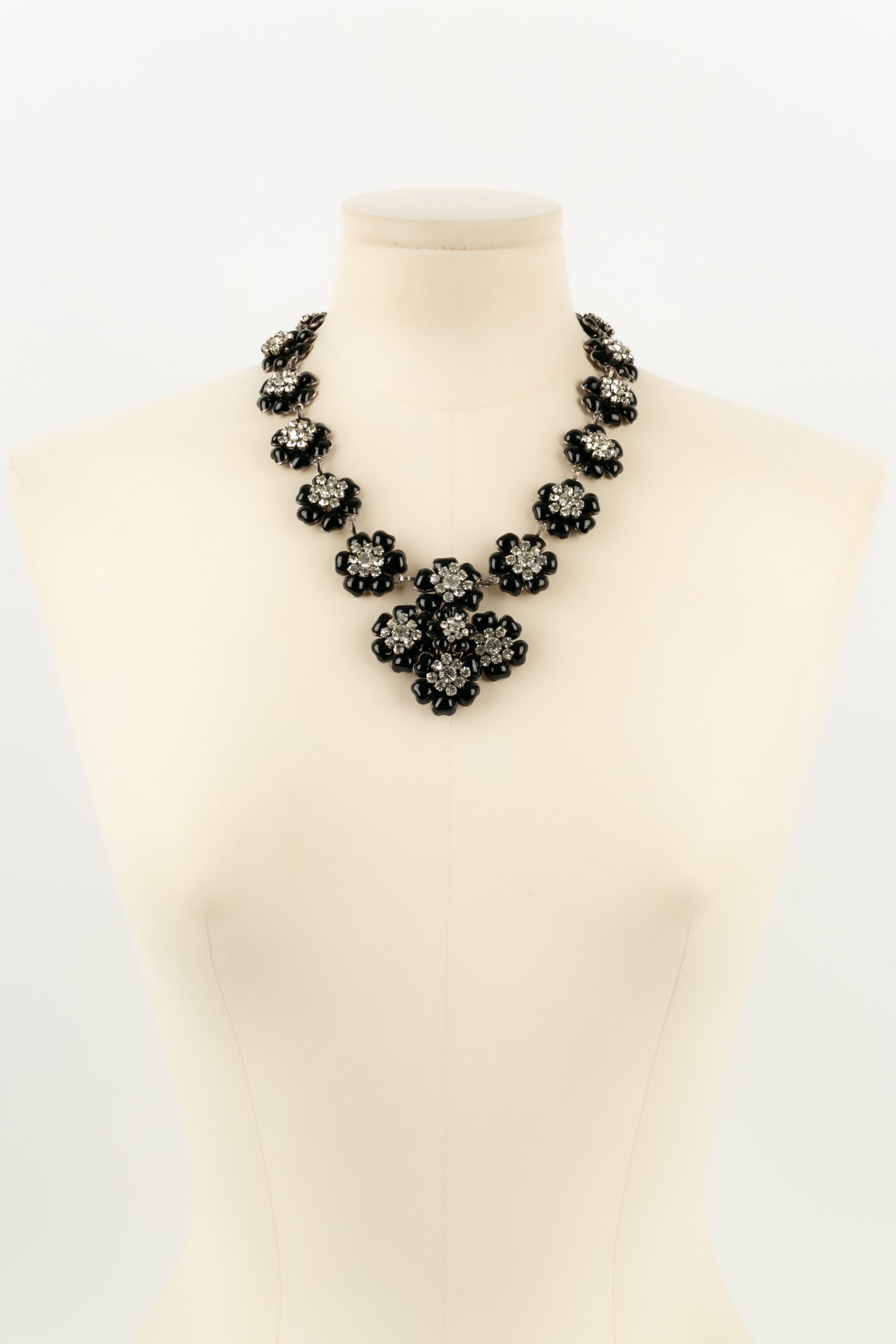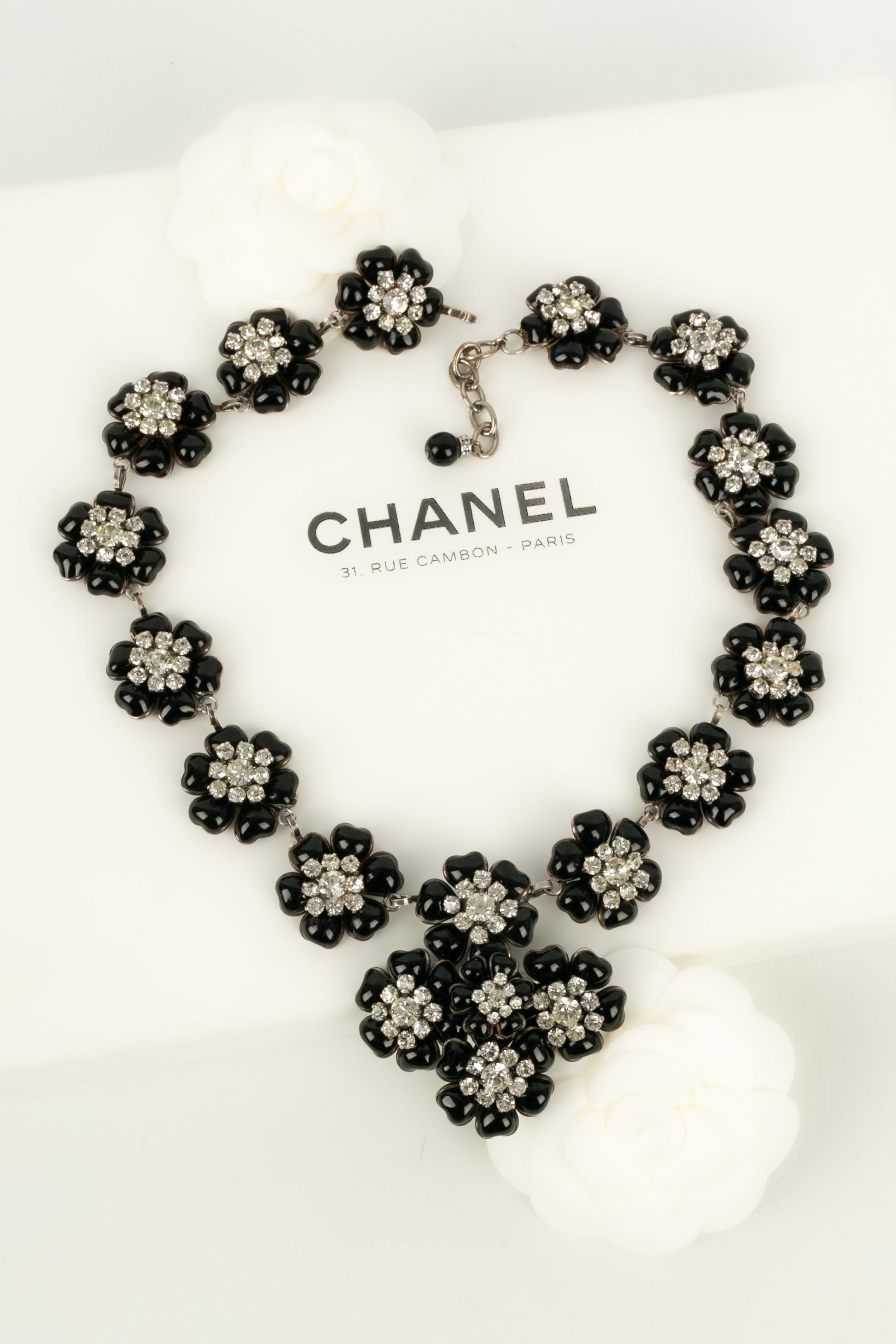 CHANEL - (Made in France) Collier en mtal argent et camlias en pte de verre pavs de strass. Collection Automne-Hiver 1995. Travail de l'atelier Gripoix pour la maison Chanel.