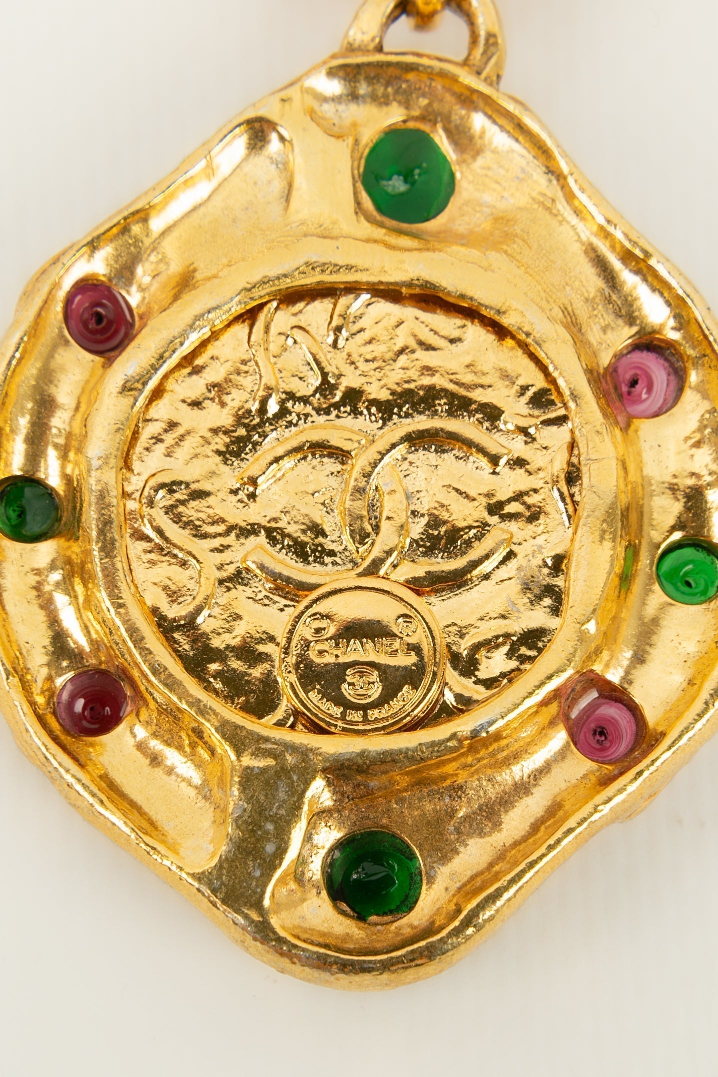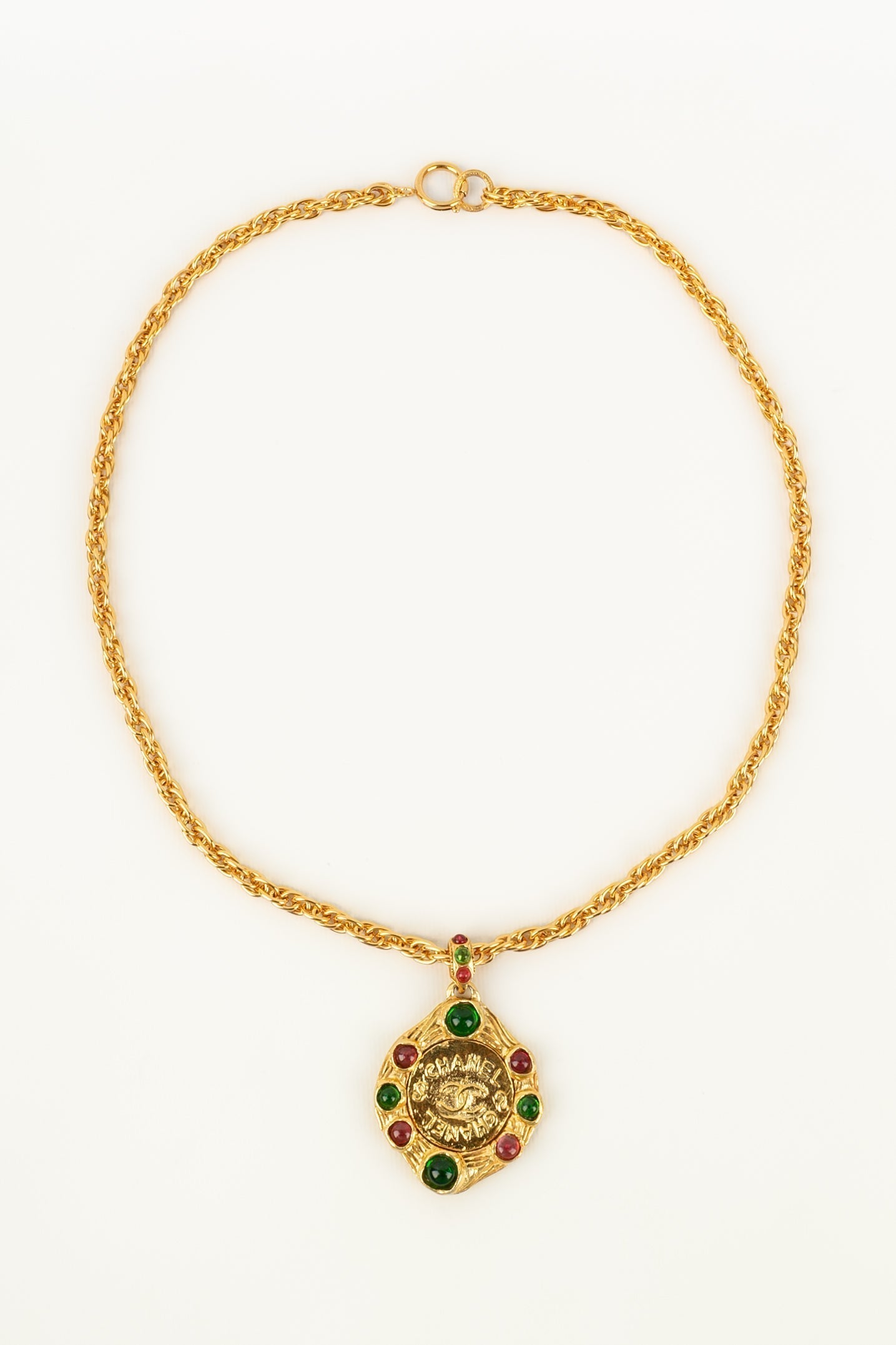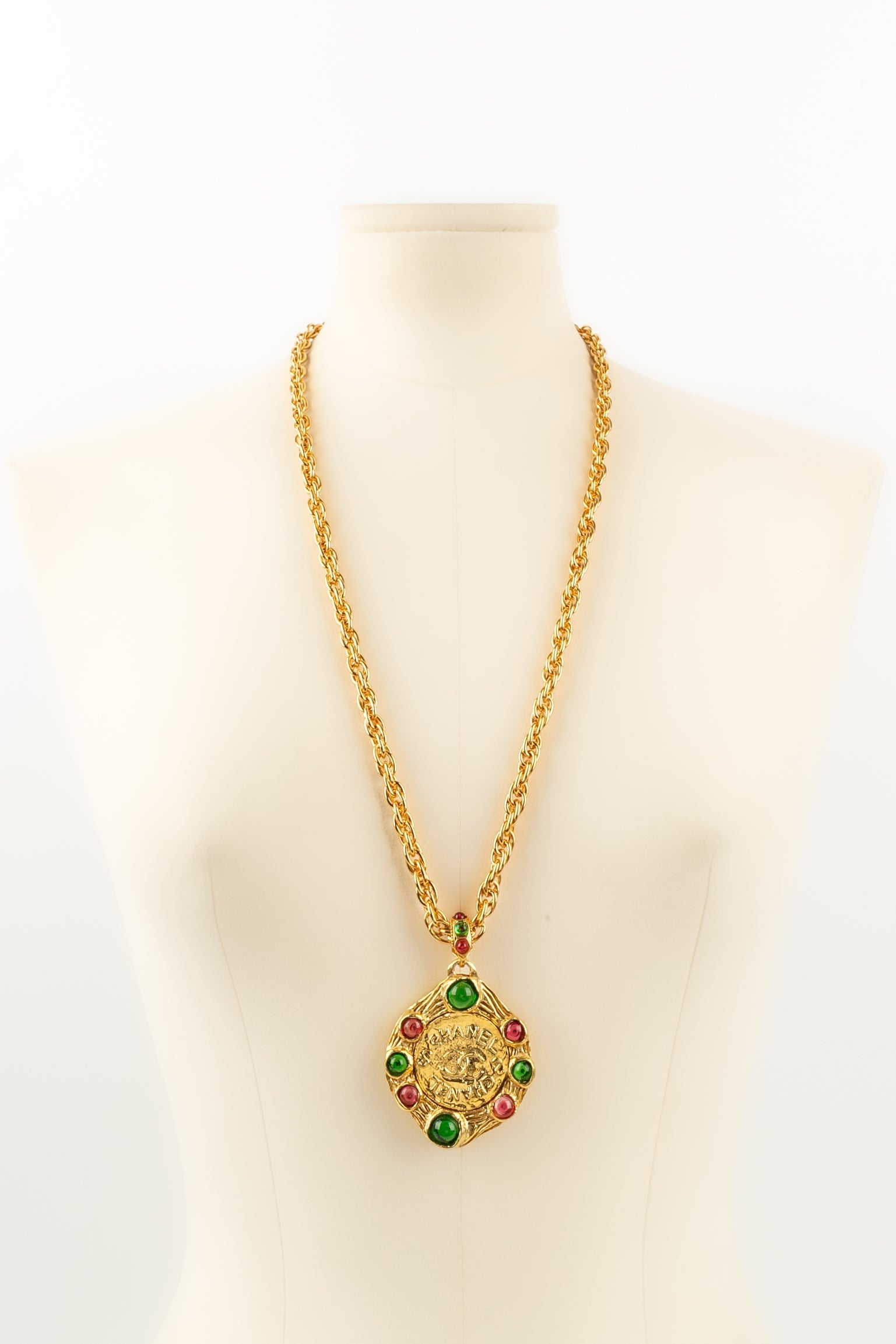 CHANEL - (Made in France) Collier pendentif en mtal dor et cabochons en pte de verre.