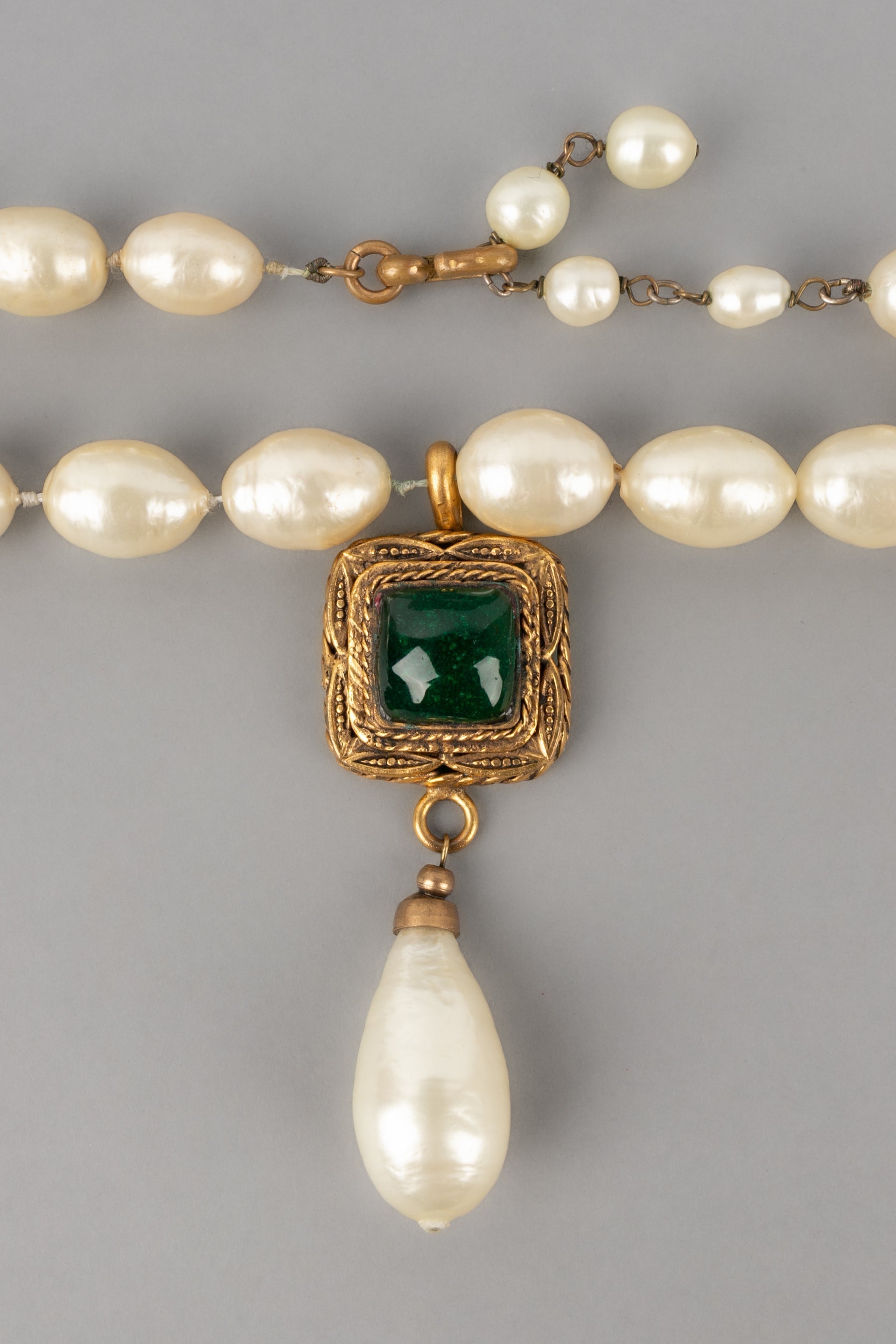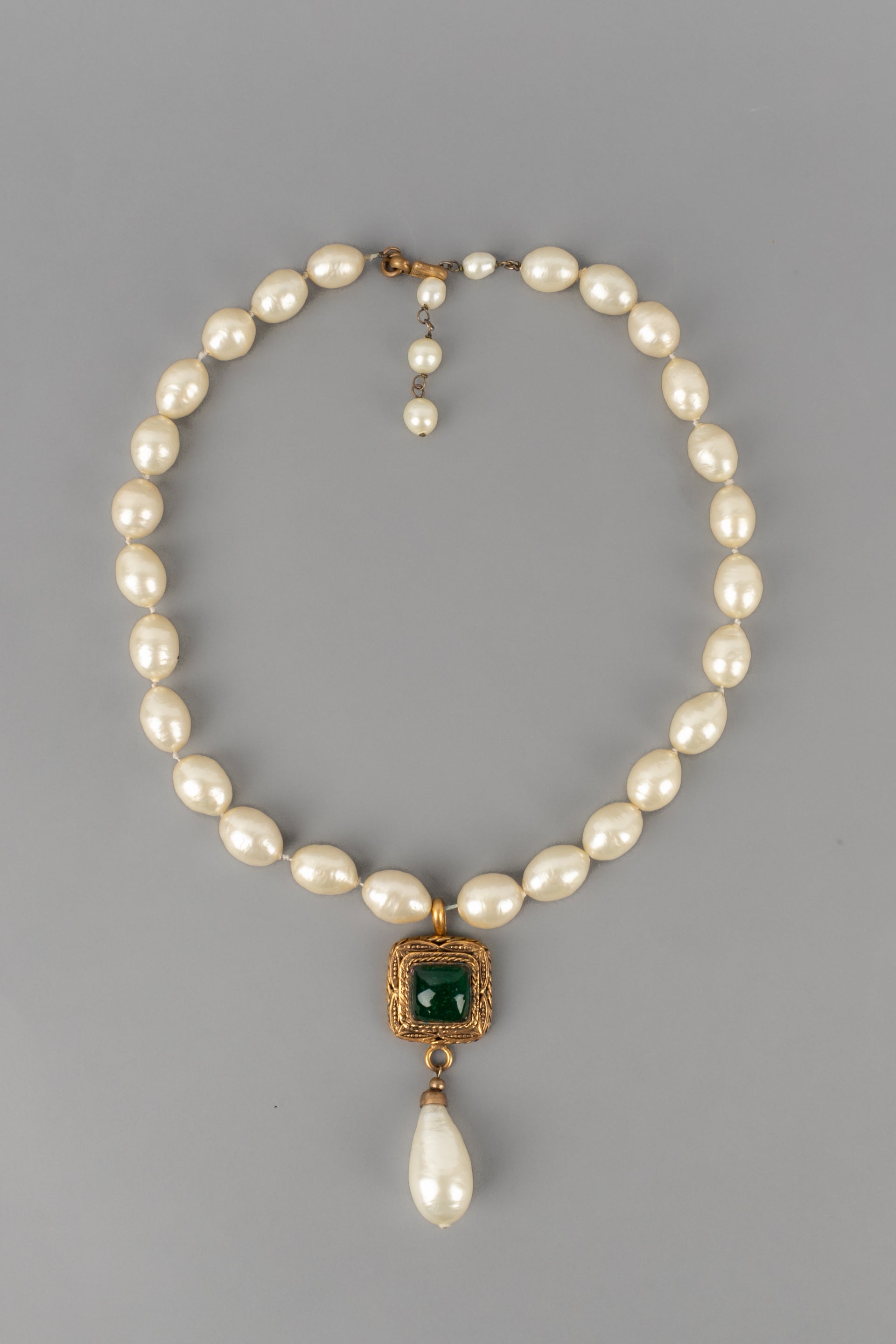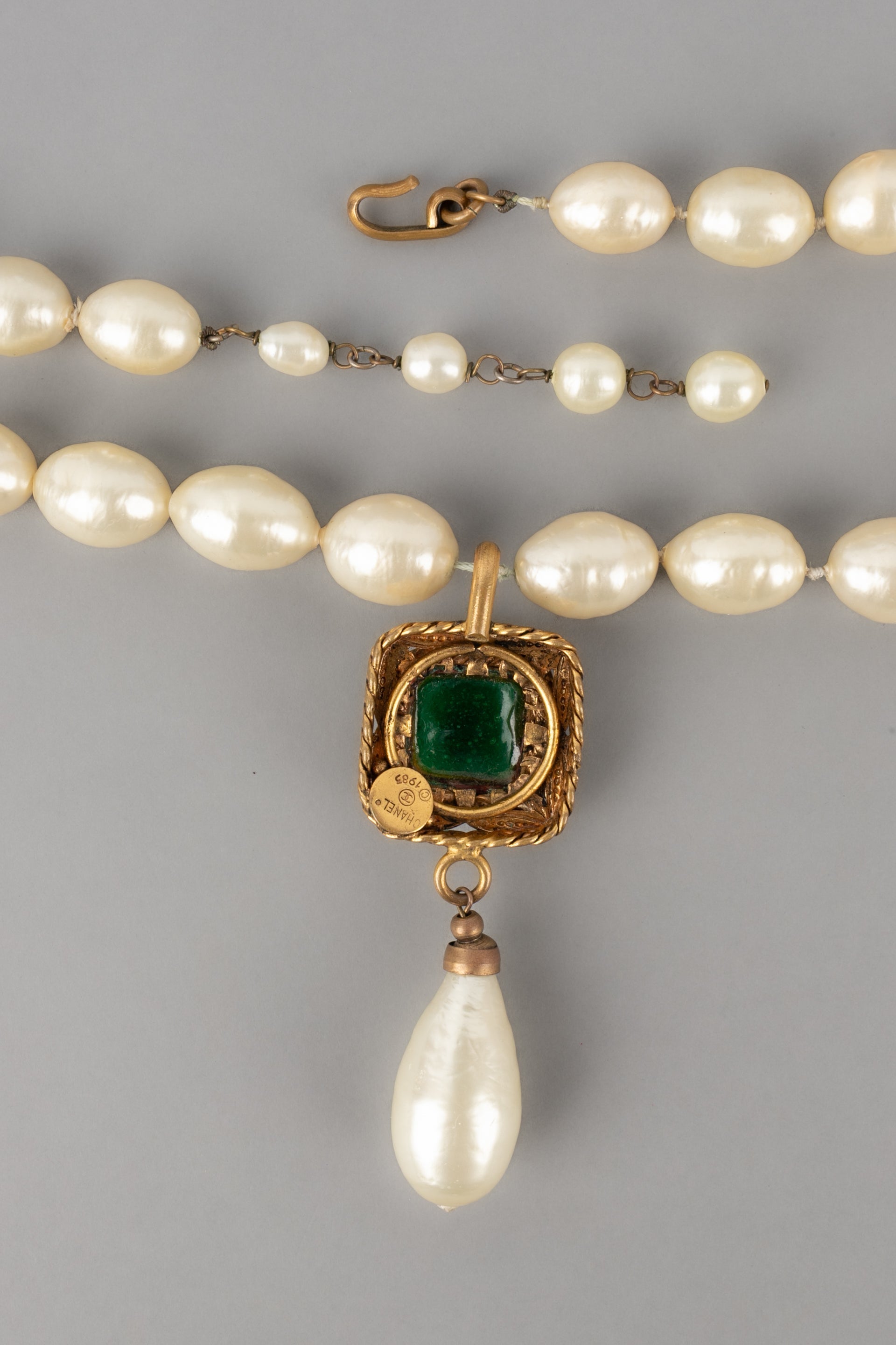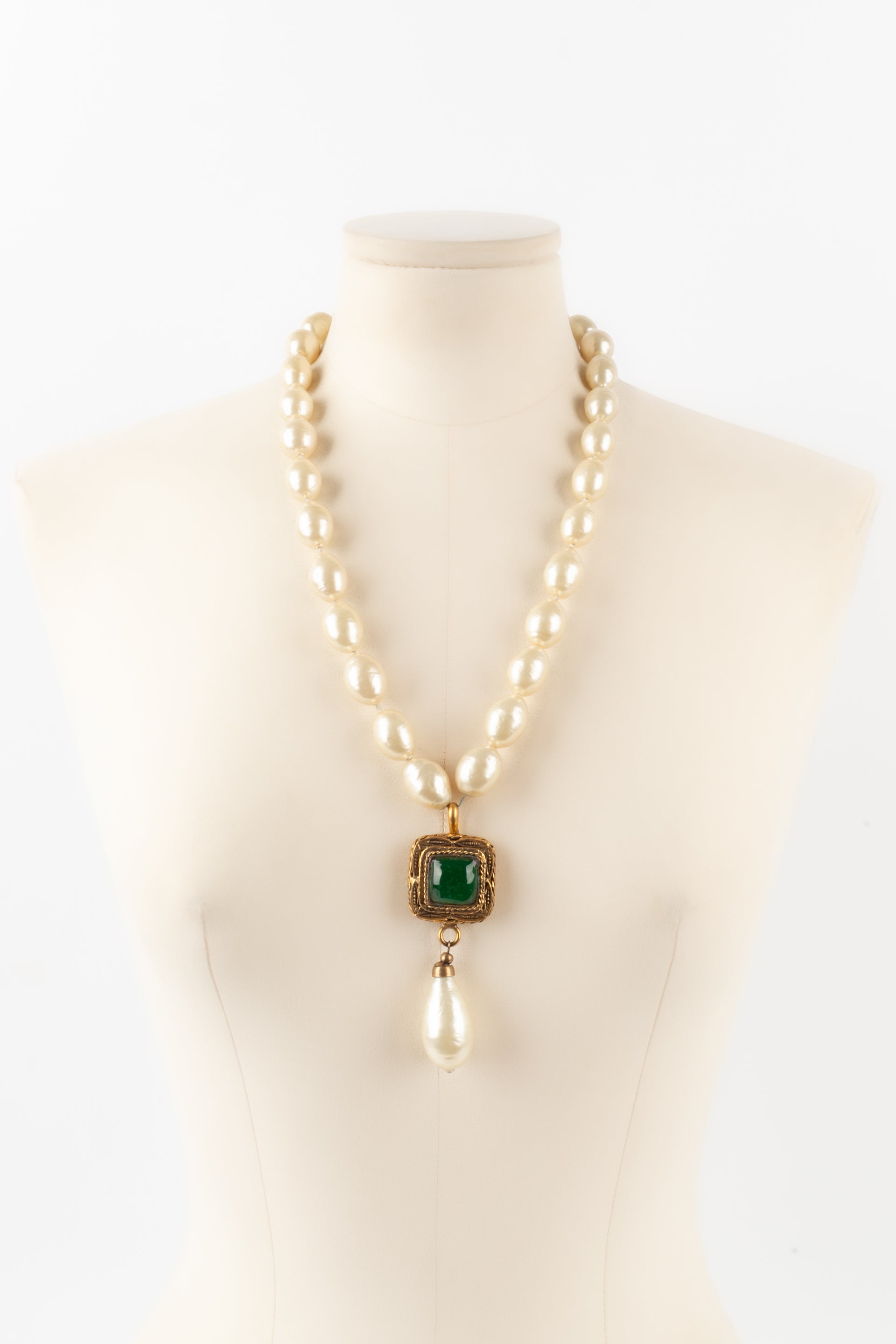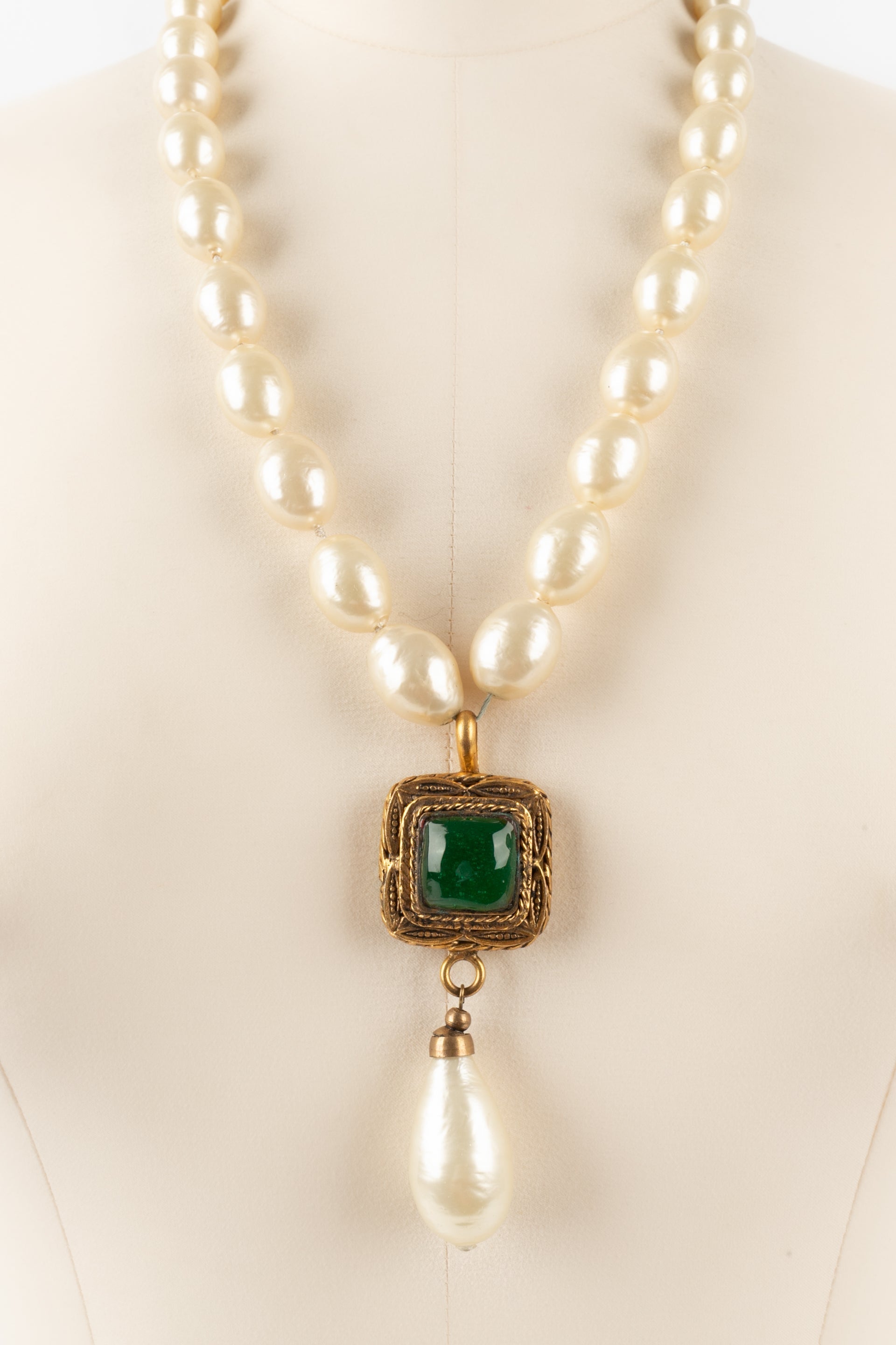CHANEL - Collier de perles de nacres fantaisies et pendentif en mtal dor et. pte de verre verte retenant une imposante goutte nacre. Collection 1983.