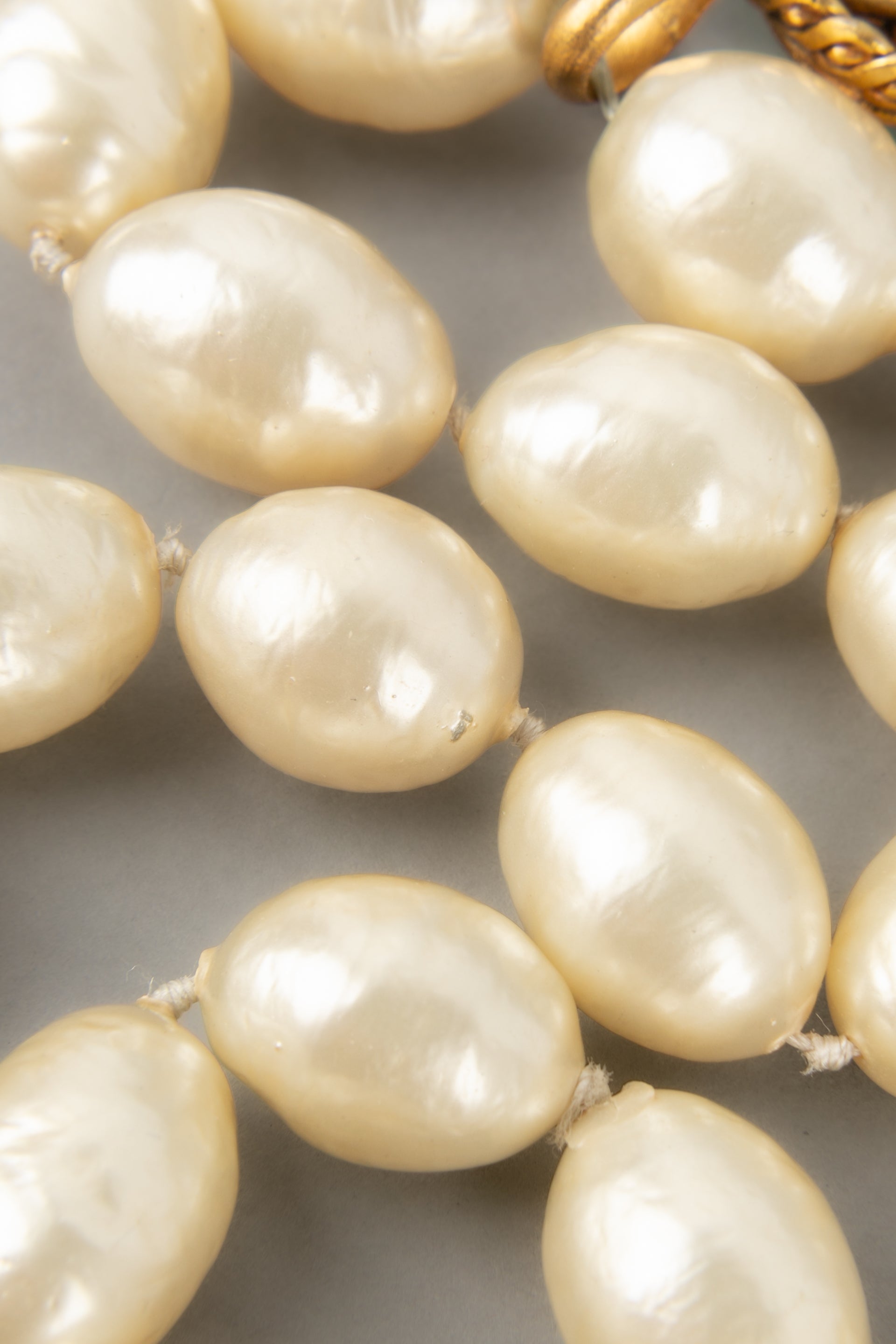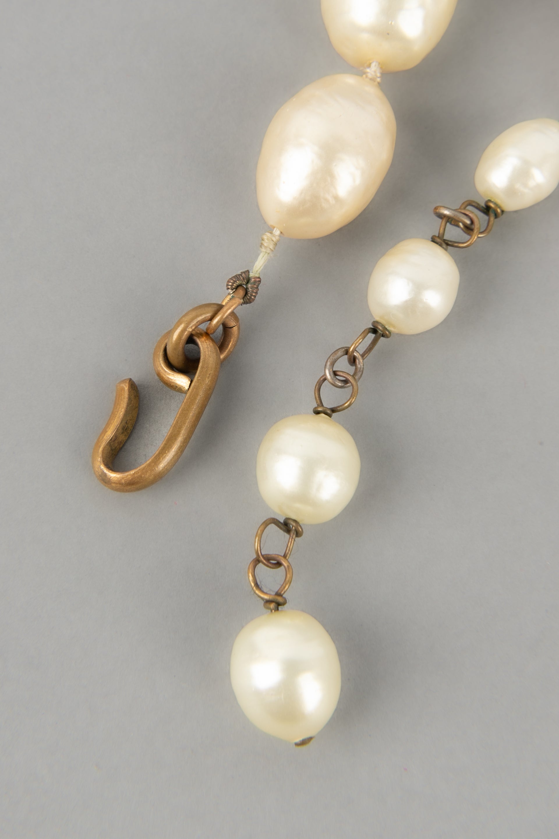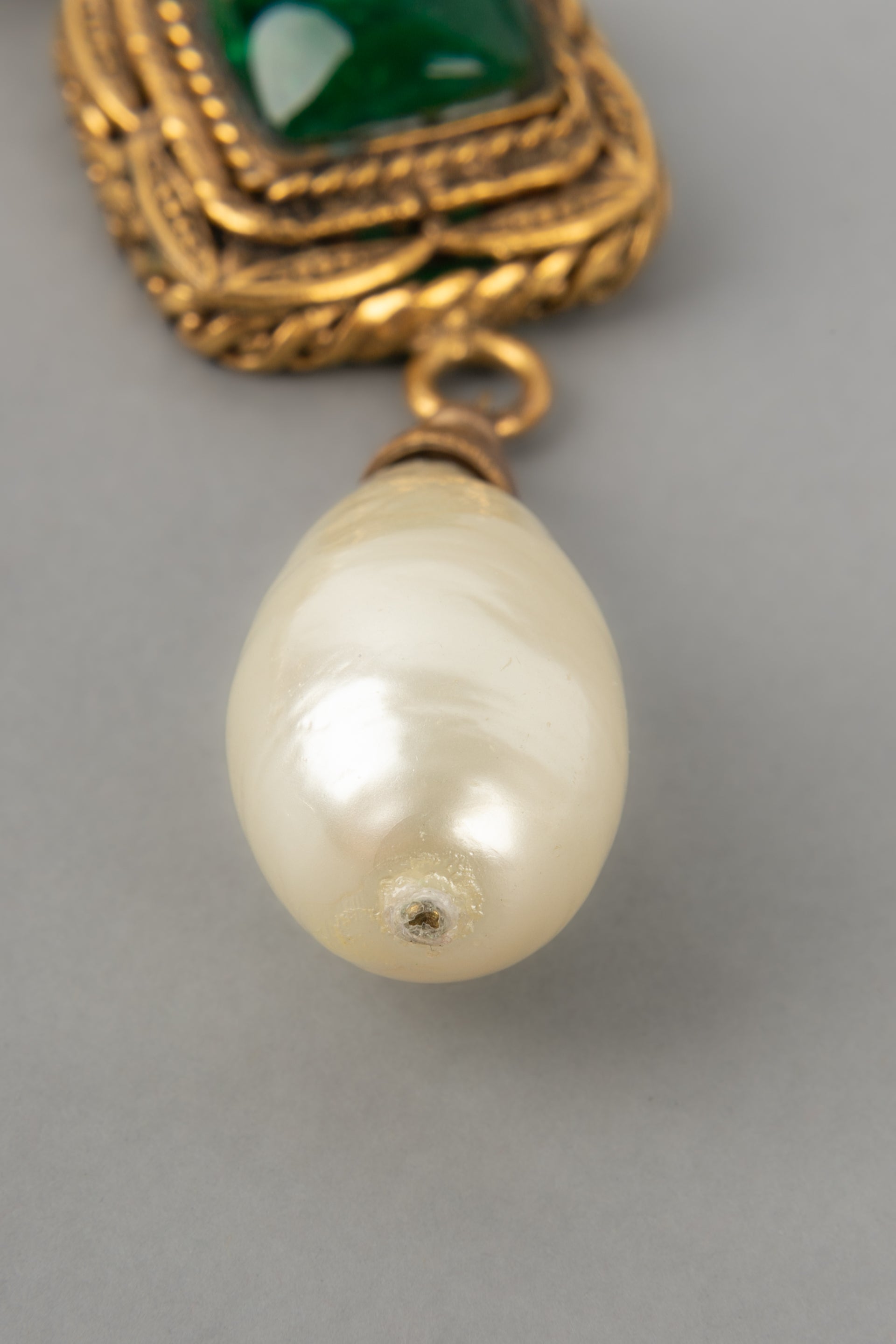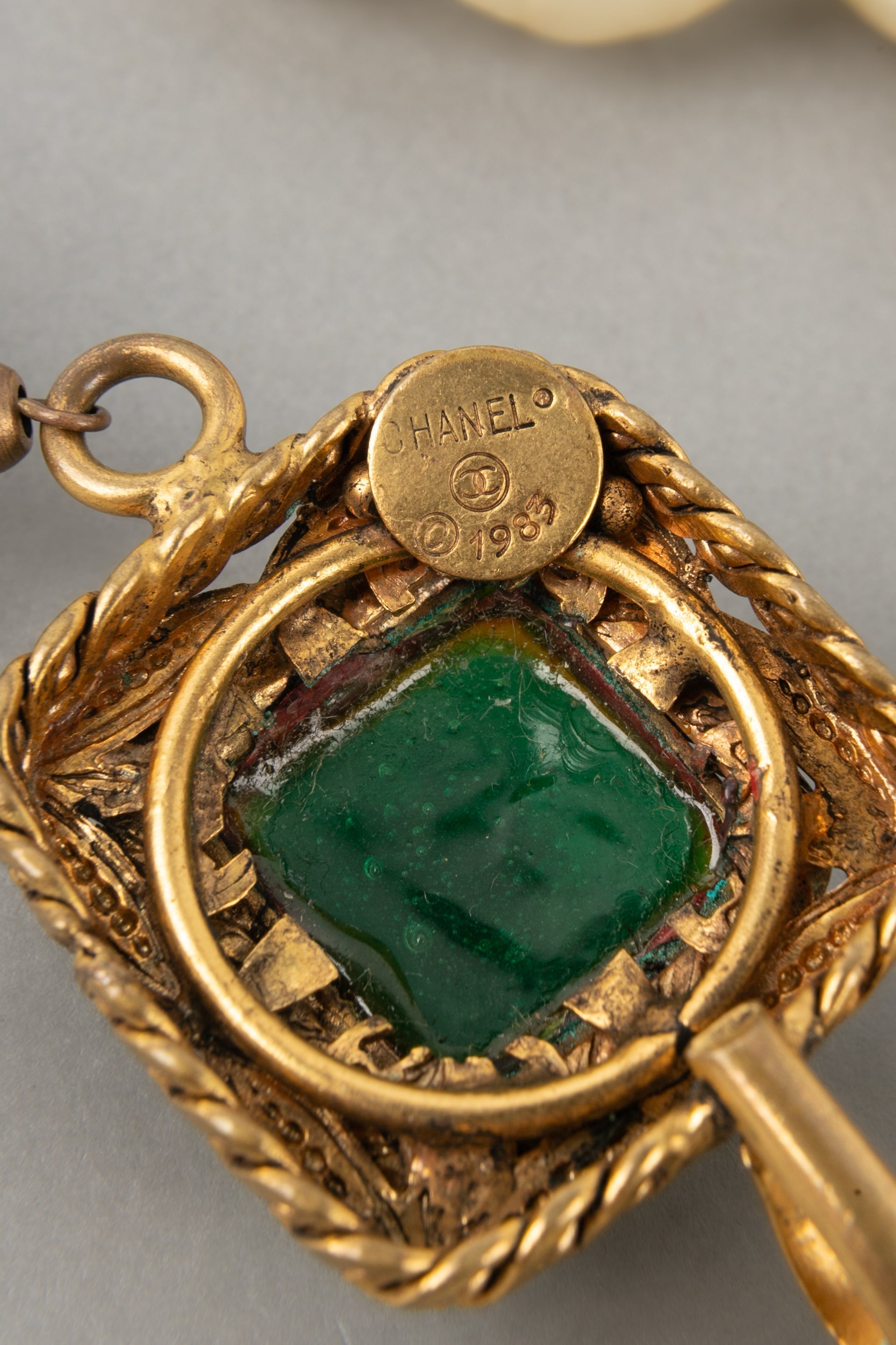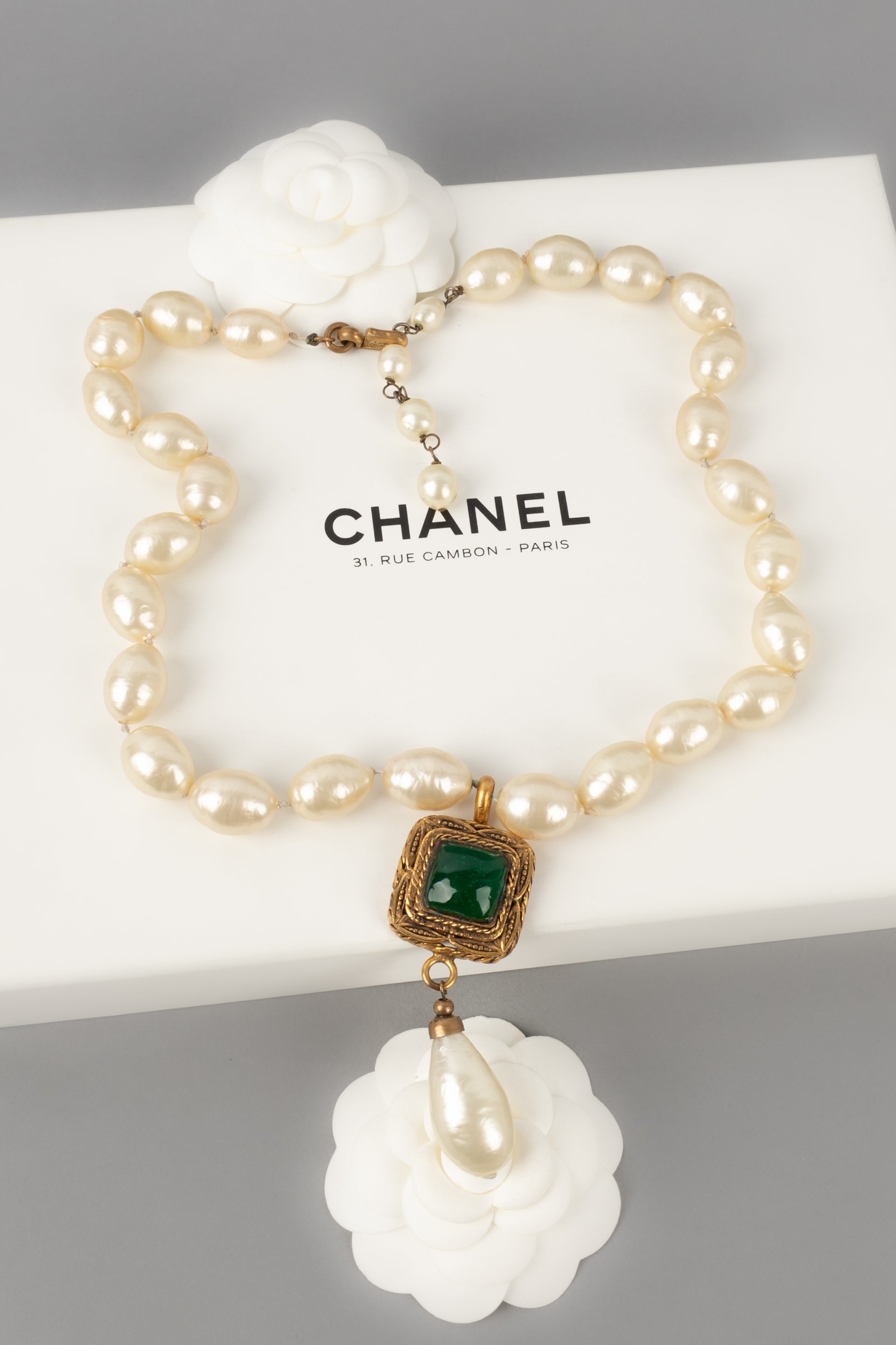 CHANEL - Collier de perles de nacres fantaisies et pendentif en mtal dor et. pte de verre verte retenant une imposante goutte nacre. Collection 1983.