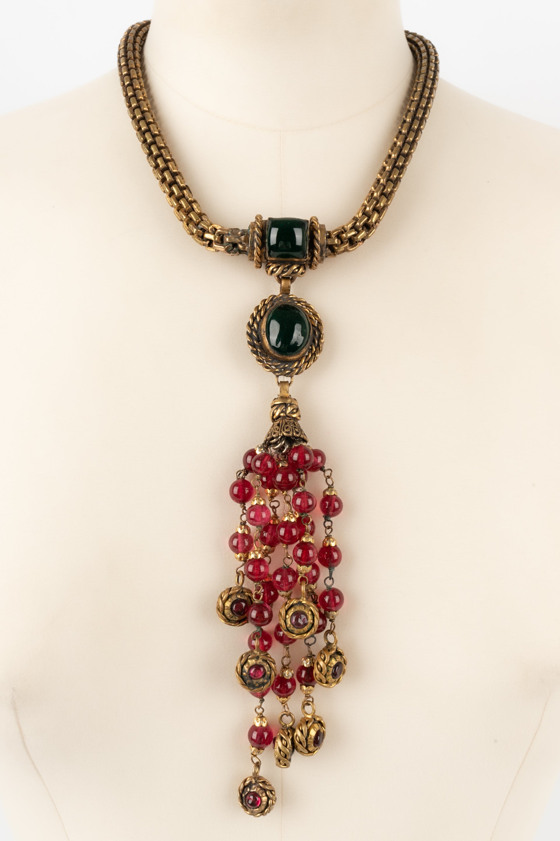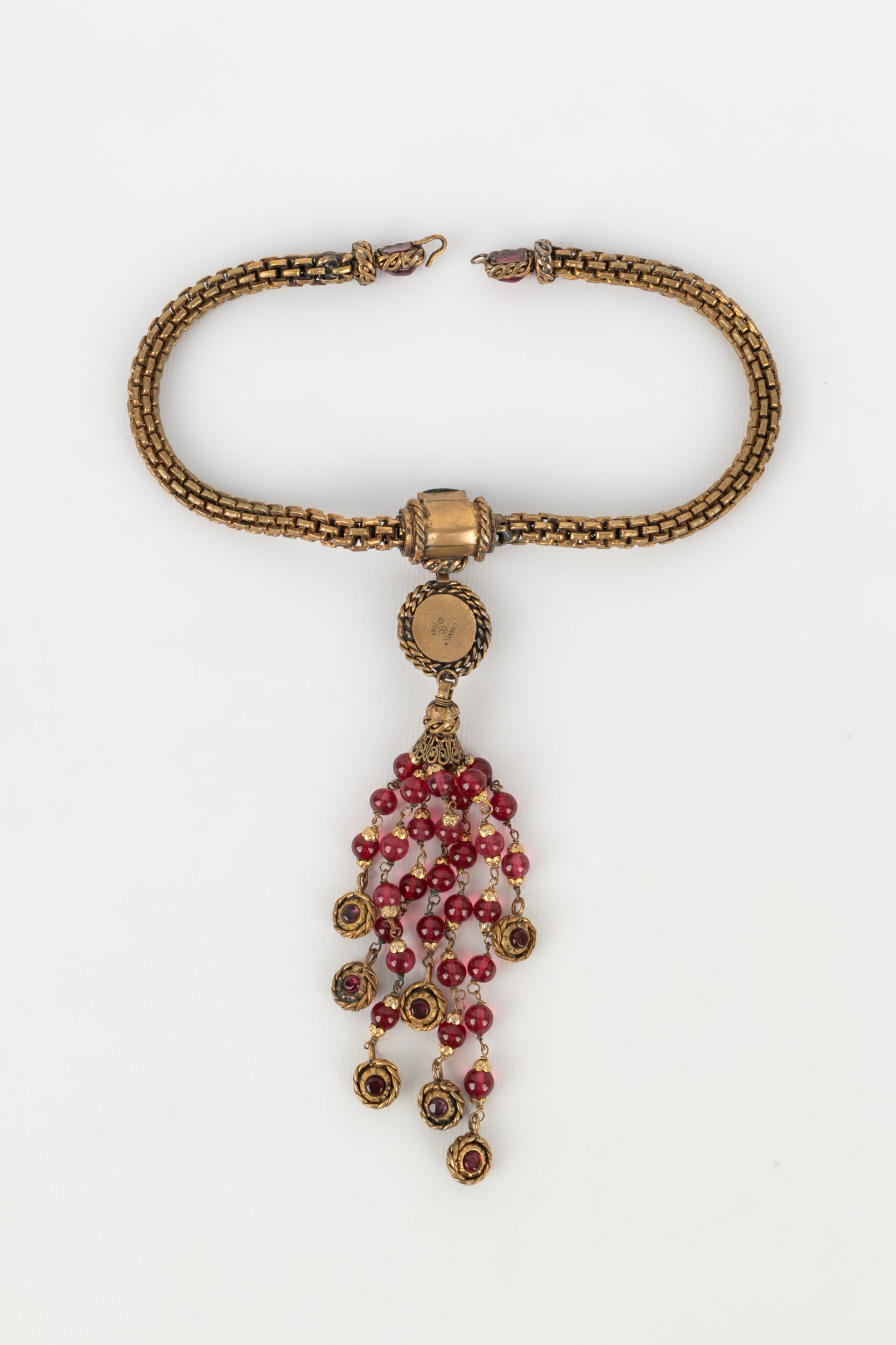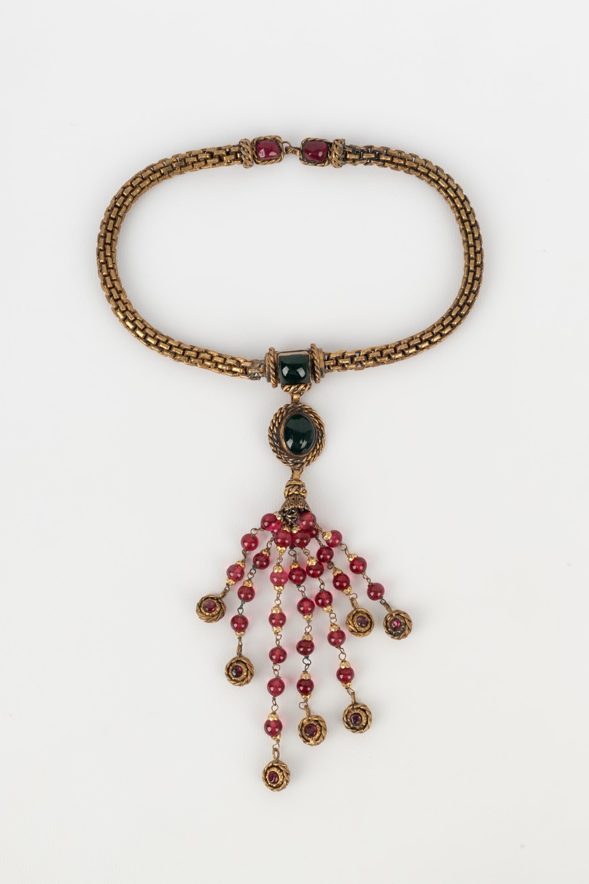 CHANEL - Collier en mtal dor fonc et pte de verre. Collection 1984.