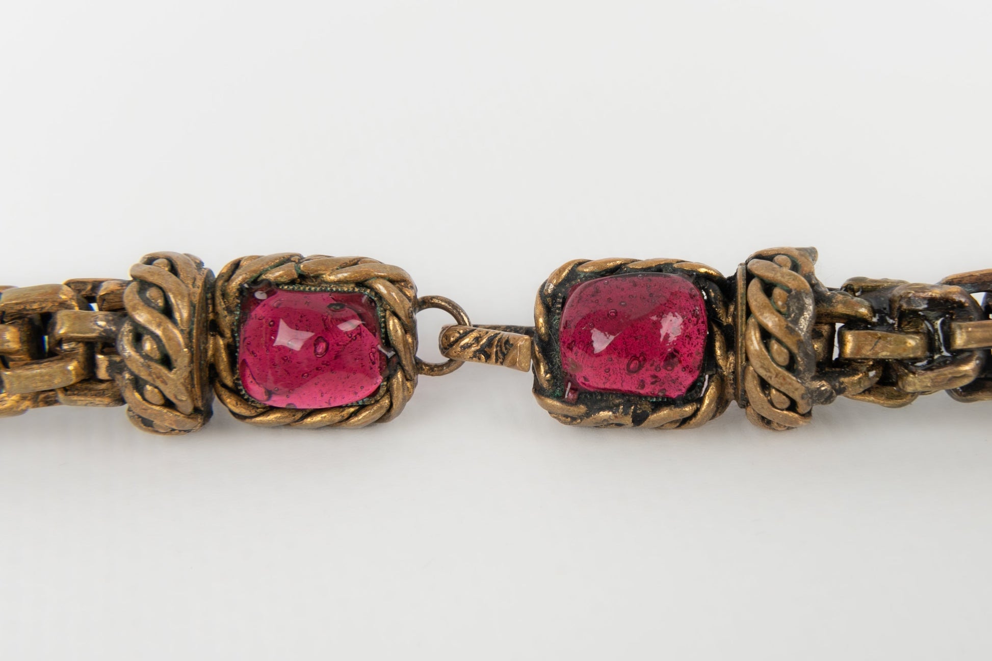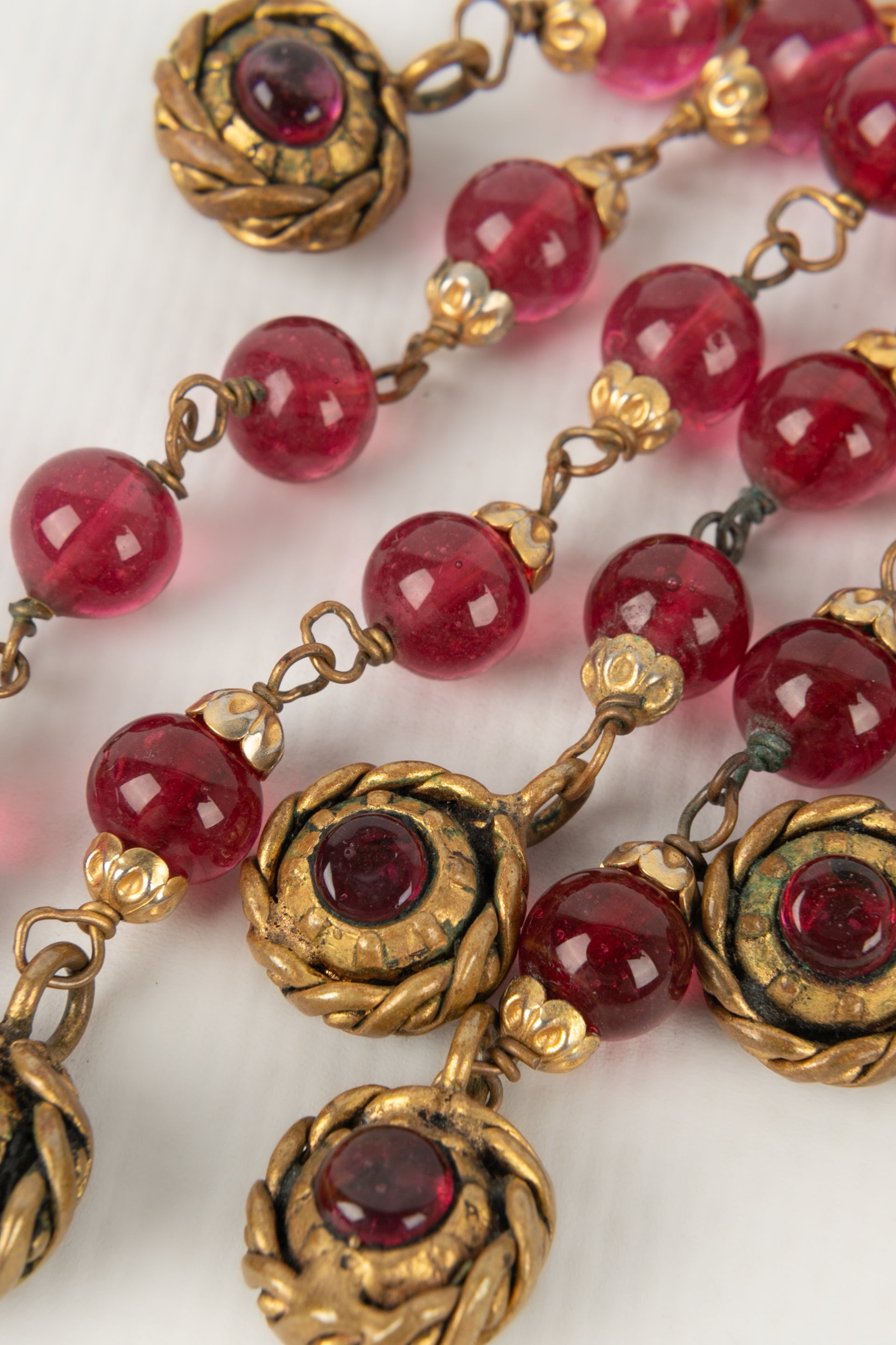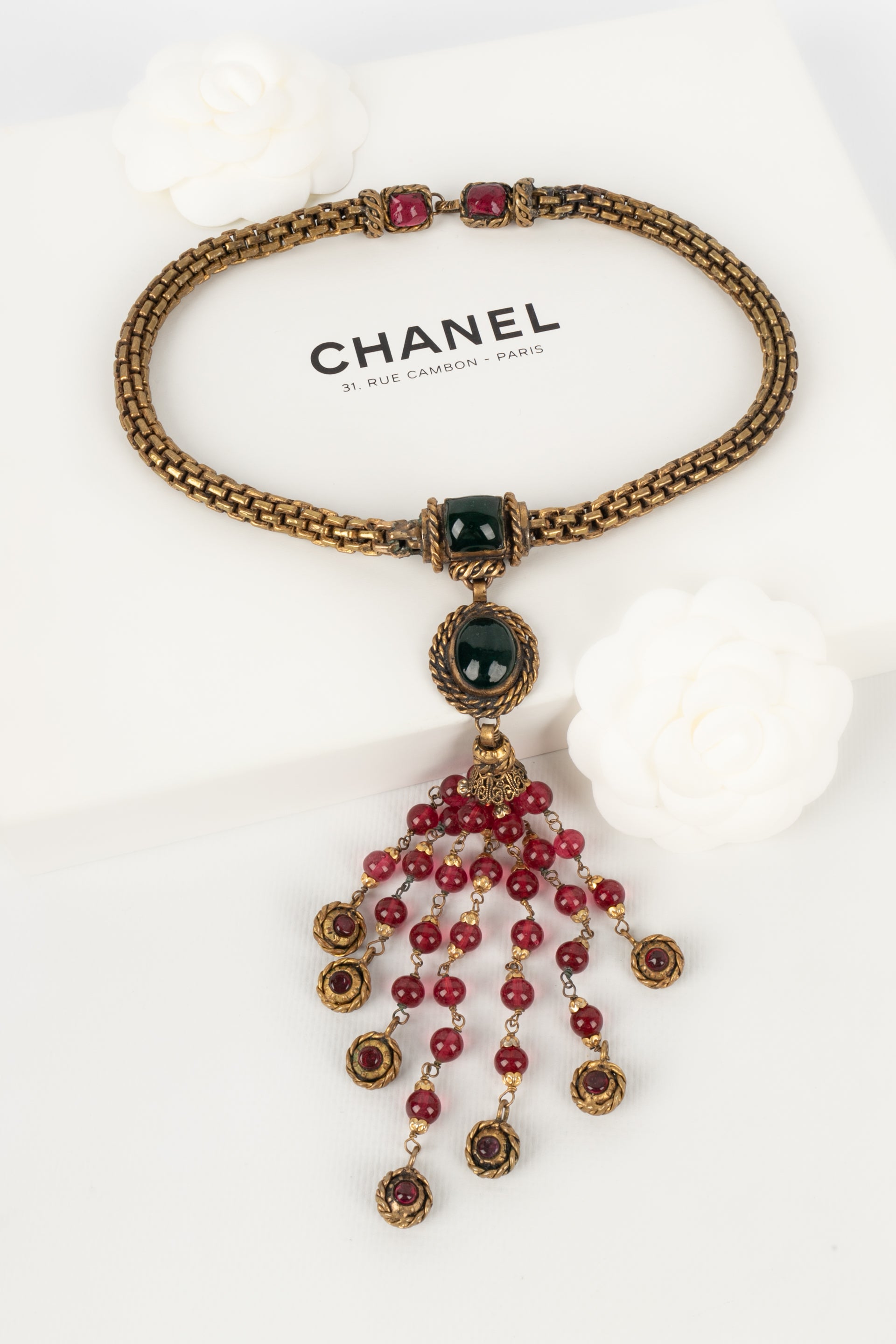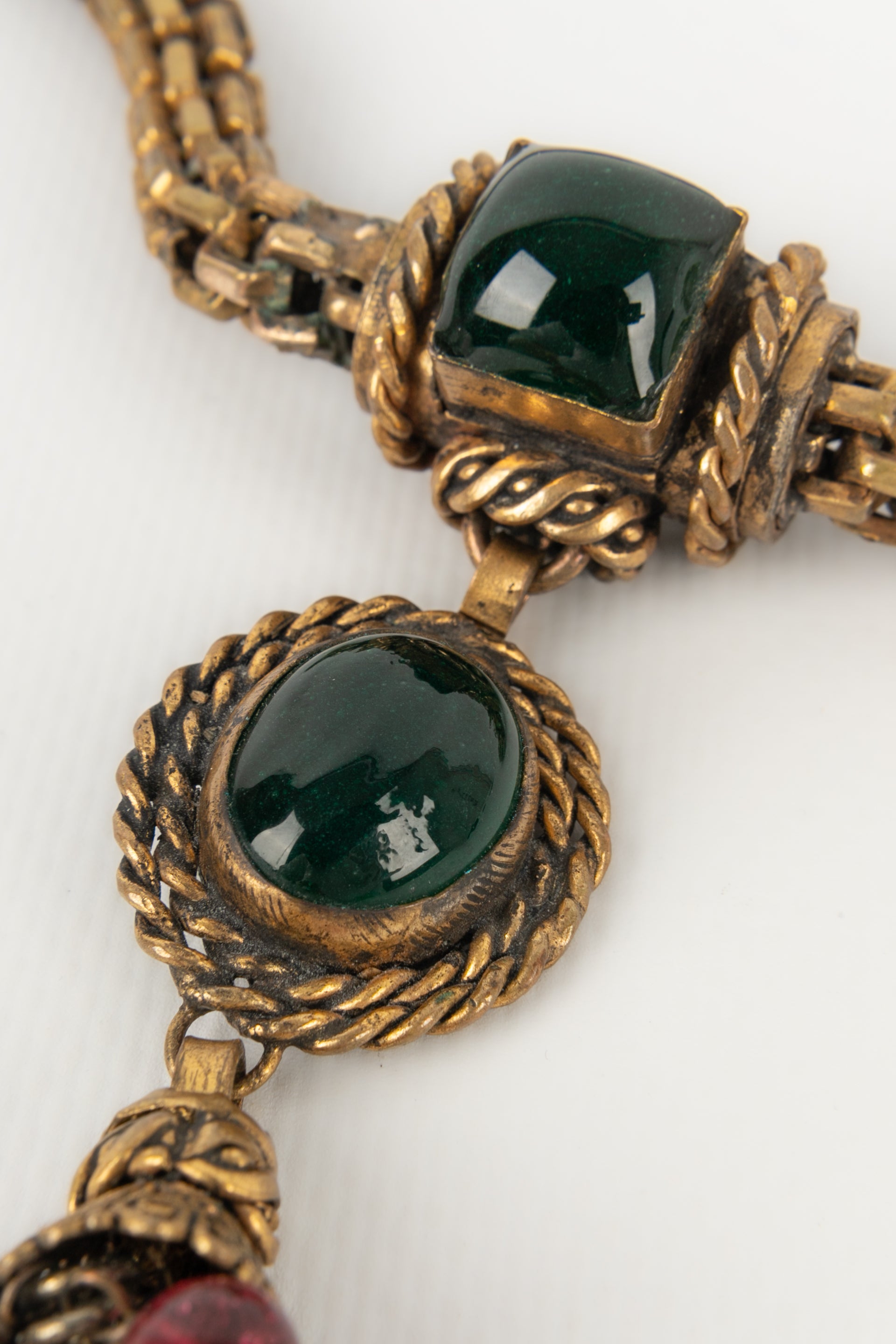 CHANEL - Collier en mtal dor fonc et pte de verre. Collection 1984.