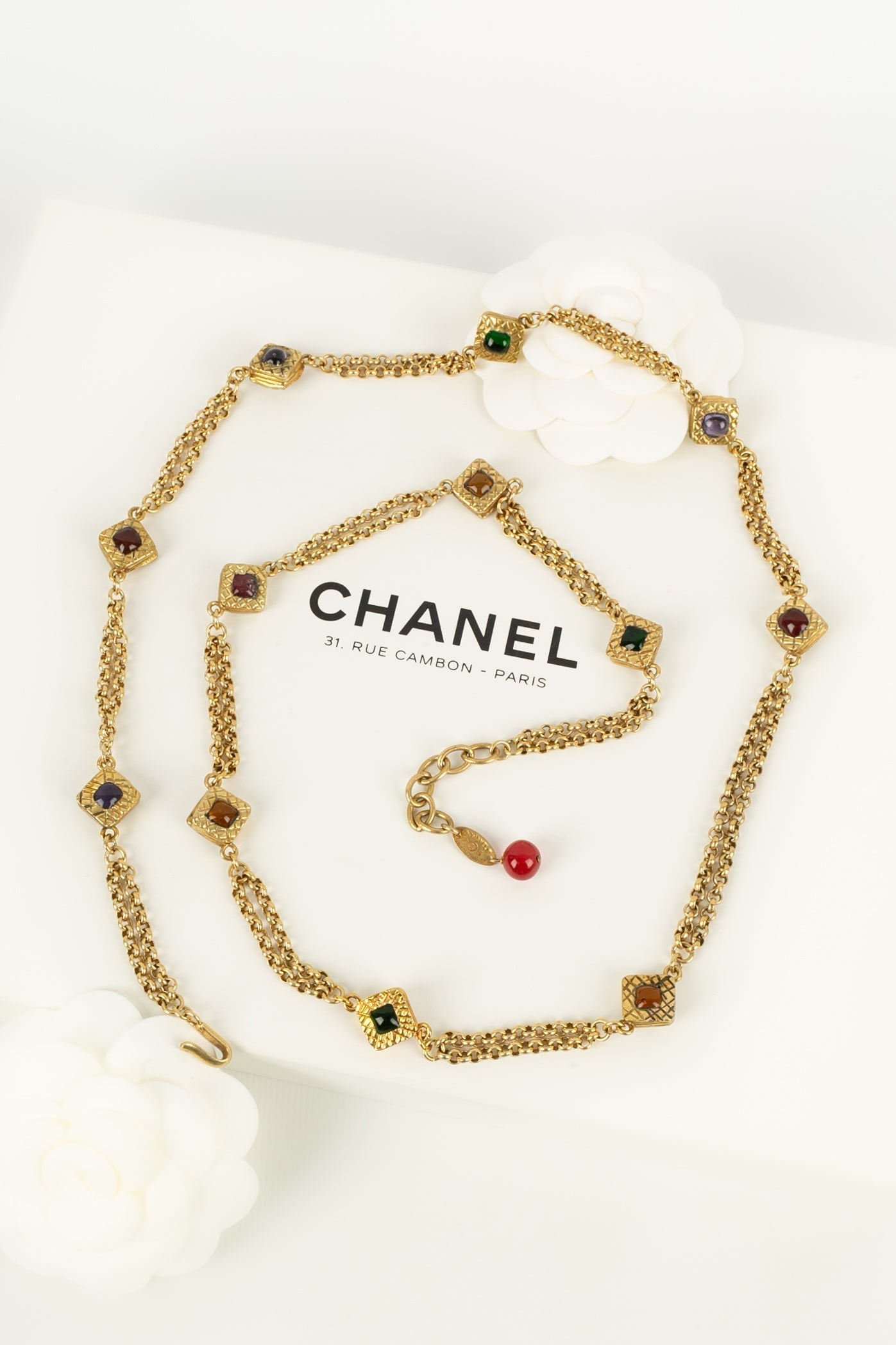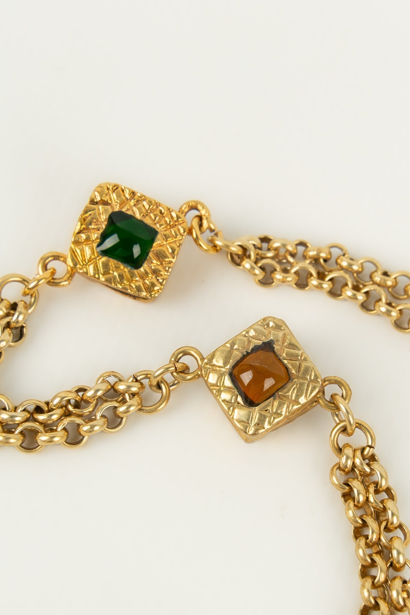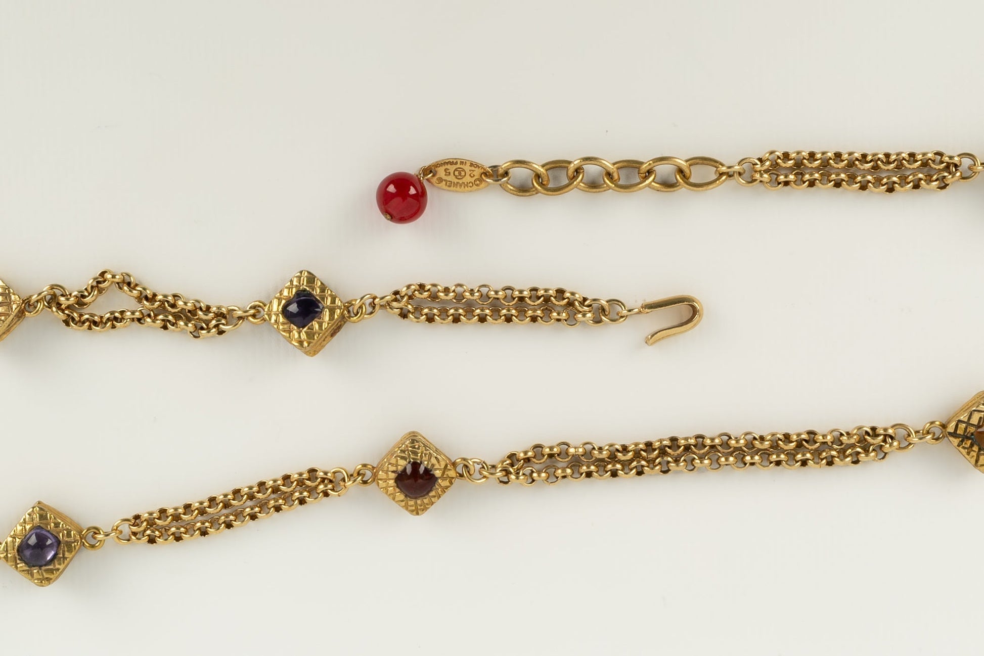 CHANEL - (Made in France) Collier chaine en mtal dor et lments centrs de pte de verre color. Travail de l'atelier Gripoix pour la maison Chanel.