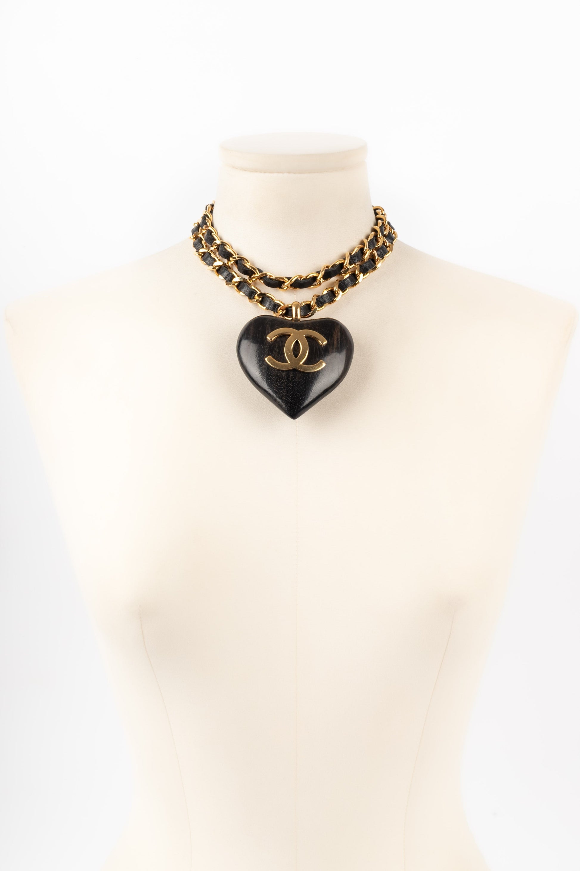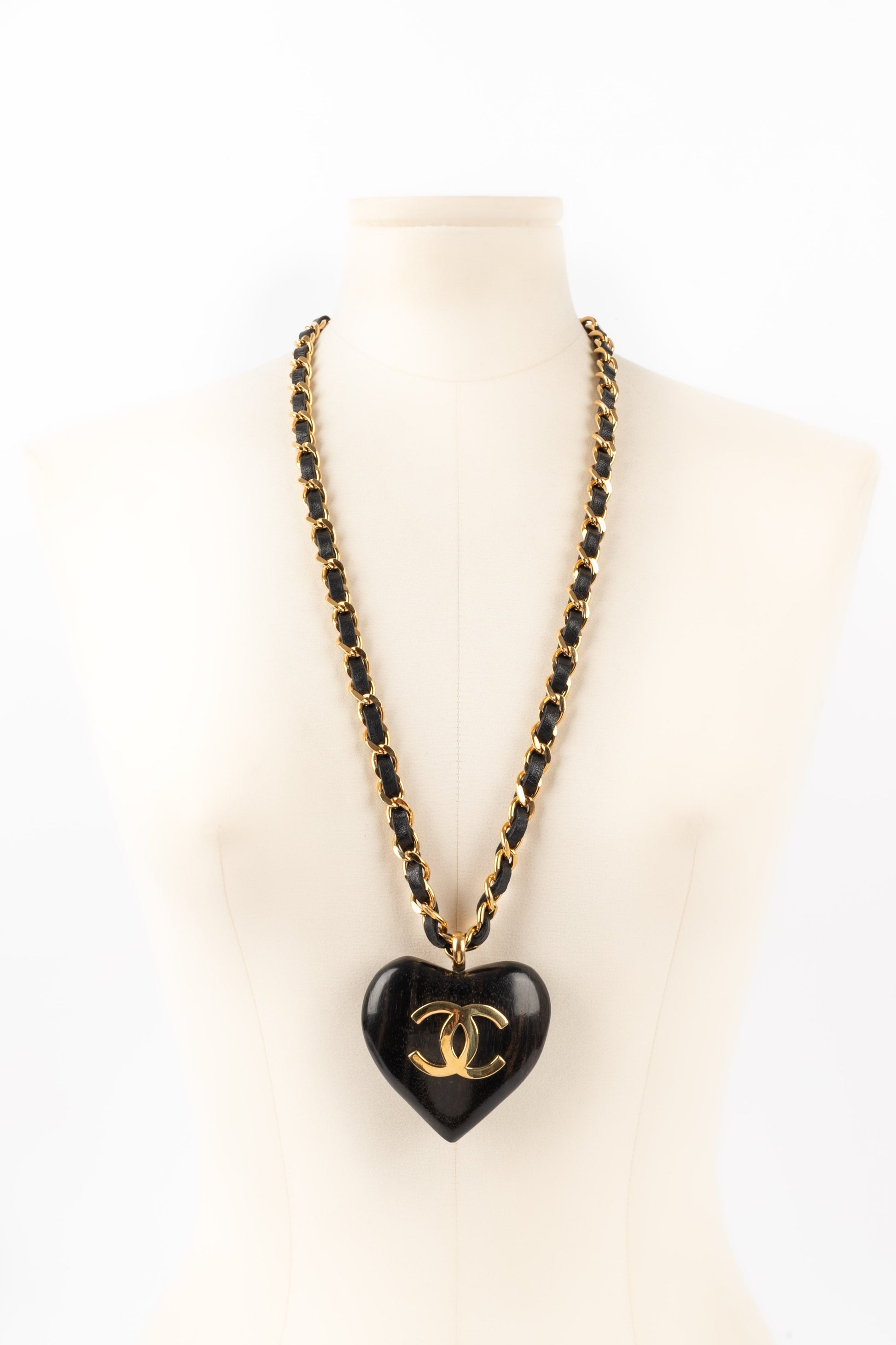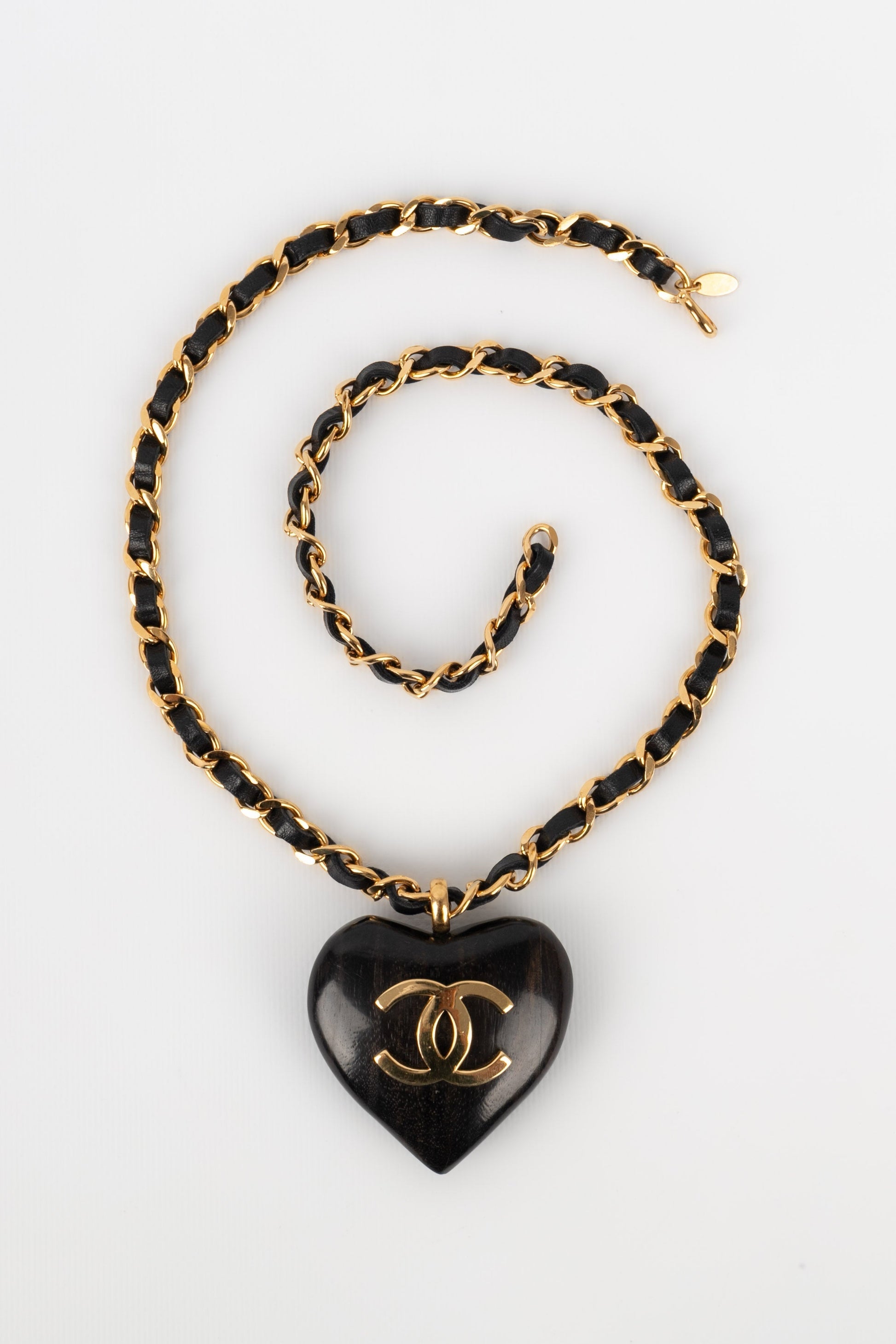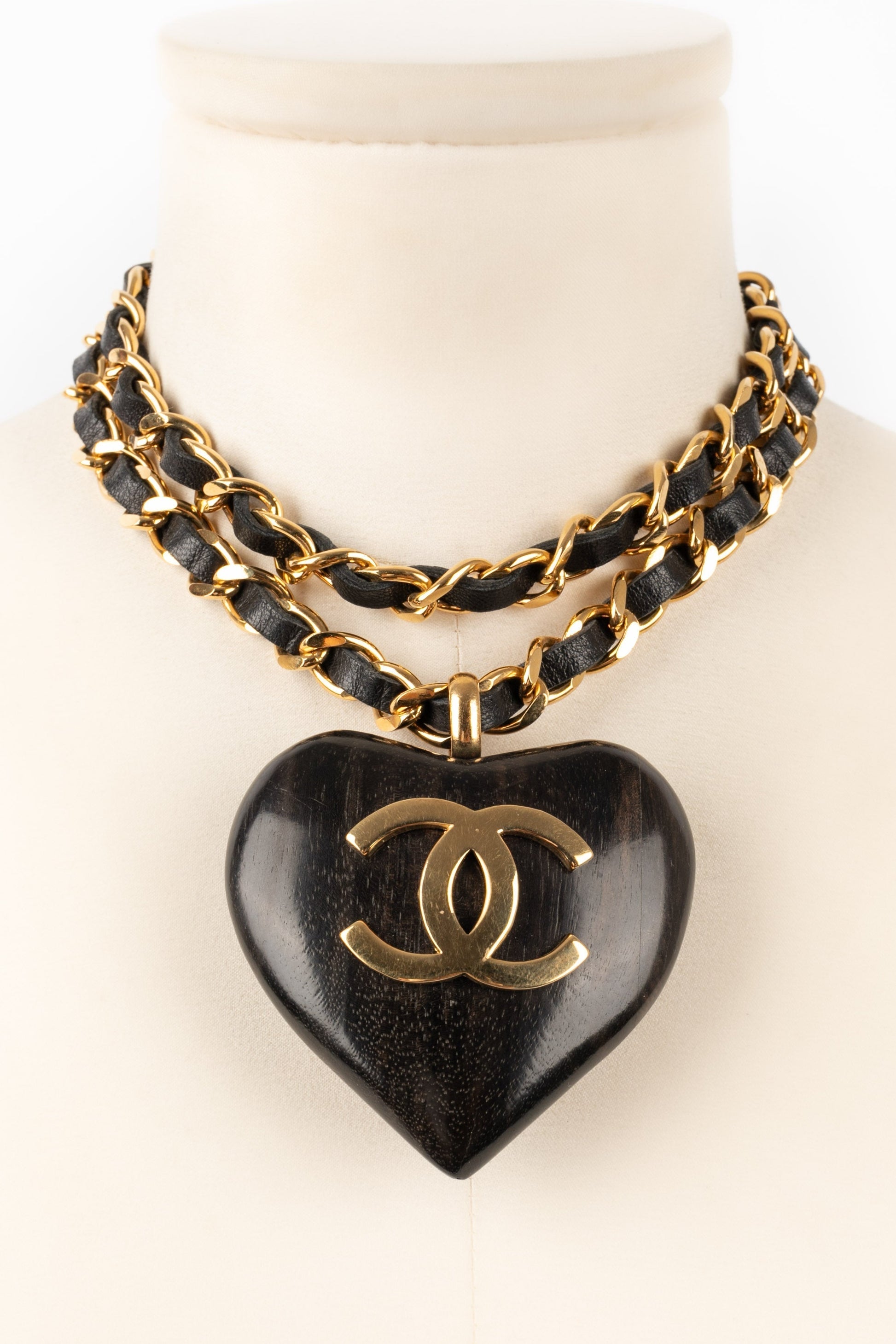 - (Made in France) Collier en mtal dor, cuir noir et coeur en bois agrment d'un logo cc. Collection Printemps-Et 1992.