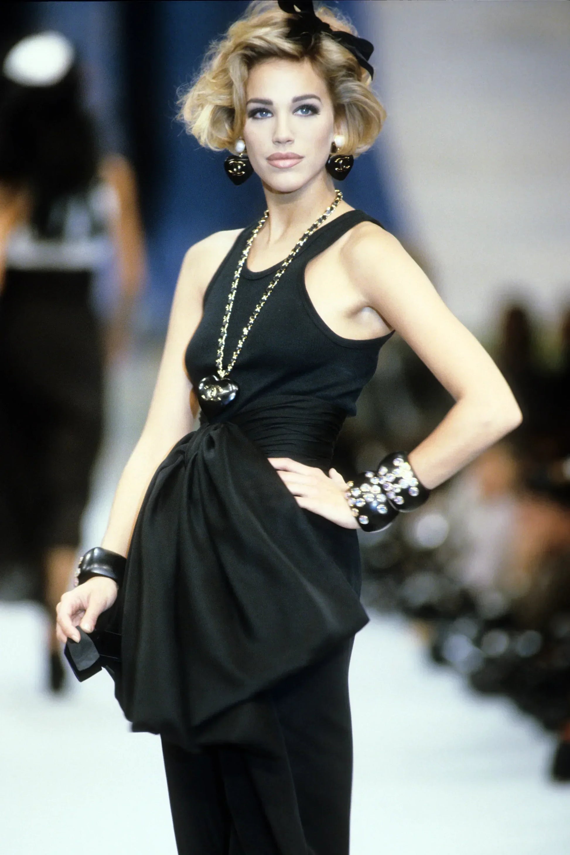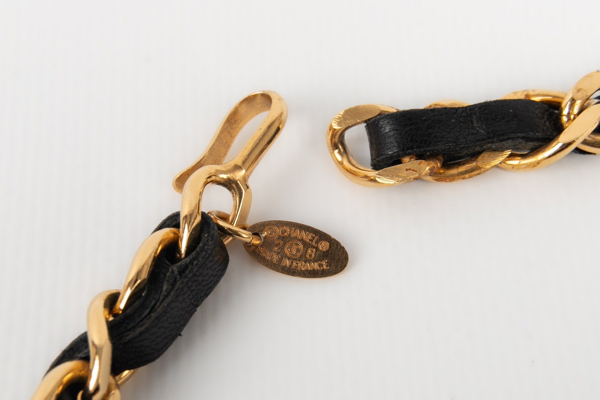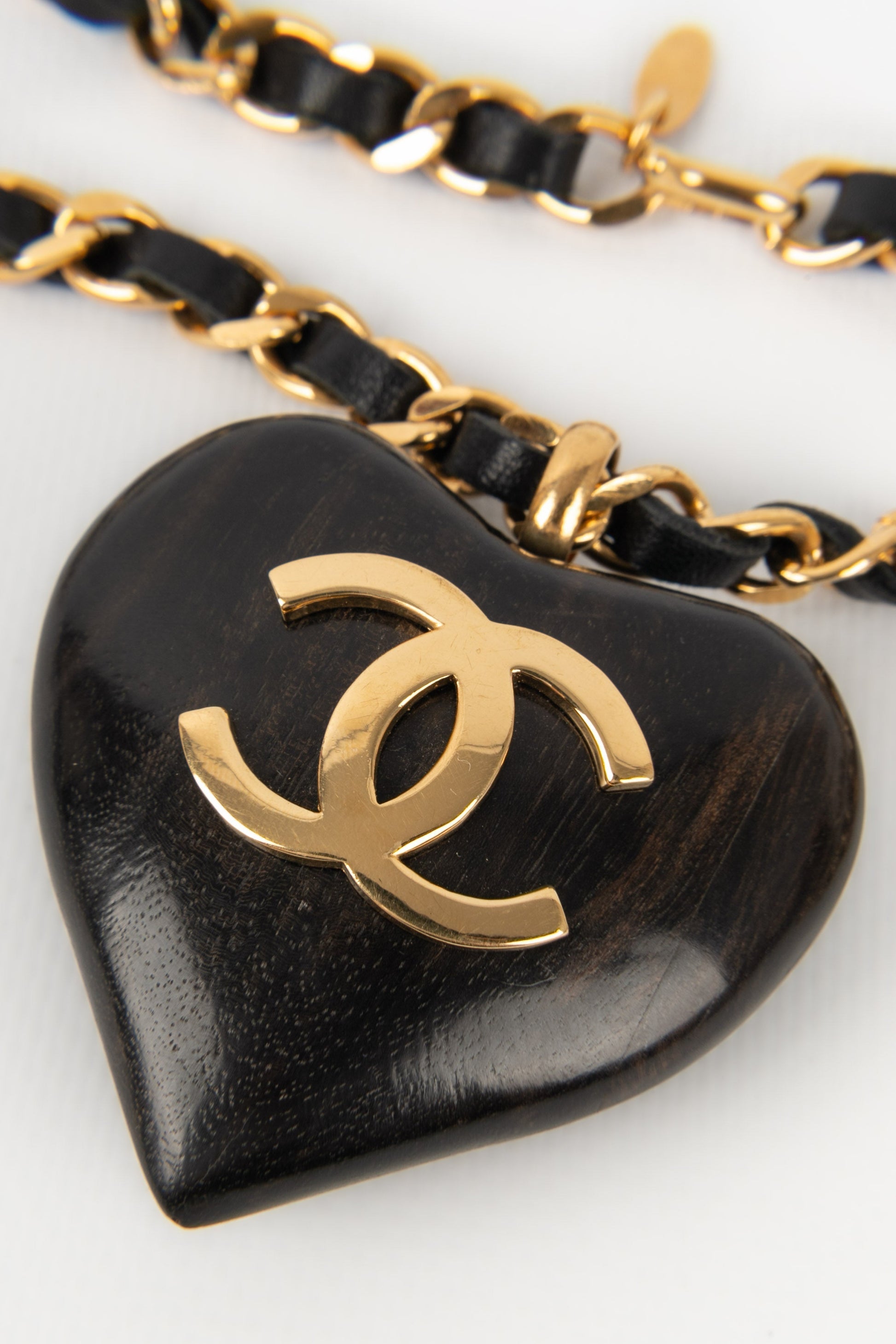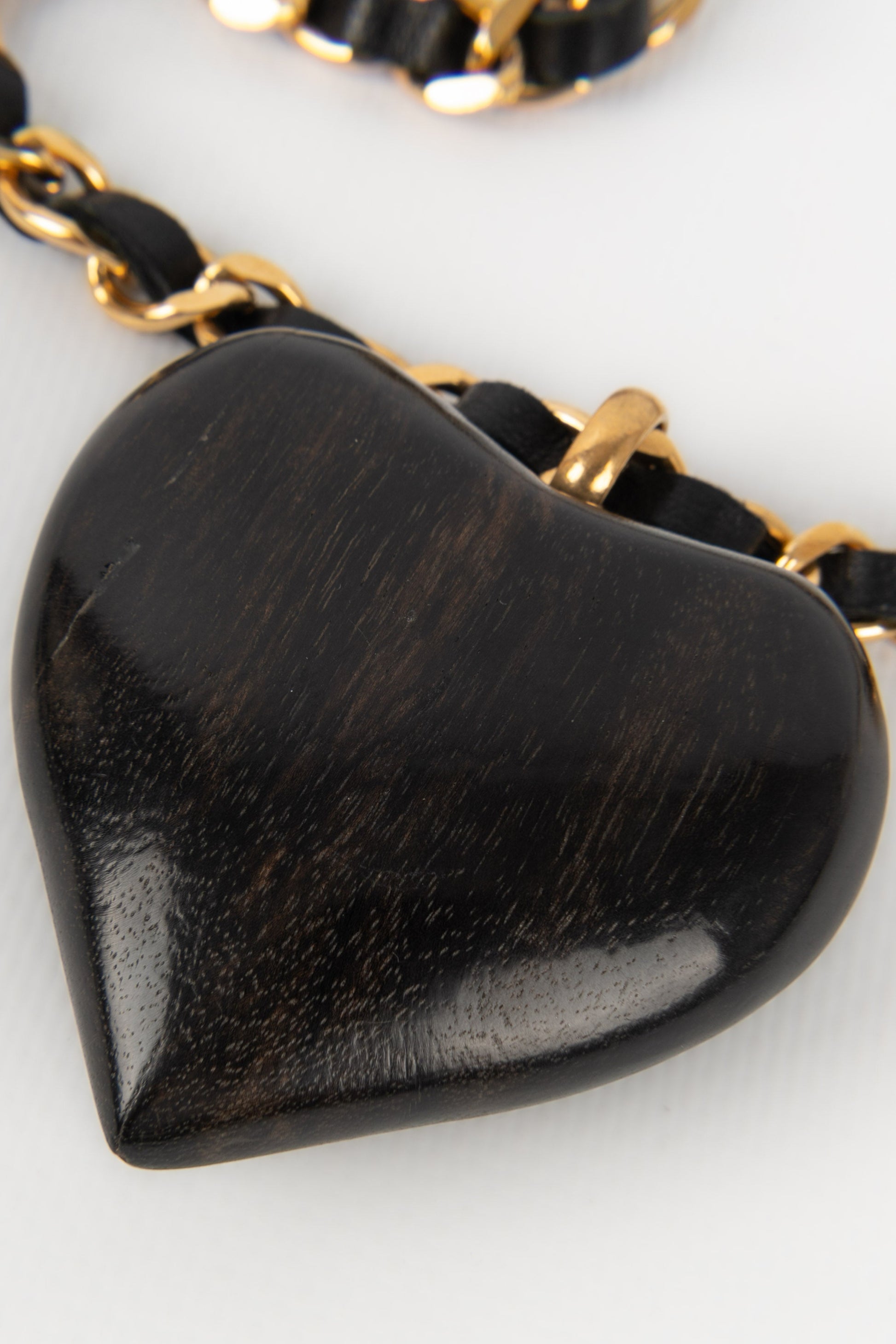 - (Made in France) Collier en mtal dor, cuir noir et coeur en bois agrment d'un logo cc. Collection Printemps-Et 1992.