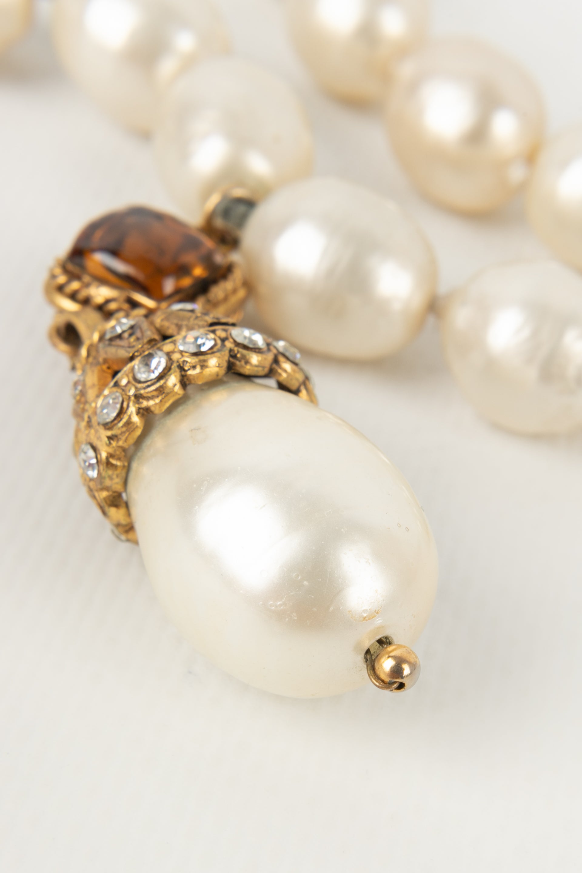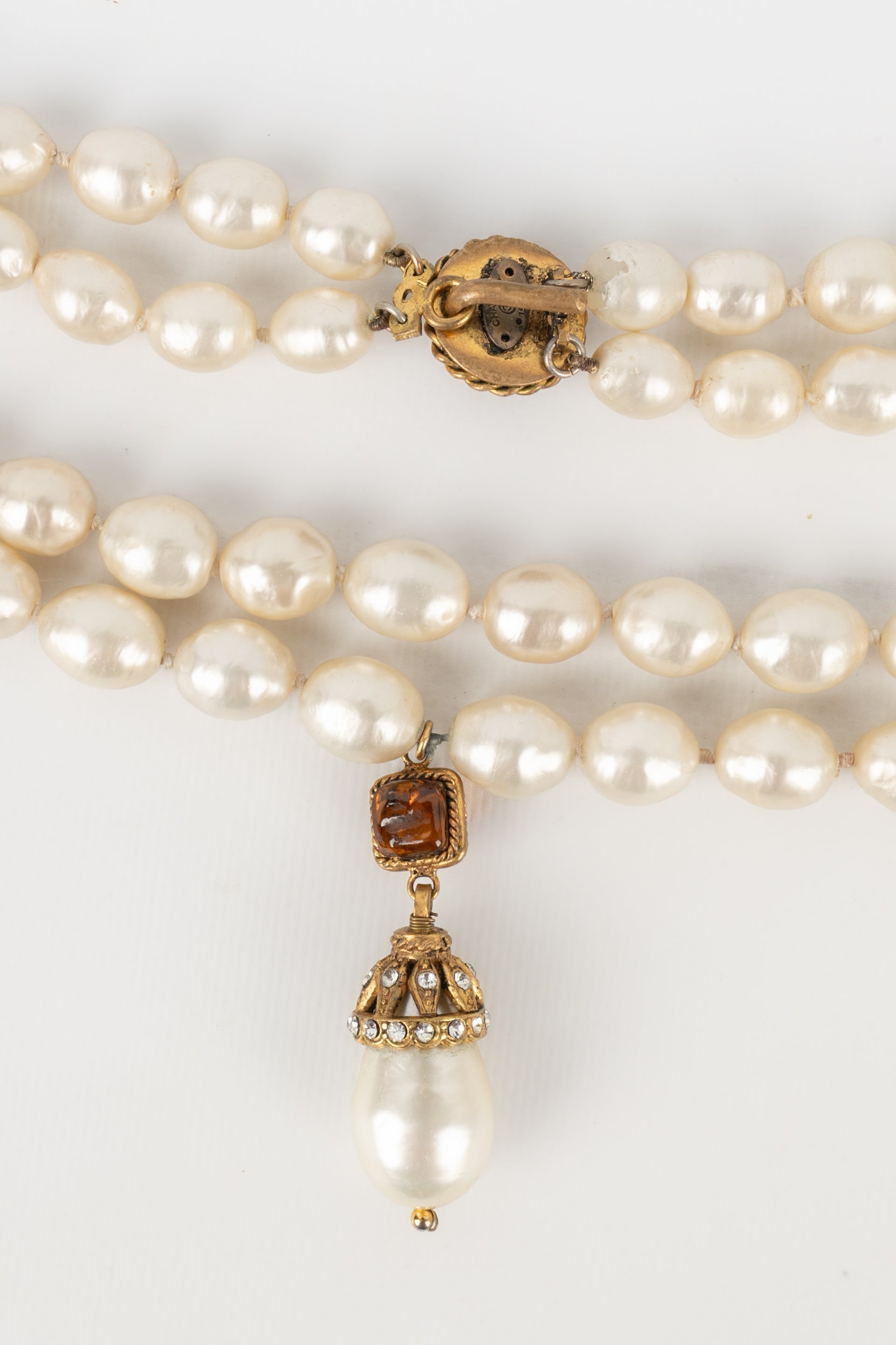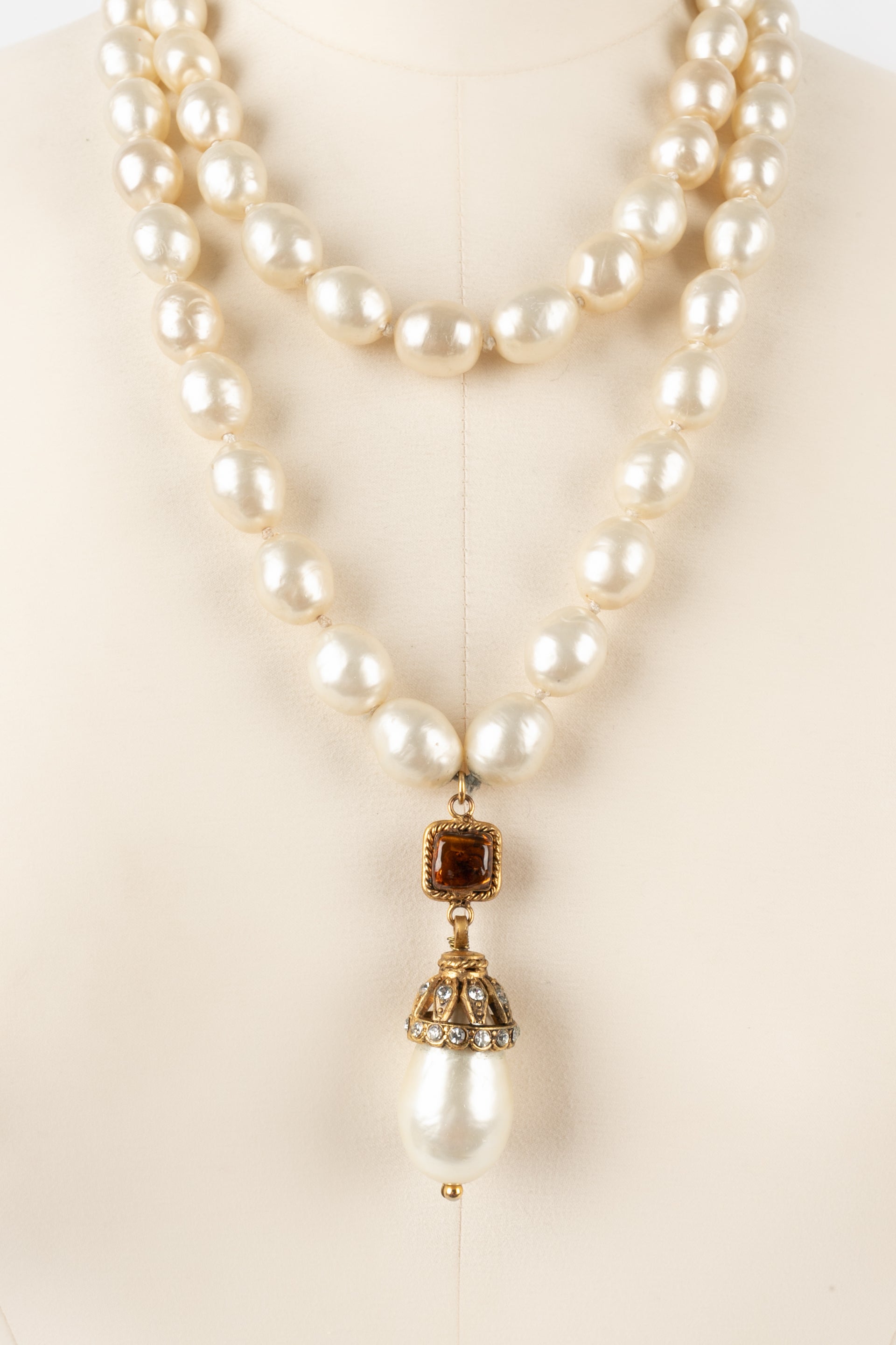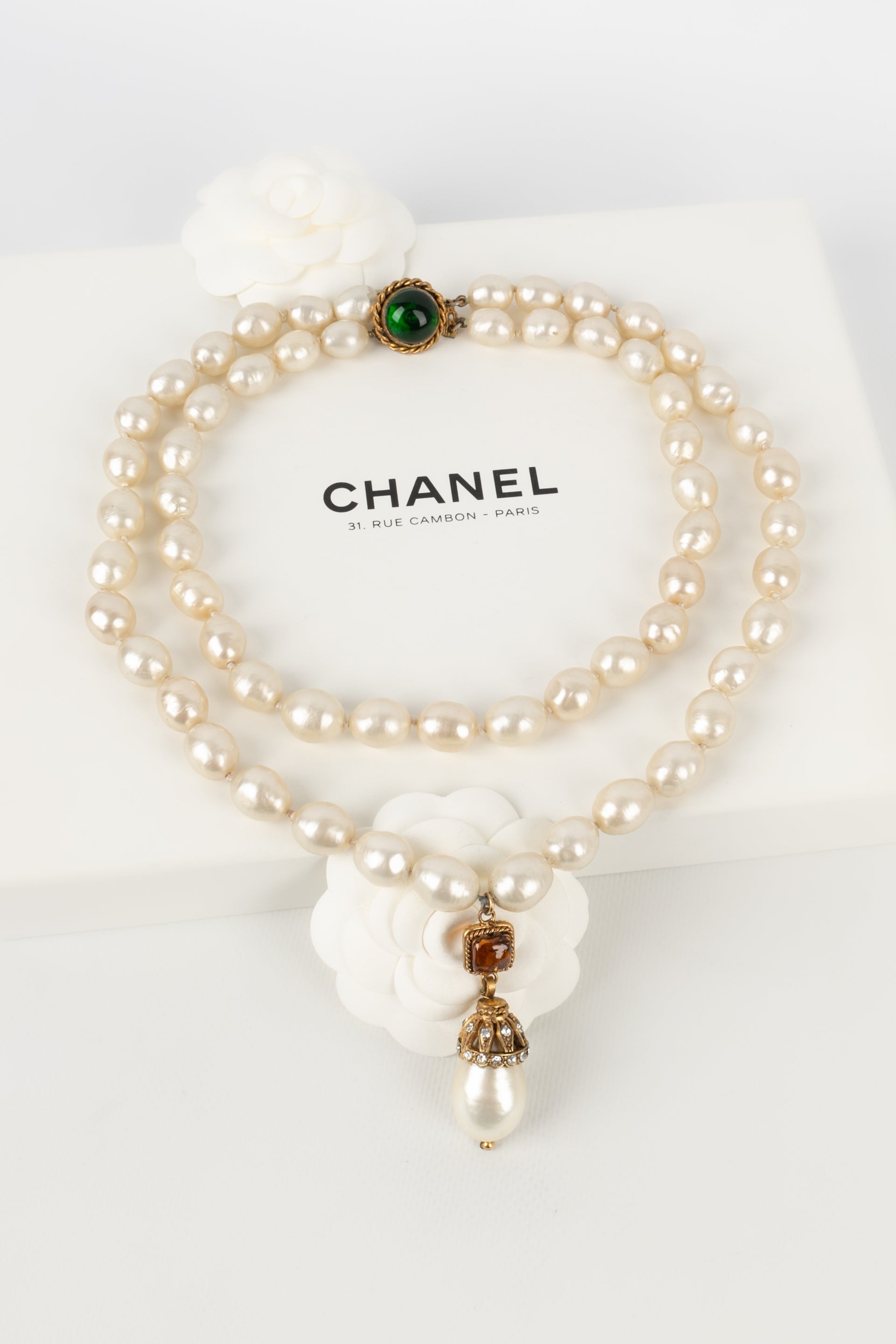 CHANEL - (Made in France) Collier compos de deux rangs de perles nacres montes noeuds, d'un pendentif et d'un fermoir en mtal dor et pte de verre. < Bijou datant des annes 1980s.