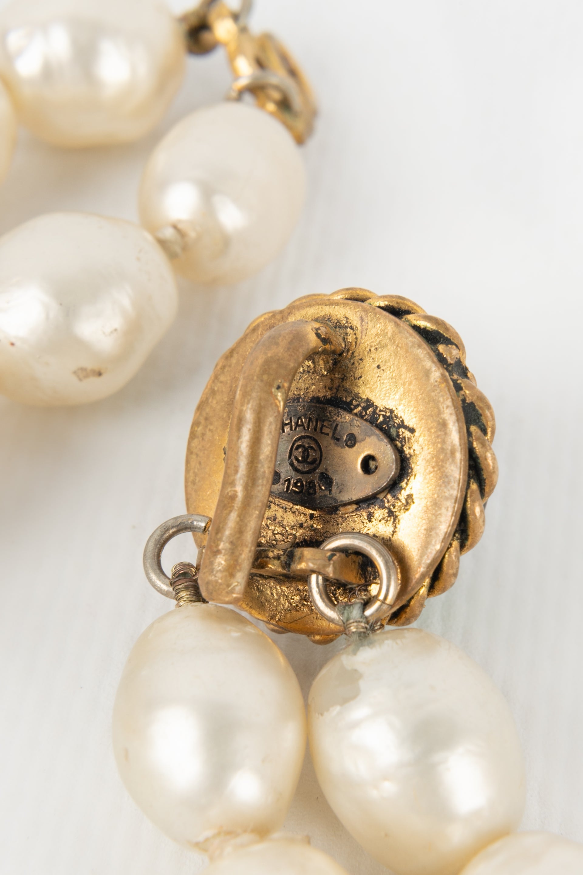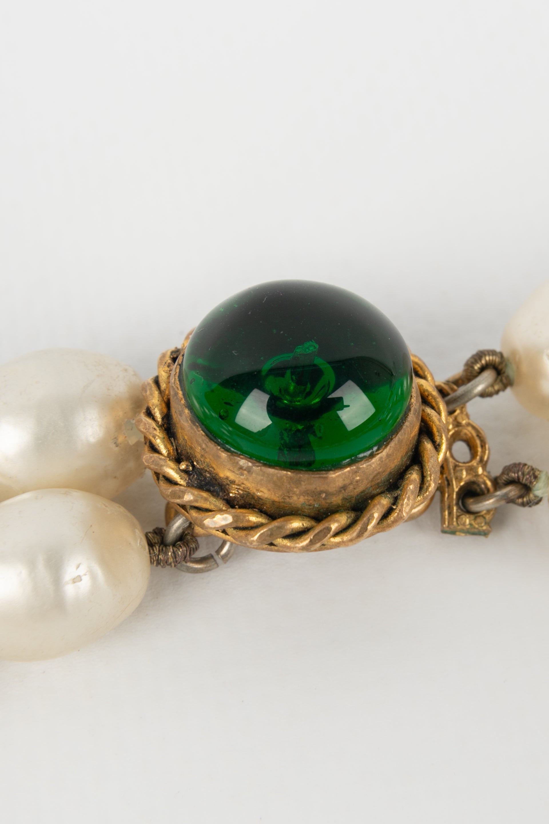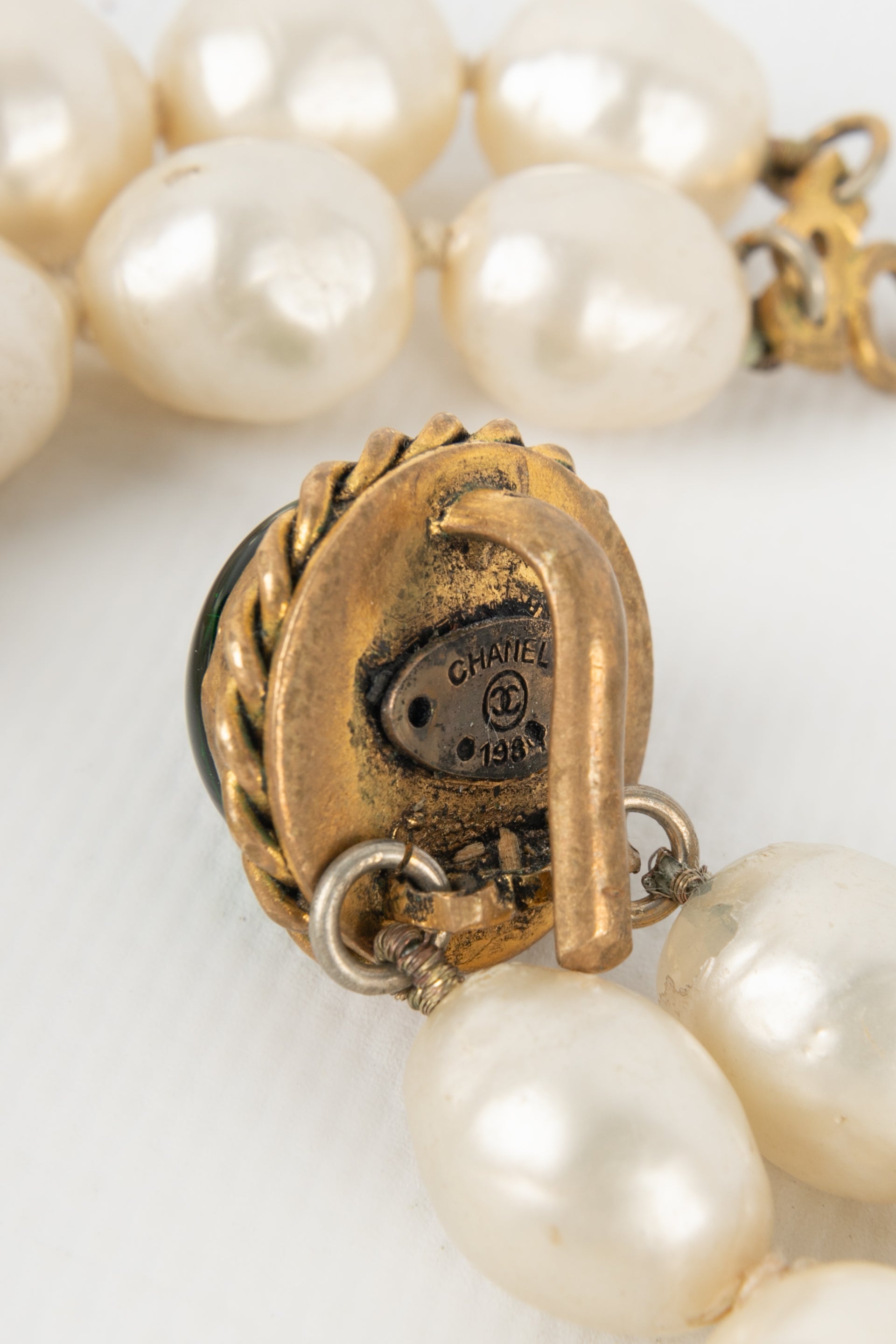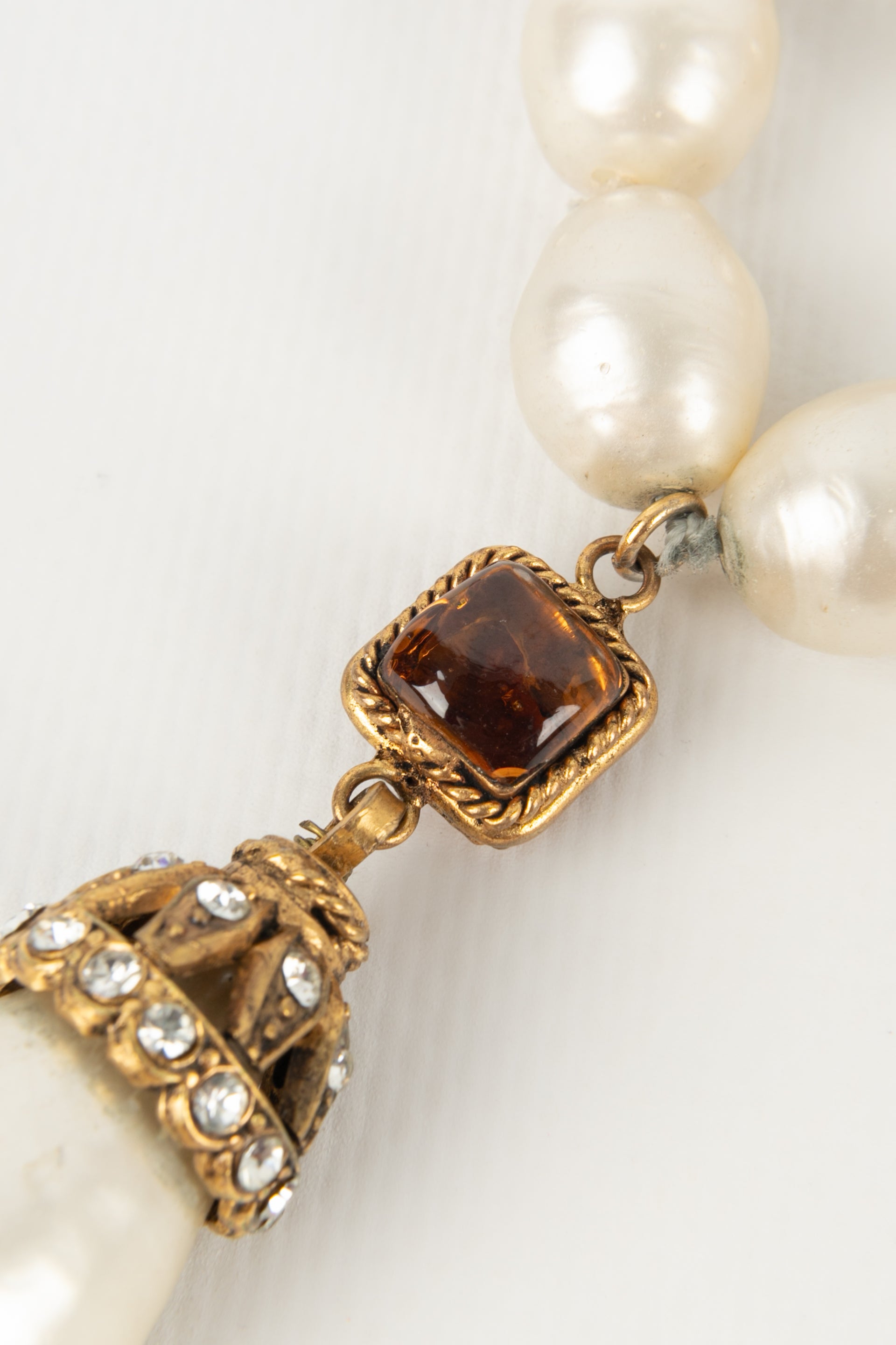 CHANEL - (Made in France) Collier compos de deux rangs de perles nacres montes noeuds, d'un pendentif et d'un fermoir en mtal dor et pte de verre. < Bijou datant des annes 1980s.