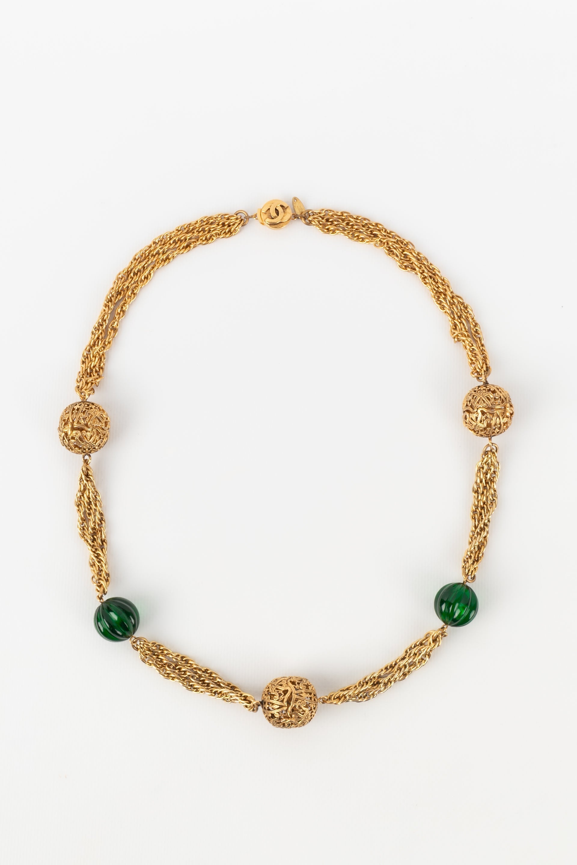 CHANEL - (Made in France) Collier en mtal dor et perles vertes. Collection 1984.