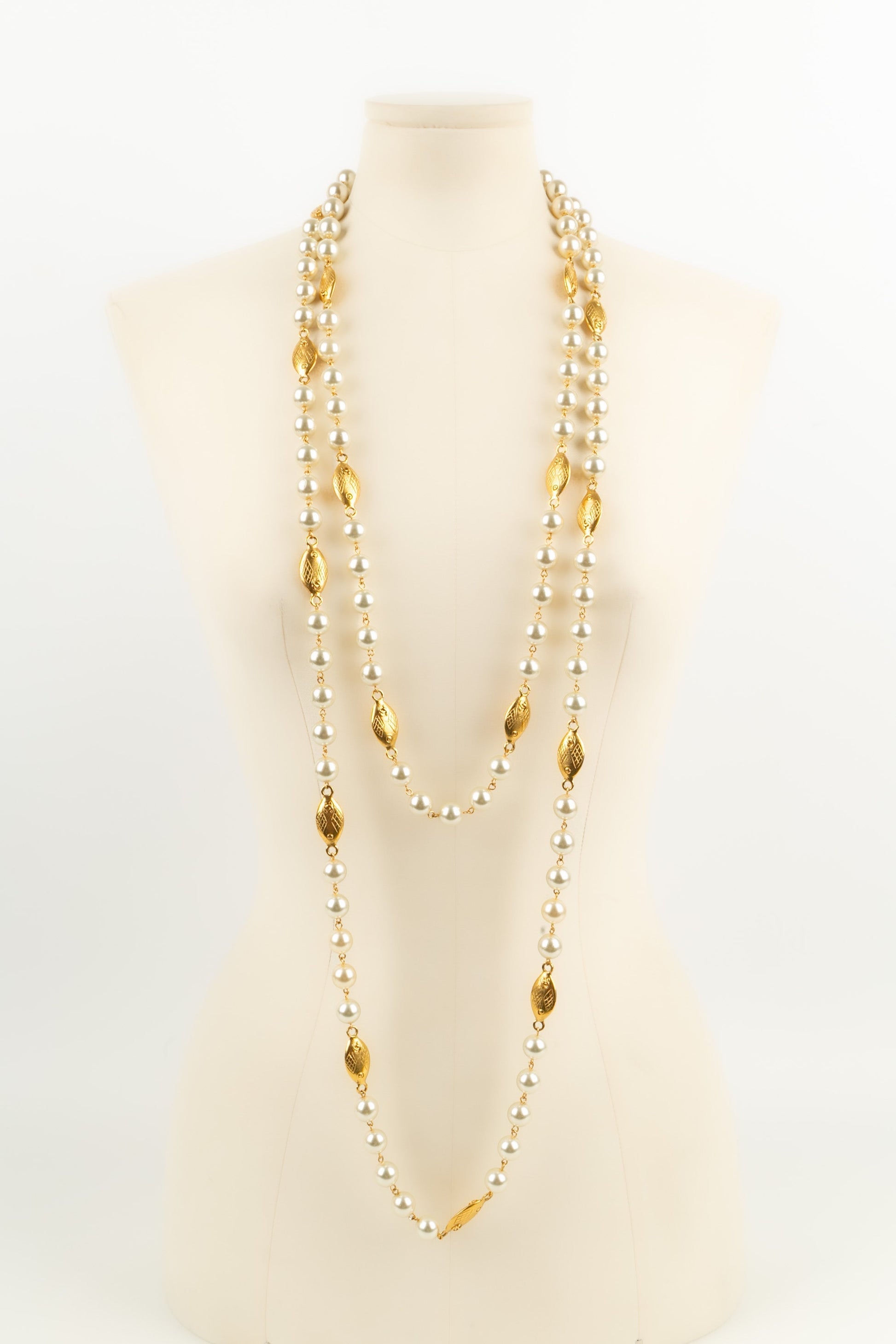 CHANEL - (Made in France) Long sautoir de perles nacres fantaisies alternes de poissons en mtal dor. Collection Automne-Hiver 2004.