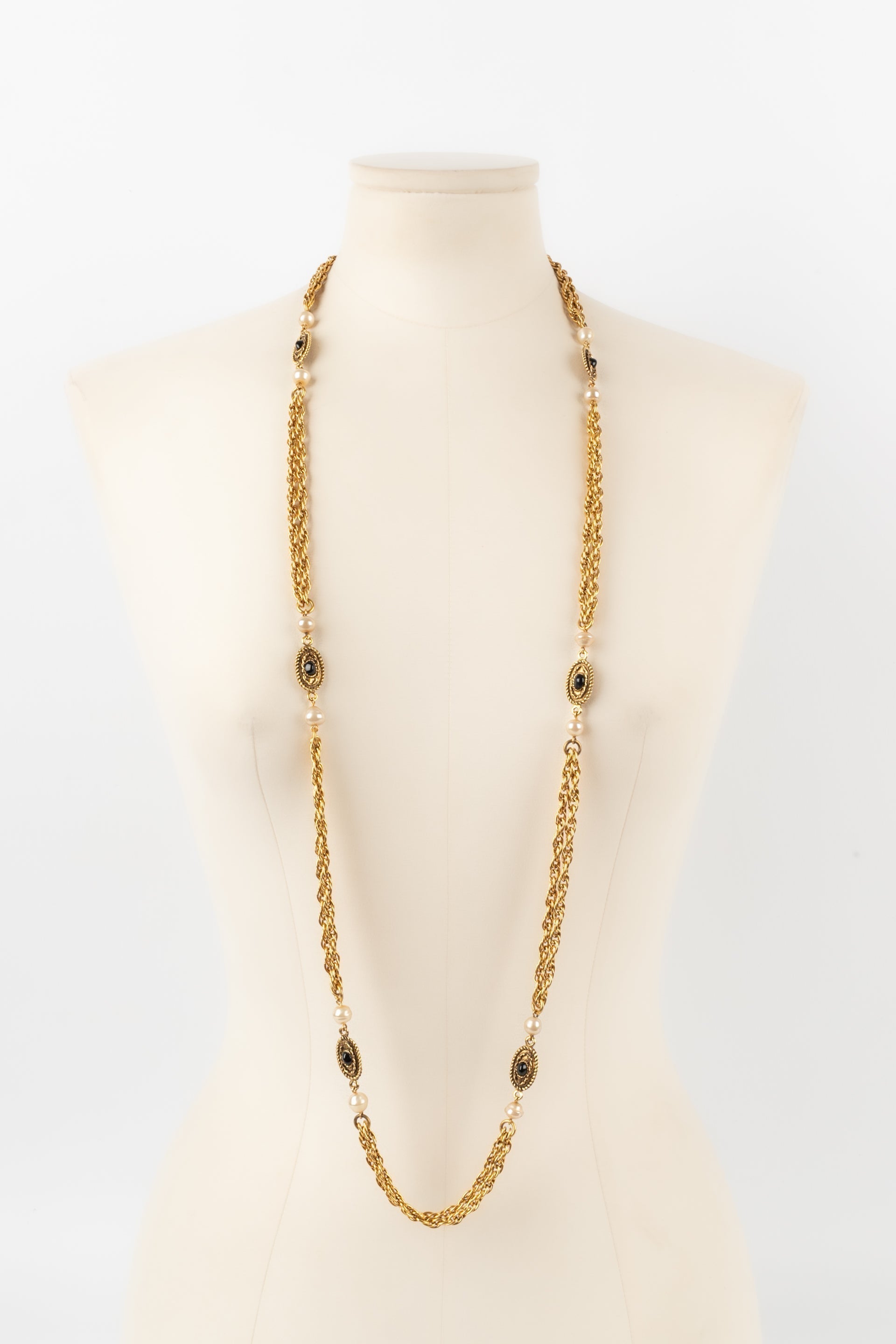 CHANEL - (Made in France) Collier / sautoir en mtal dor, perles nacres fantaisies et petits cabochons en pte de verre. Collection 1982.