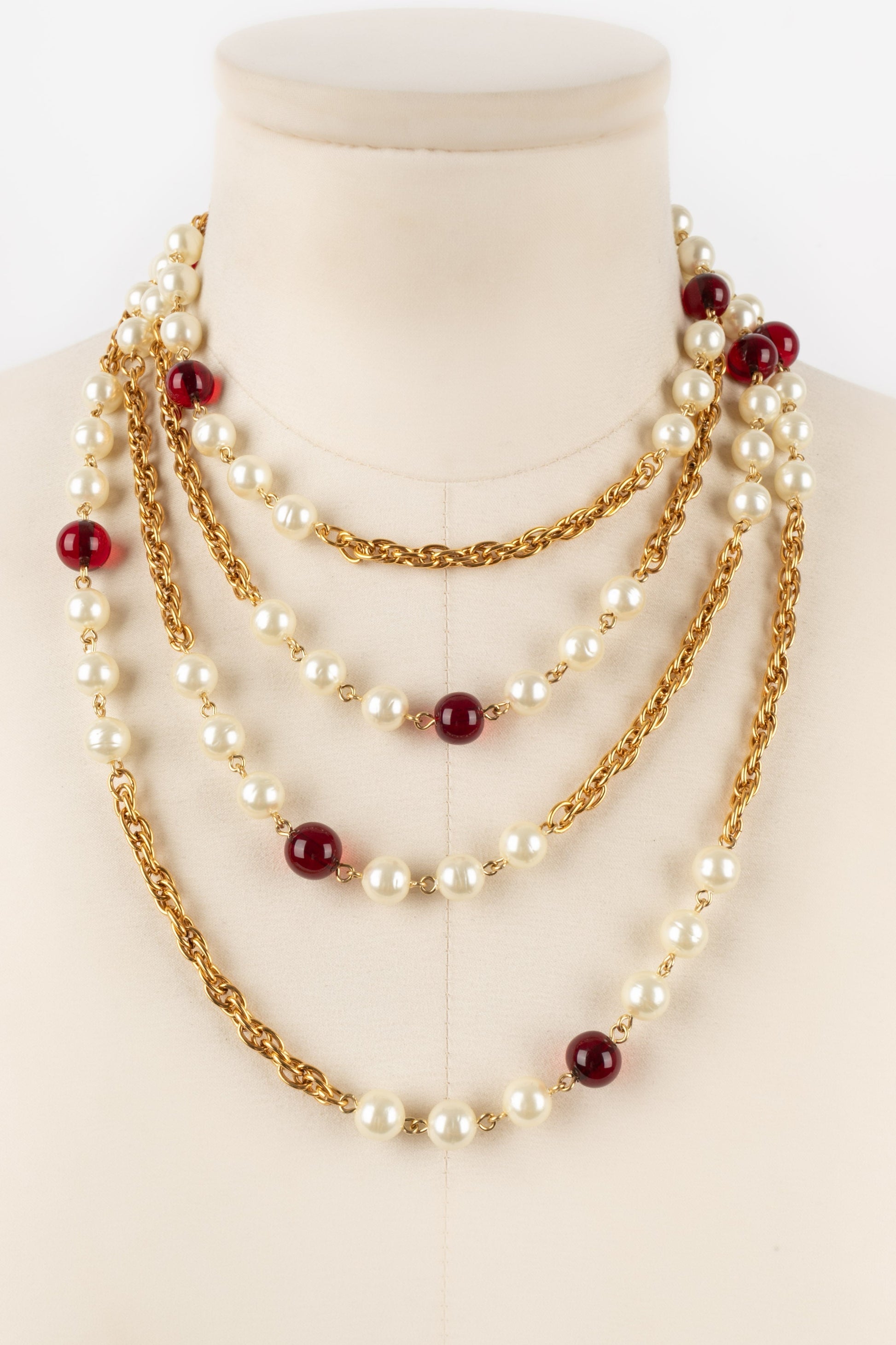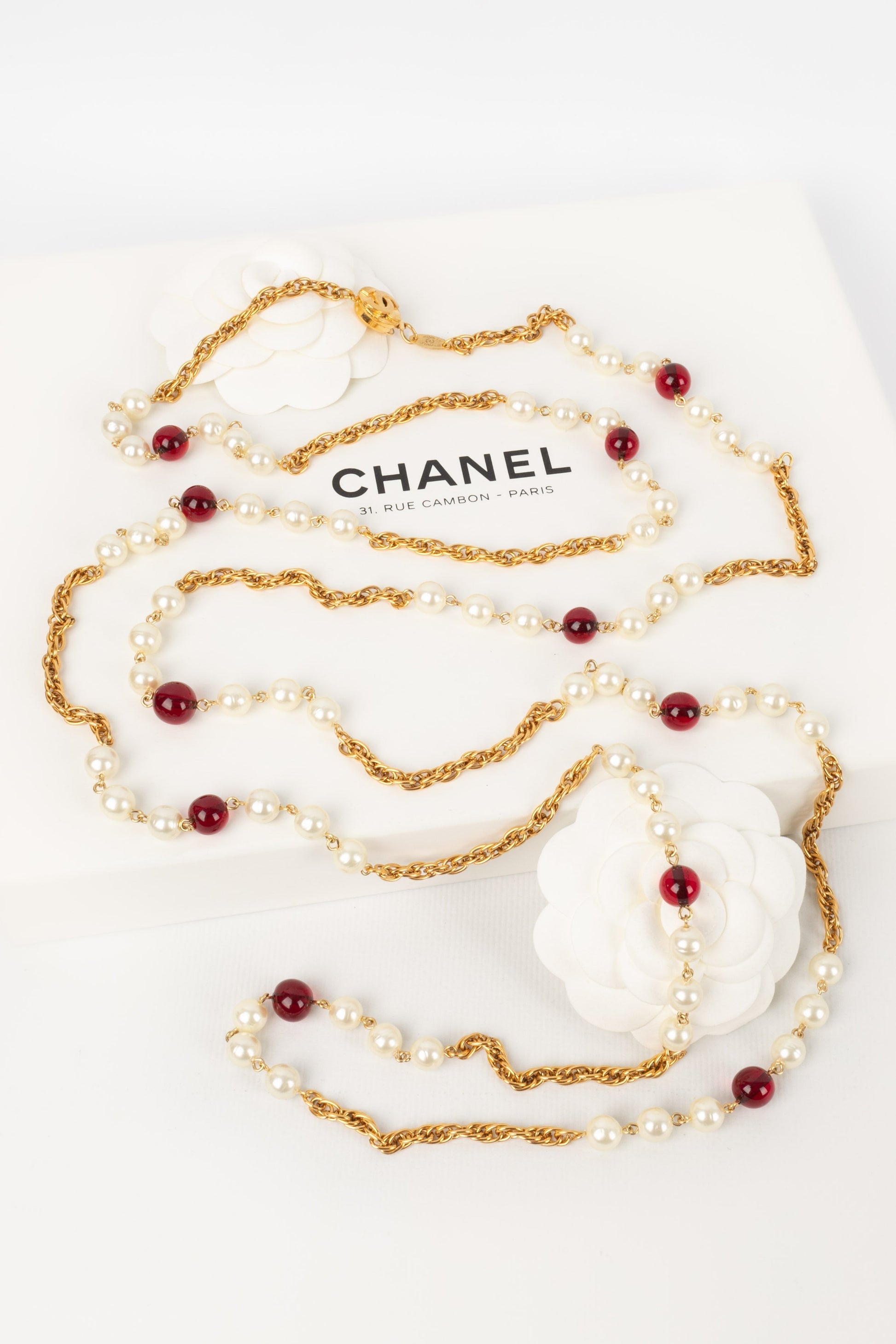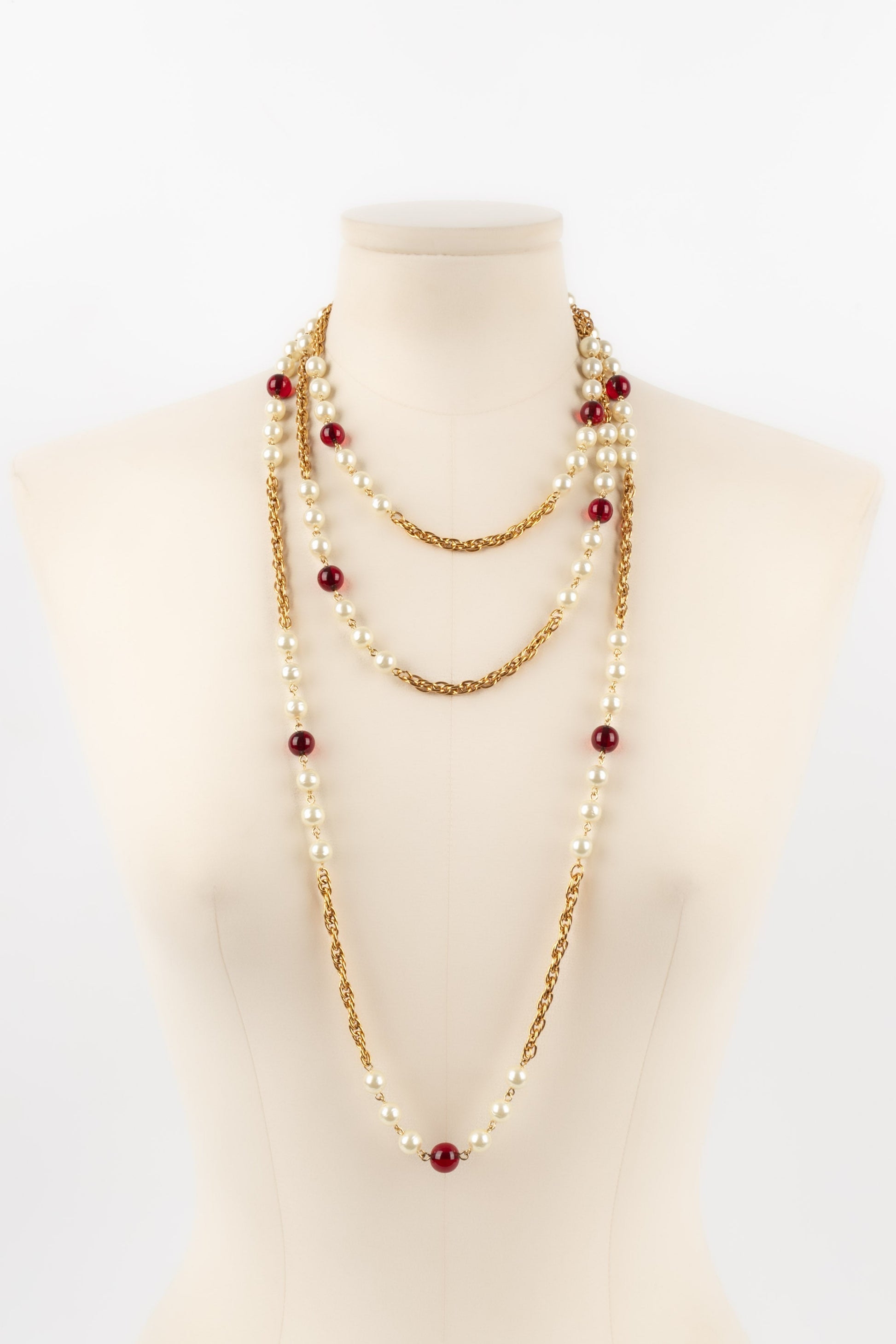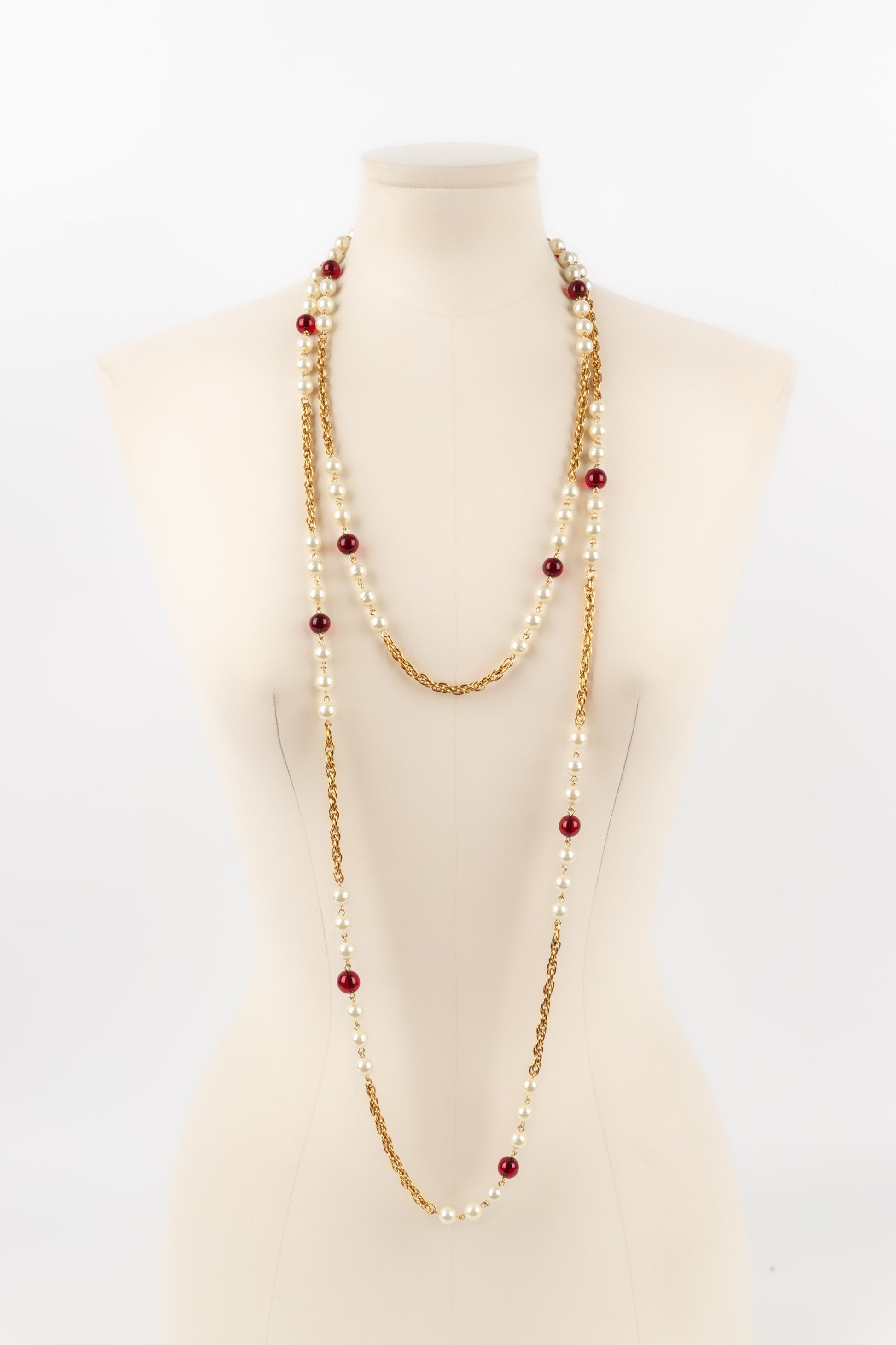 CHANEL - (Made in France) Collier / sautoir en mtal dor, perles nacres fantaisies et perles de verre rouge. Collection 1984.