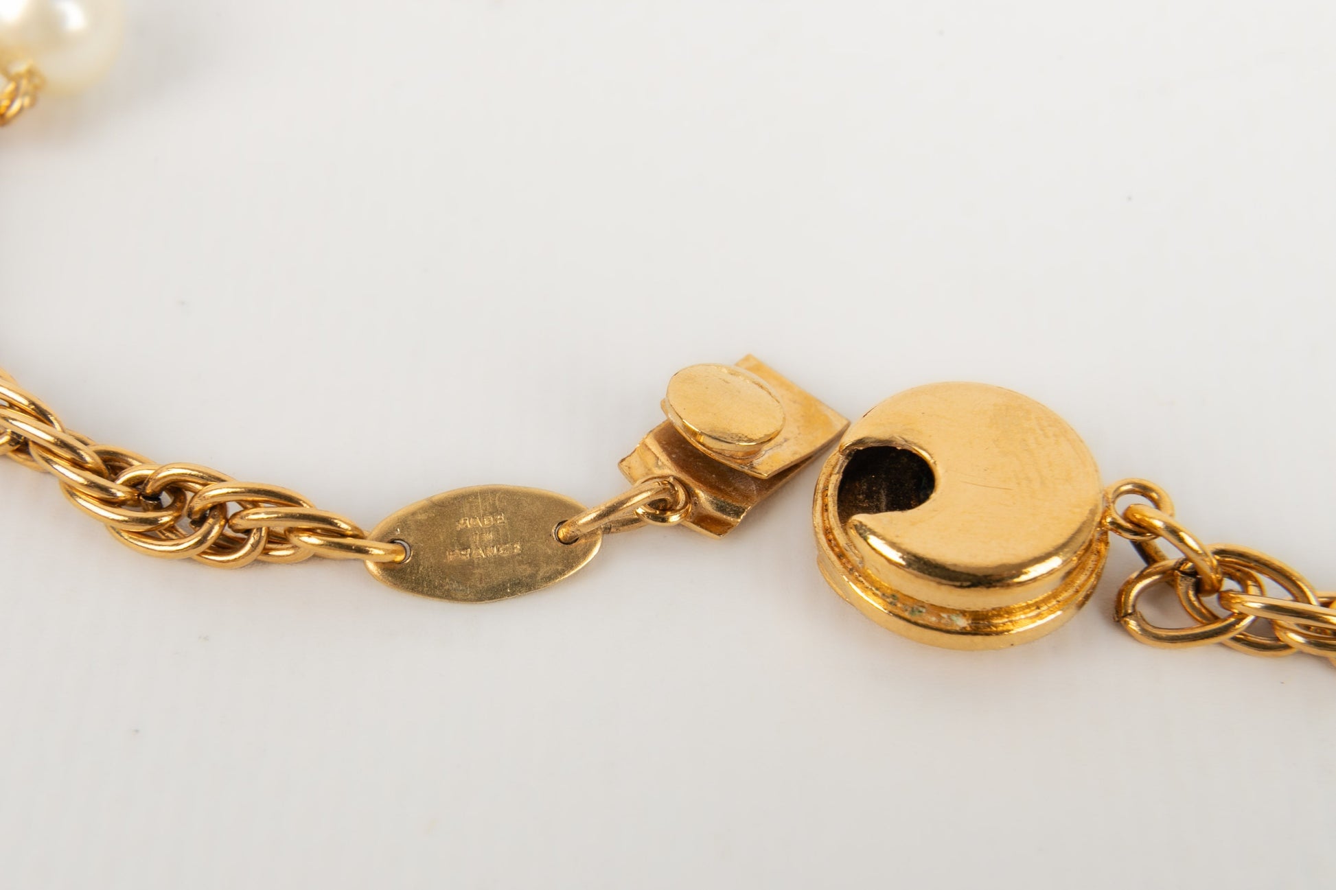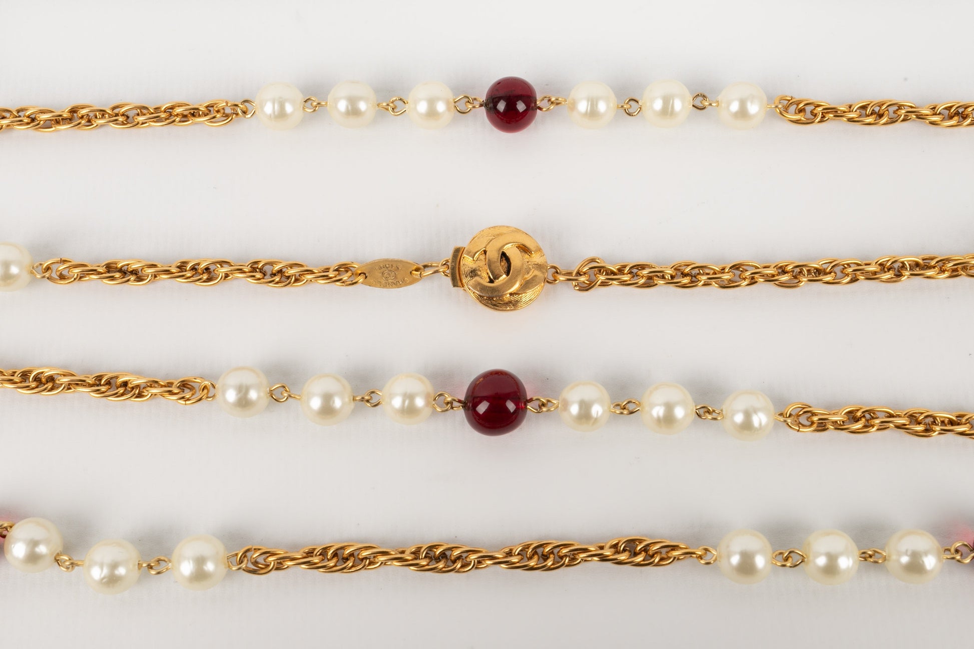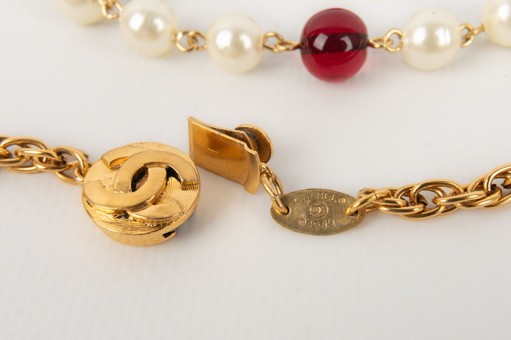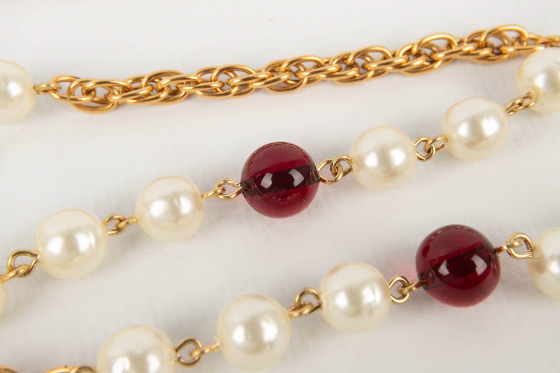CHANEL - (Made in France) Collier / sautoir en mtal dor, perles nacres fantaisies et perles de verre rouge. Collection 1984.