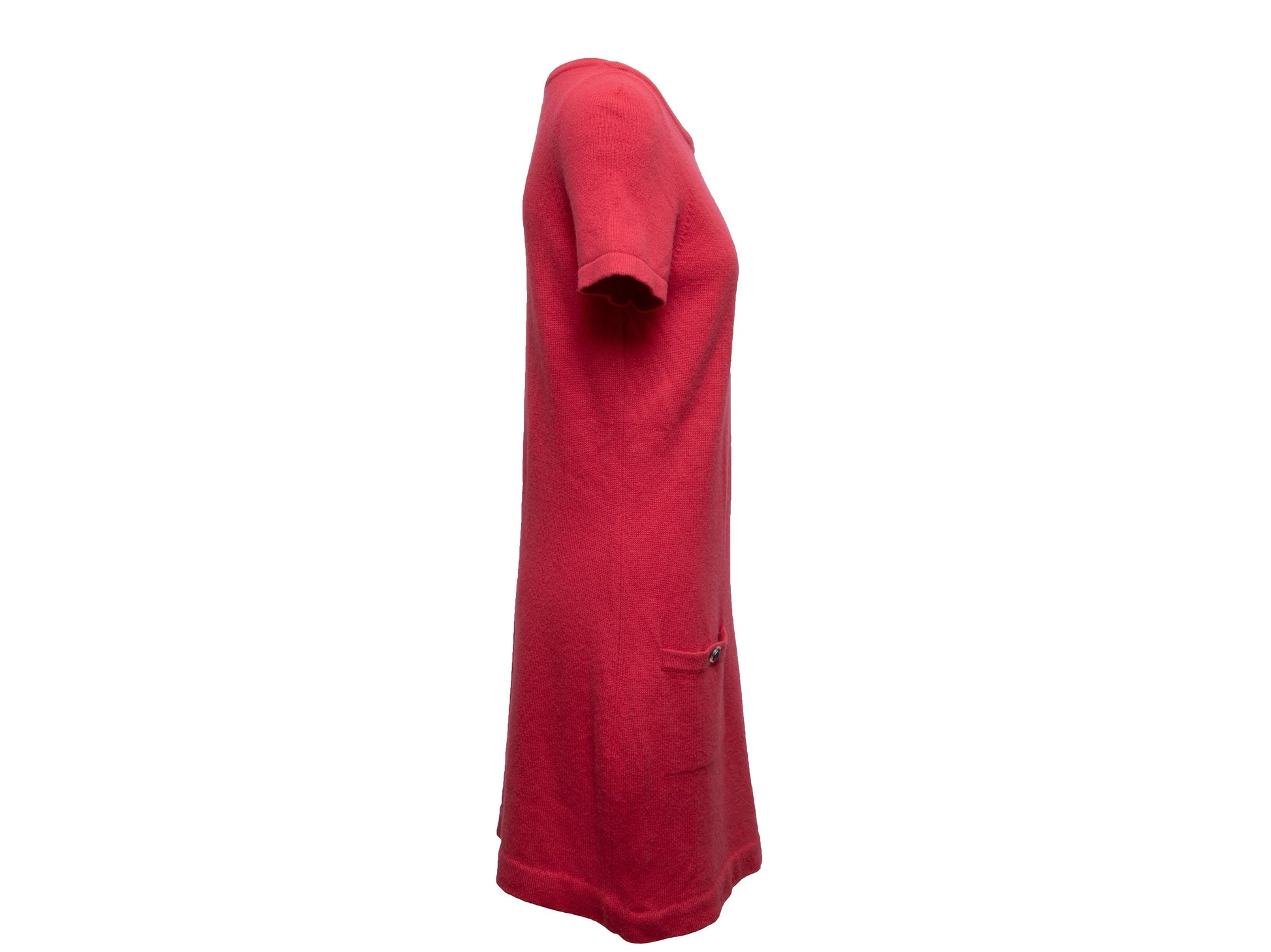Product Details: Coral cashmere knit mini dress by Chanel. From the Fall/Winter 2009 Collection. Crew neck. Short sleeves. Patch accent at sleeve. Dual front pockets. 34" bust, 32" waist, 35" length, 11" shoulder width.