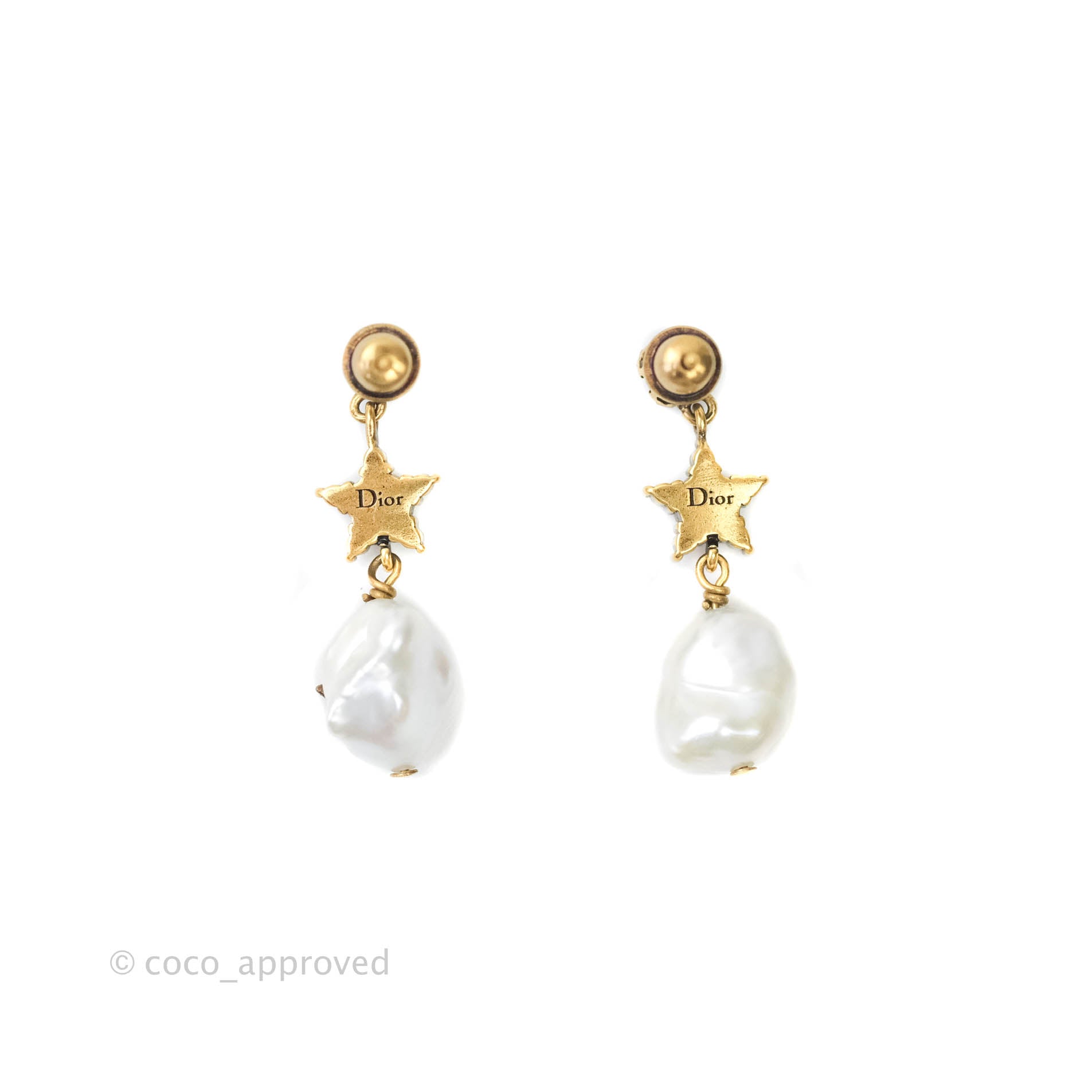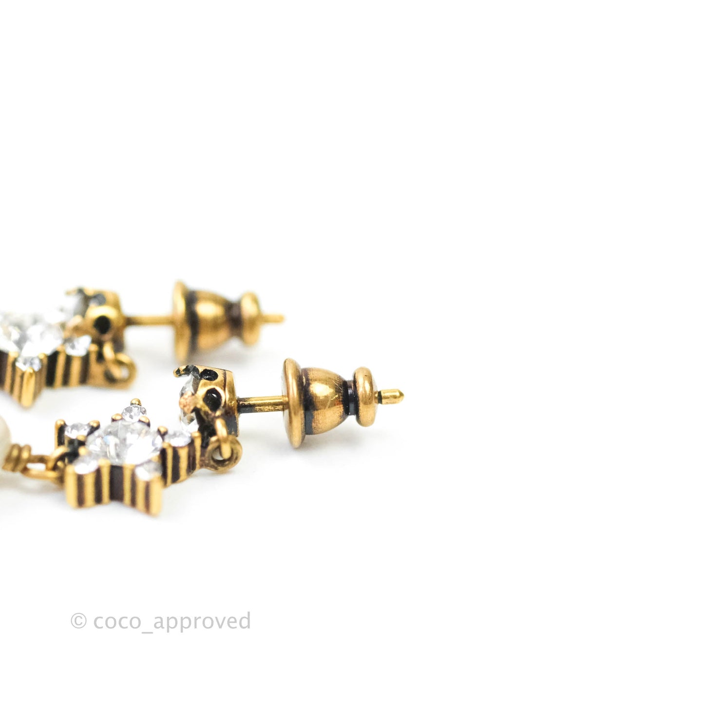 Christian Dior Crystal Star Pearl Drop Earrings Aged Gold Tone