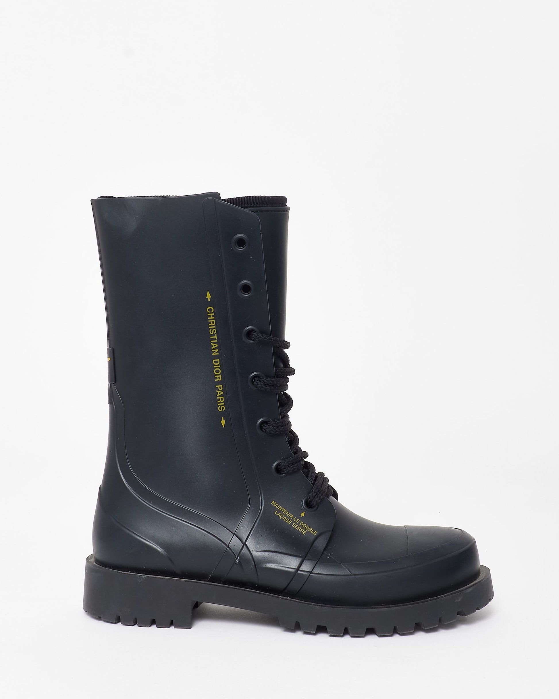 Explore these Dior Black Diorcamp Rubber Lace Up Combat Boots are a bold and stylish footwear choice, combining the rugged appeal of combat boots with Diors iconic luxury. Crafted from durable black rubber, these boots are designed to withstand the elements while maintaining a chic look. The lace-up style and chunky lug sole provide both style and practicality, making them a versatile addition to any wardrobe. Mid-calf durable black rubber boots, round toe, lace up fastening, classic combat boot silhouette with lace-up front. Shop Dior shoes at Retyche.