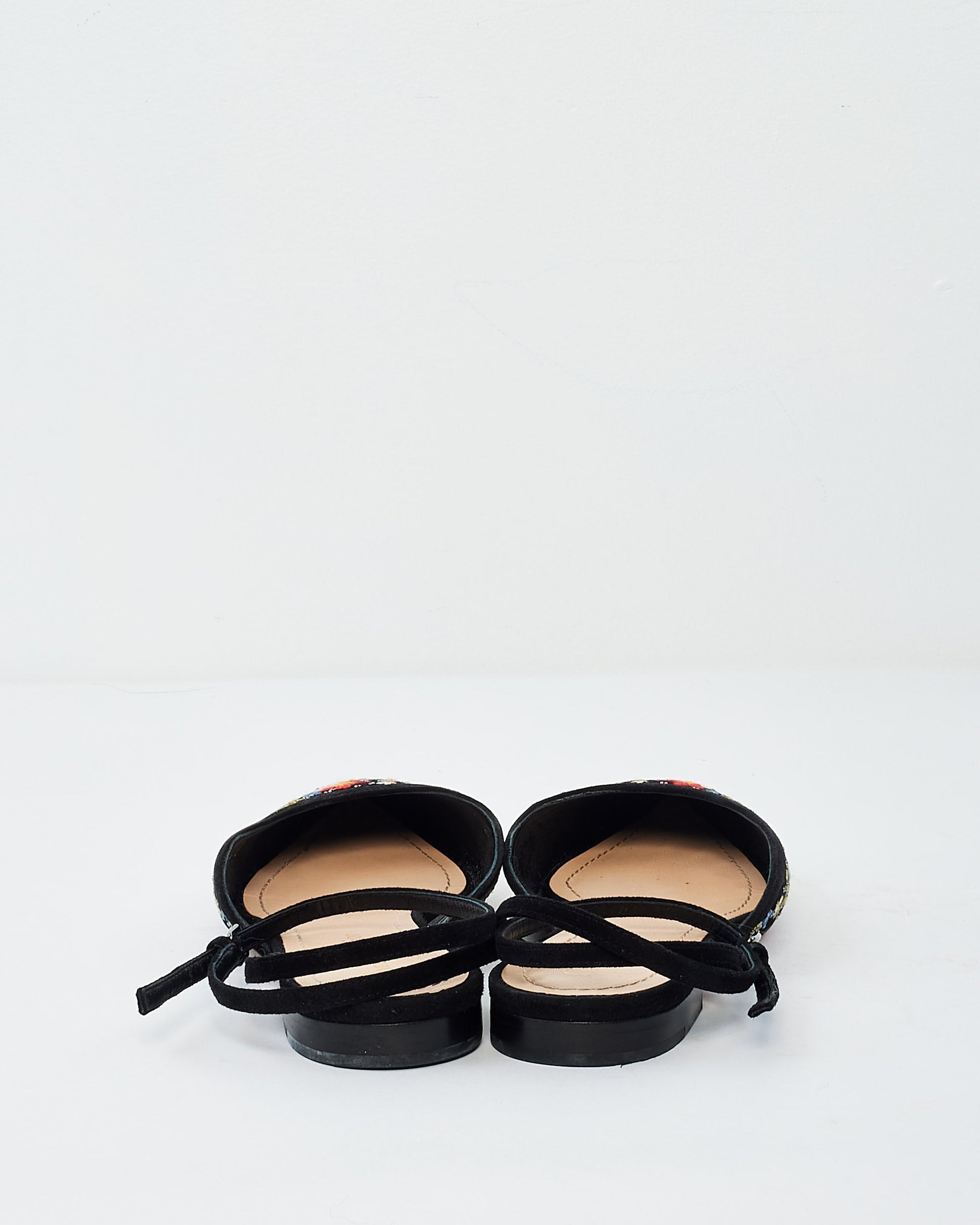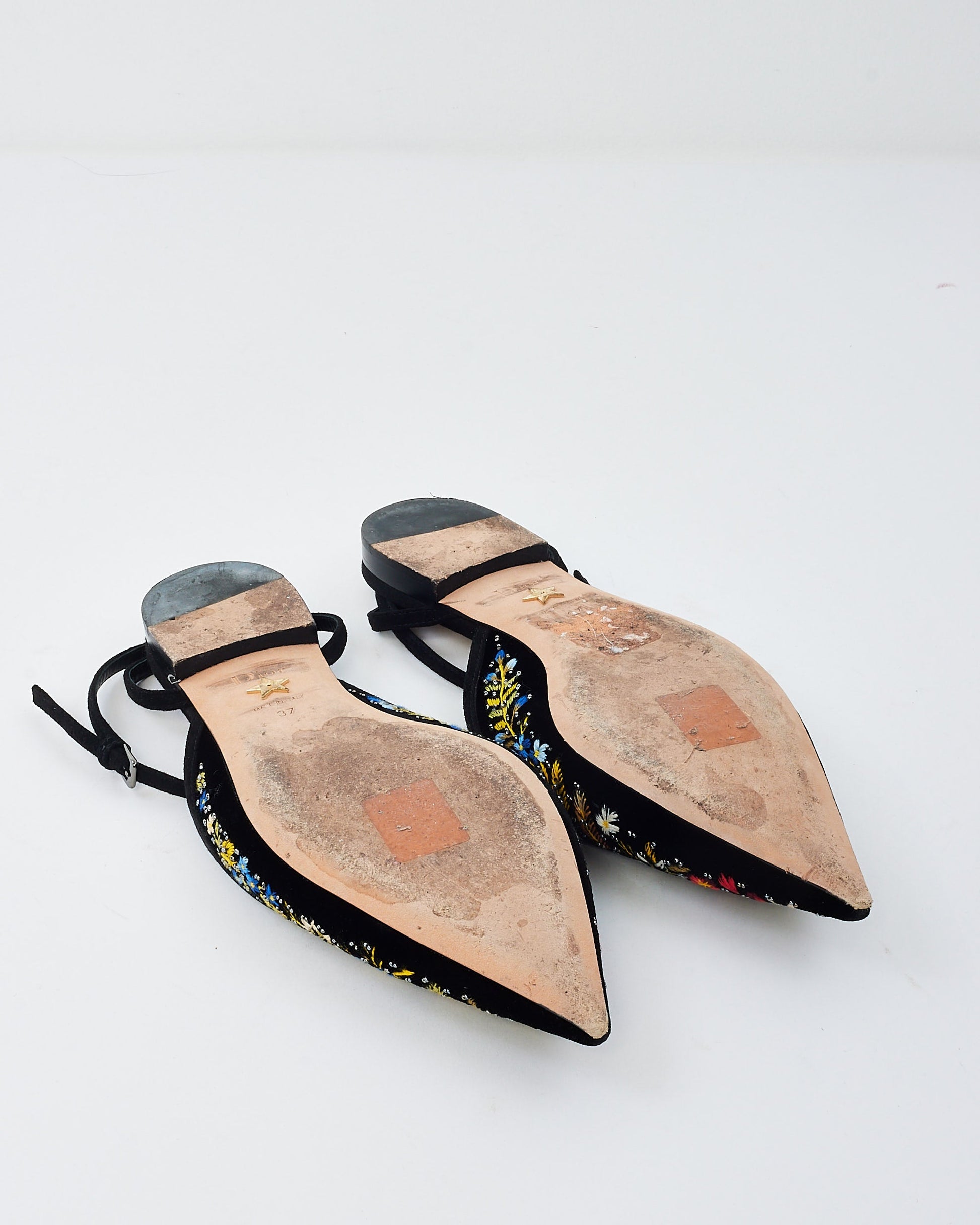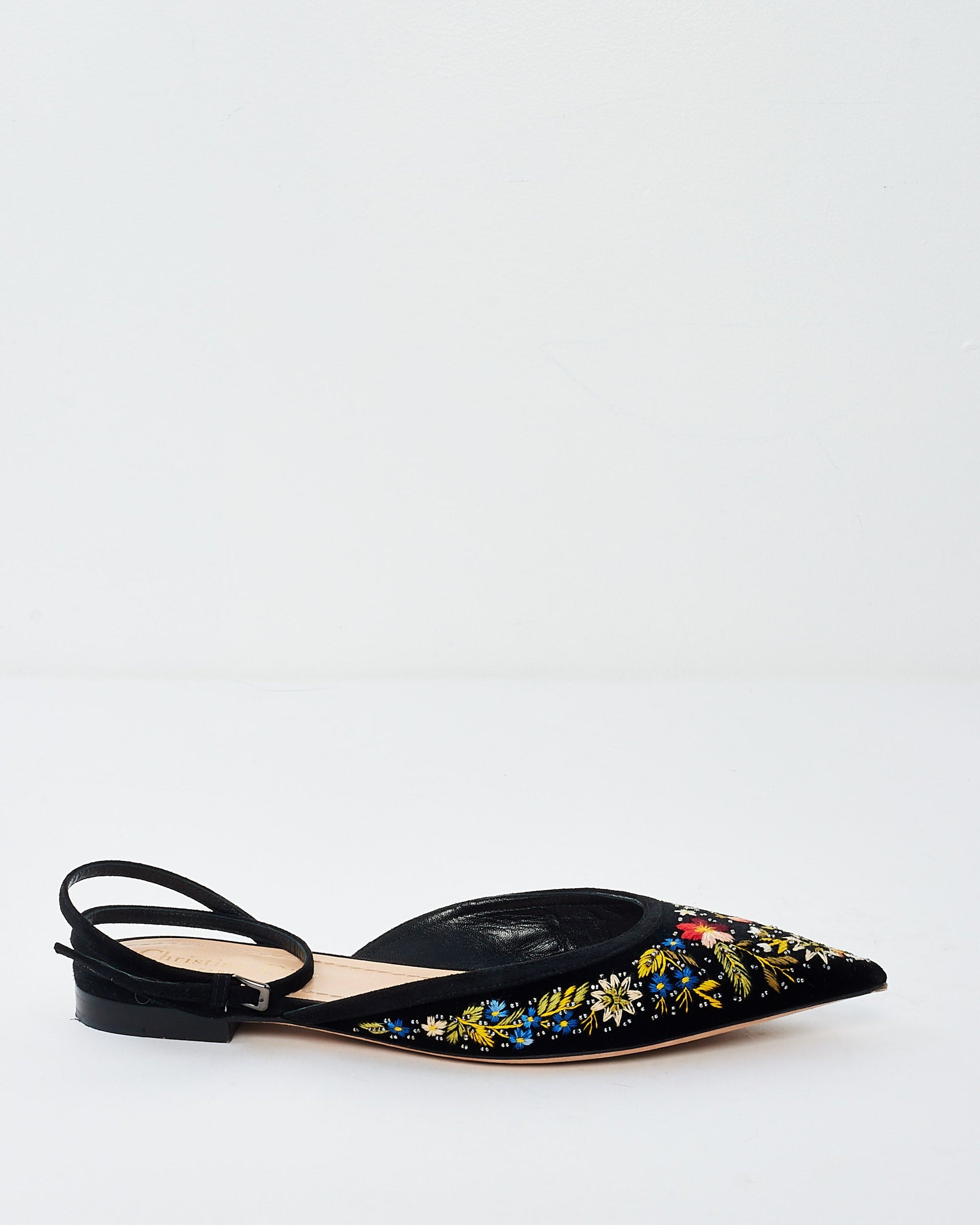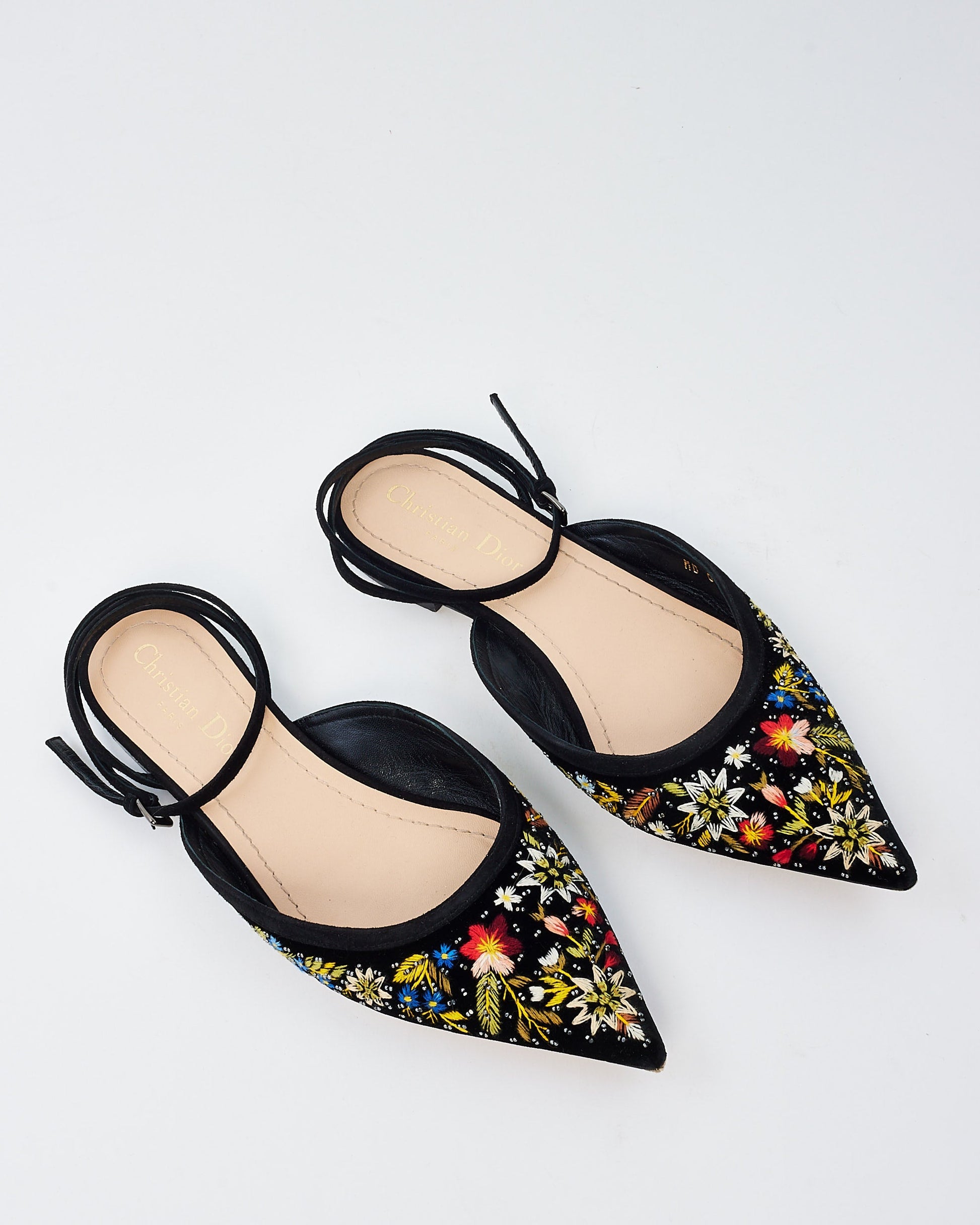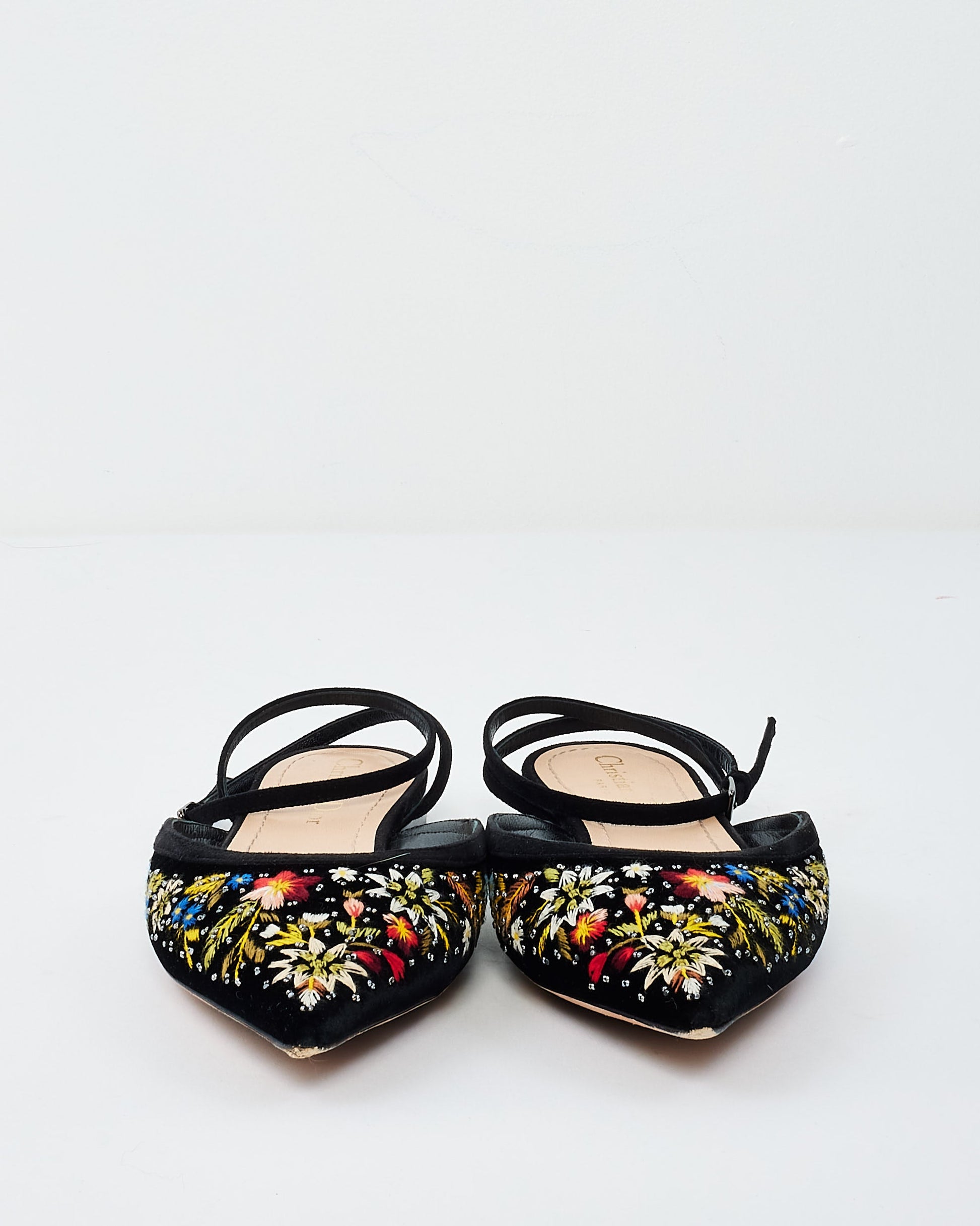 Dior Black Velvet Floral Embroidered Ankle Strap Flats - 37