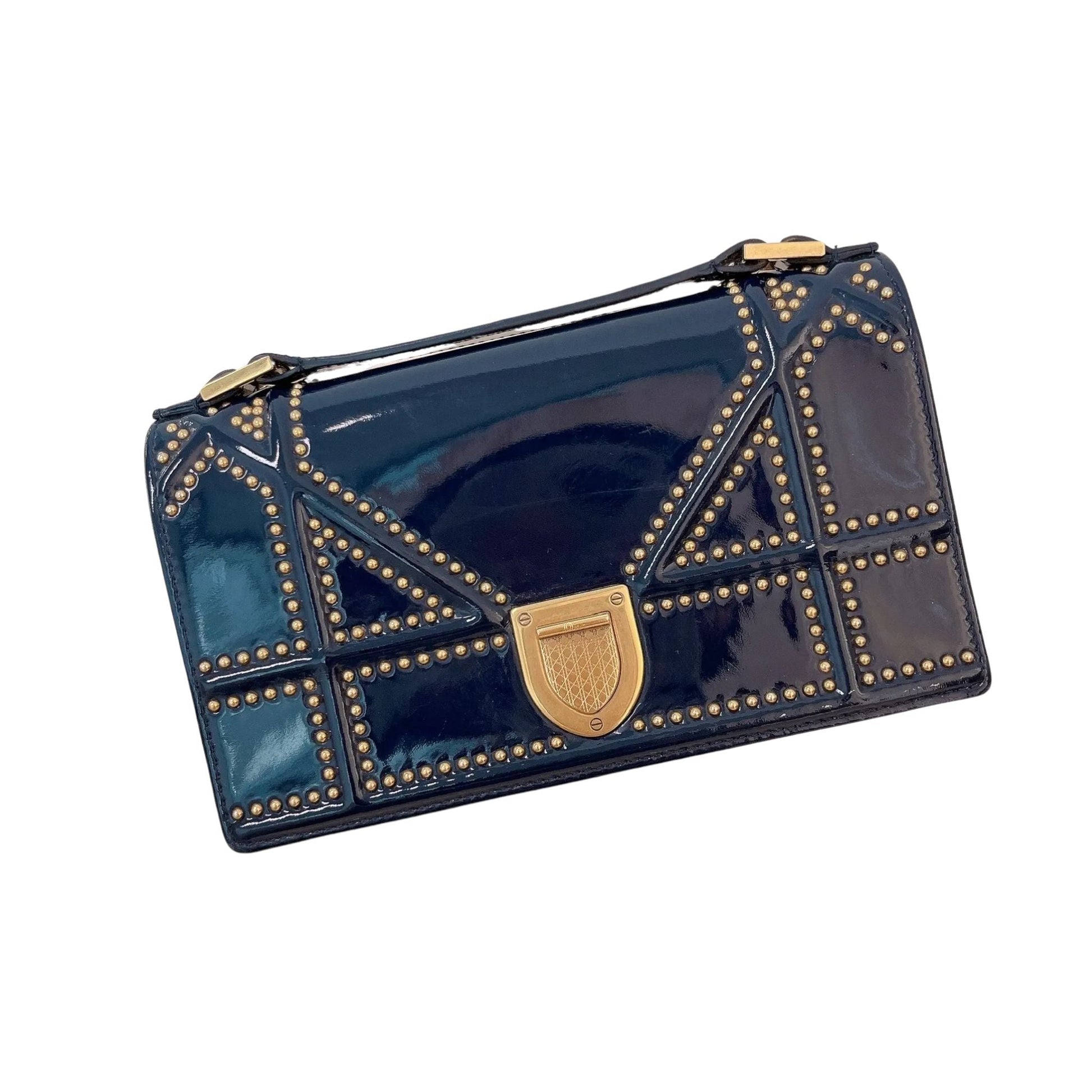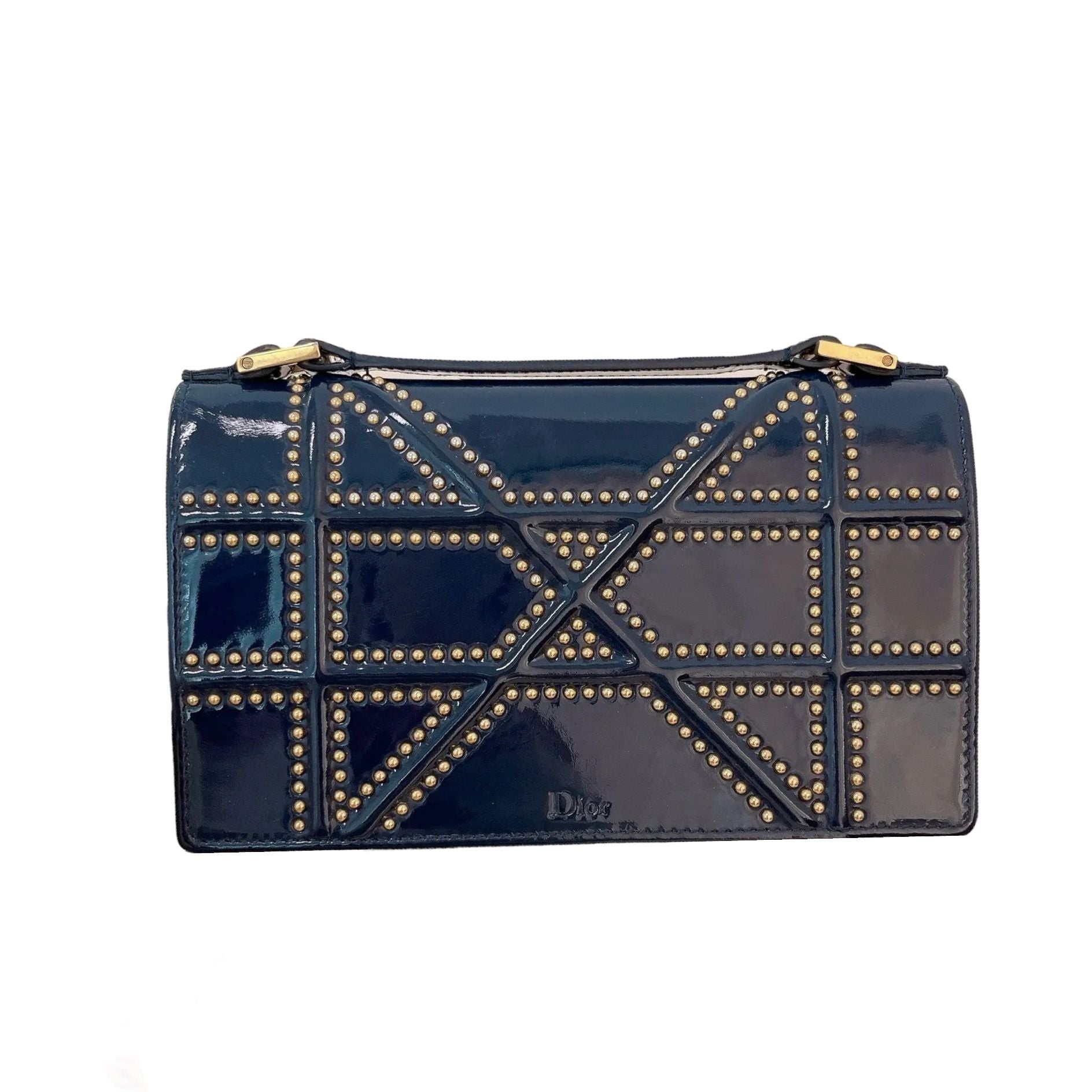 The Dior Diorama WOC in Patent Blue with Gold Hardware is a stylish and practical wallet on chain. It features a glossy finish in blue patent leather, and stuffed gold-tone accents.
