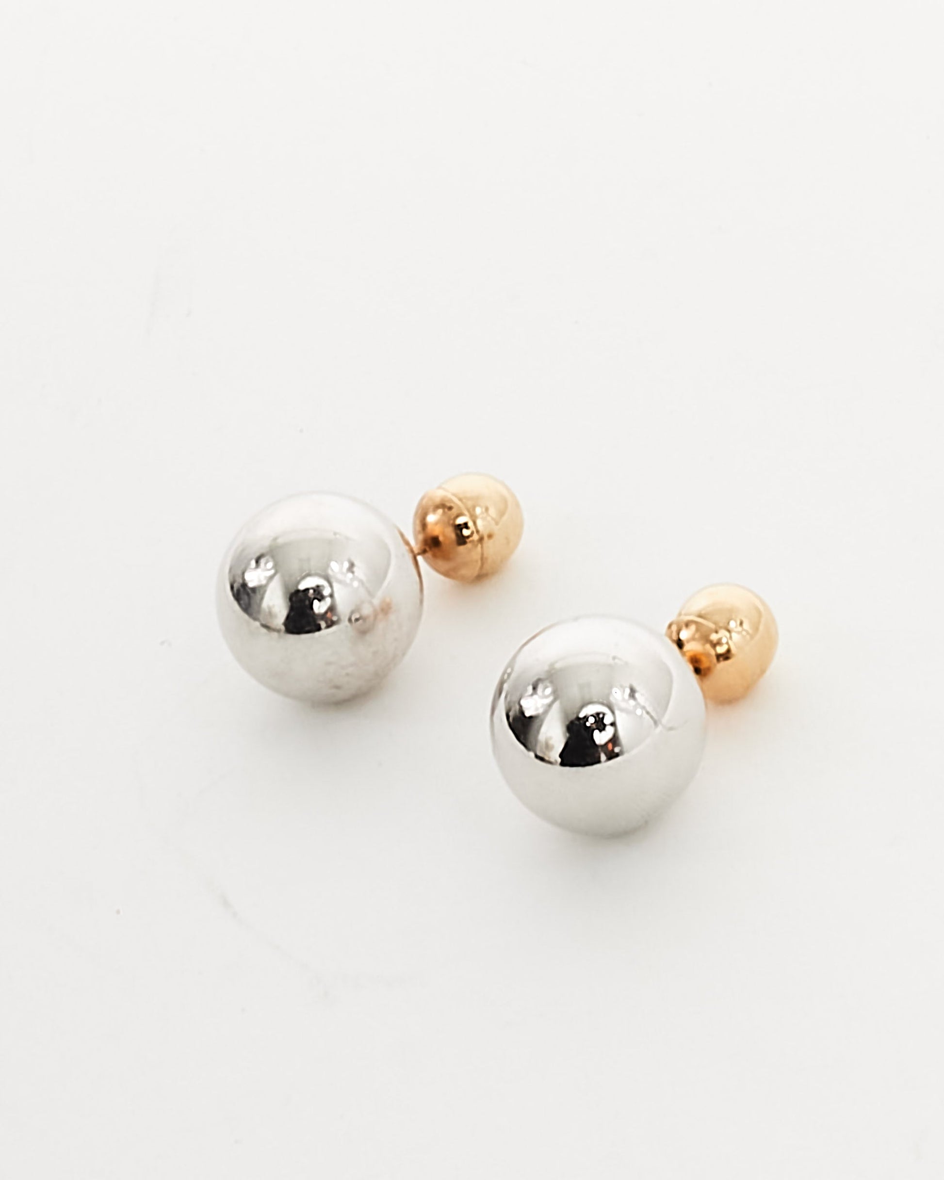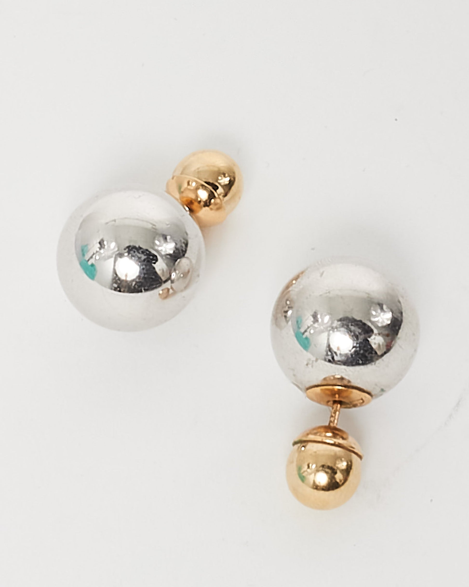 Make a statement with the ated Dior Gold & Silver Mise En Dior Tribal Earrings, an iconic piece that seamlessly blends modern elegance with timeless sophistication. Featuring a double-sided design, these earrings showcase a smaller gold-tone stud on the front and a larger silver-tone sphere at the back, creating a bold and contemporary aesthetic.
