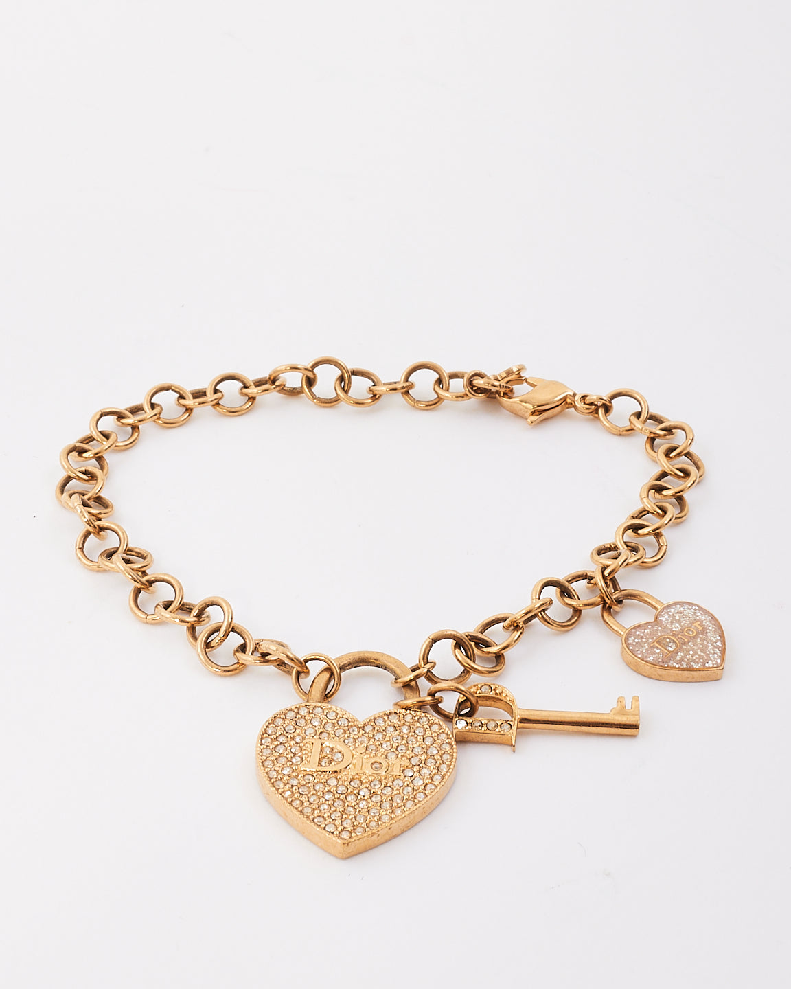 Dior Gold Tone Metal Crystal Heart & Key Charm Bracelet