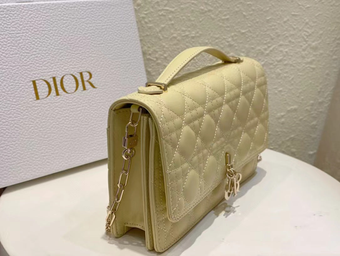 New for the Cruise 2024 collection, the Miss Dior Top Handle bag presents an elegant and functional design. The bag is crafted in pastel yellow lambskin with Cannage stitching and features a flap that is enhanced by a D.I.O.R. charm, revealing two compartments and a zipped pouch to accommodate all the essentials, day or night. The signature Top Handle is completed by a removable chain strap with a leather insert, allowing it to be comfortably carried by hand, worn over the shoulder or crossbody.