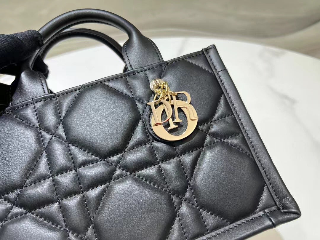 The Dior Book Tote is a House classic and original design by Maria Grazia Chiuri, Creative Director of Christian Dior. Constructed in black calfskin, it is embellished with hallmark Macrocannage topstitching and accented by pale gold-finish metal D.I.O.R. charms adorning one of the top handles. Exemplifying House savoir-faire, the miniature style features an adjustable and removable strap that allows it to be carried by hand, worn over the shoulder or crossbody.