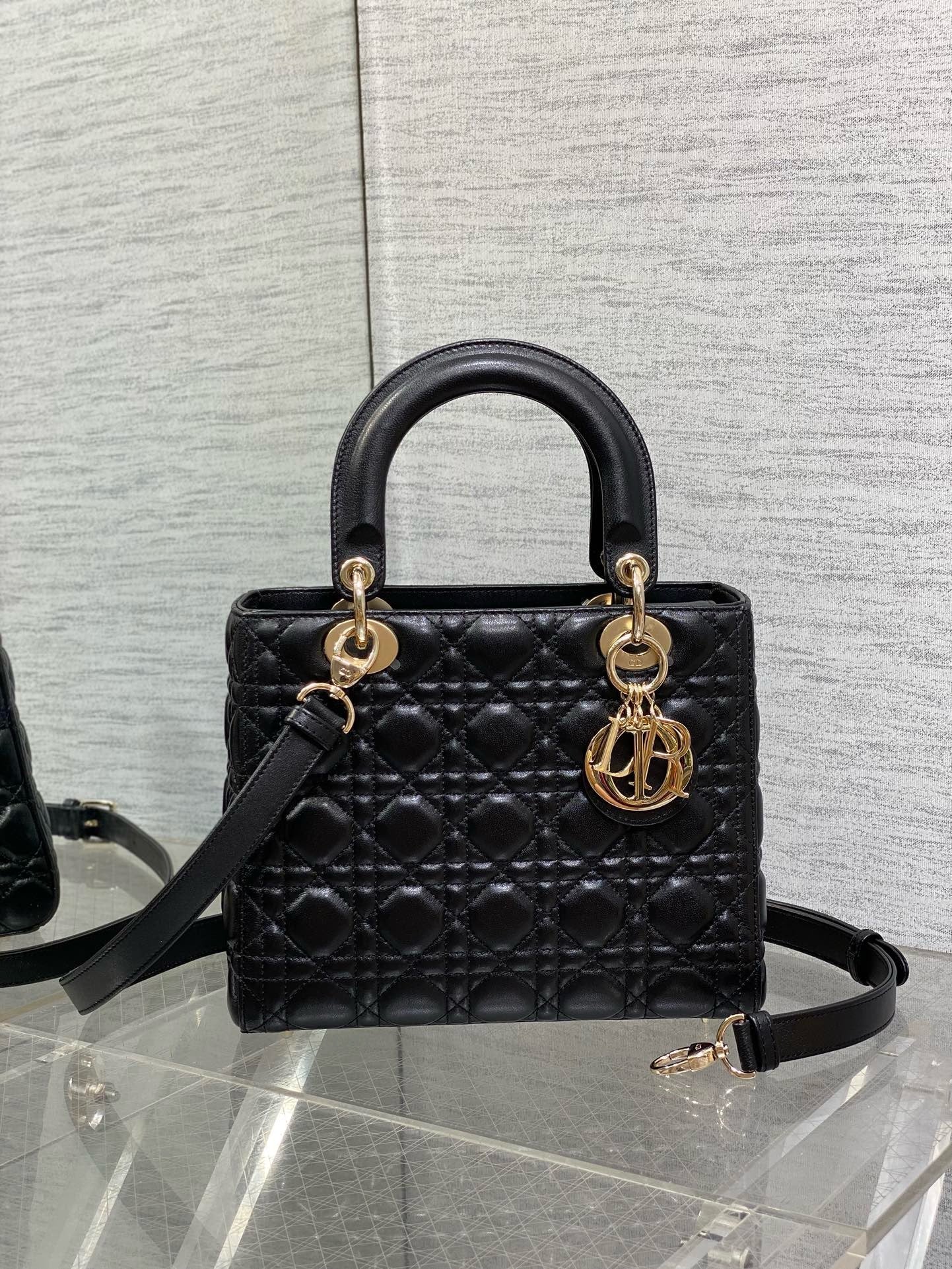 The Lady Dior bag epitomizes the House's vision of elegance and beauty. Sleek and refined, the timeless creation is crafted in black lambskin with Cannage stitching, creating the instantly recognizable quilted texture. The pale gold-finish metal D.I.O.R. charms offer elegant appeal. Featuring a thin, removable leather shoulder strap, the medium Lady Dior bag can be carried by hand or worn crossbody.