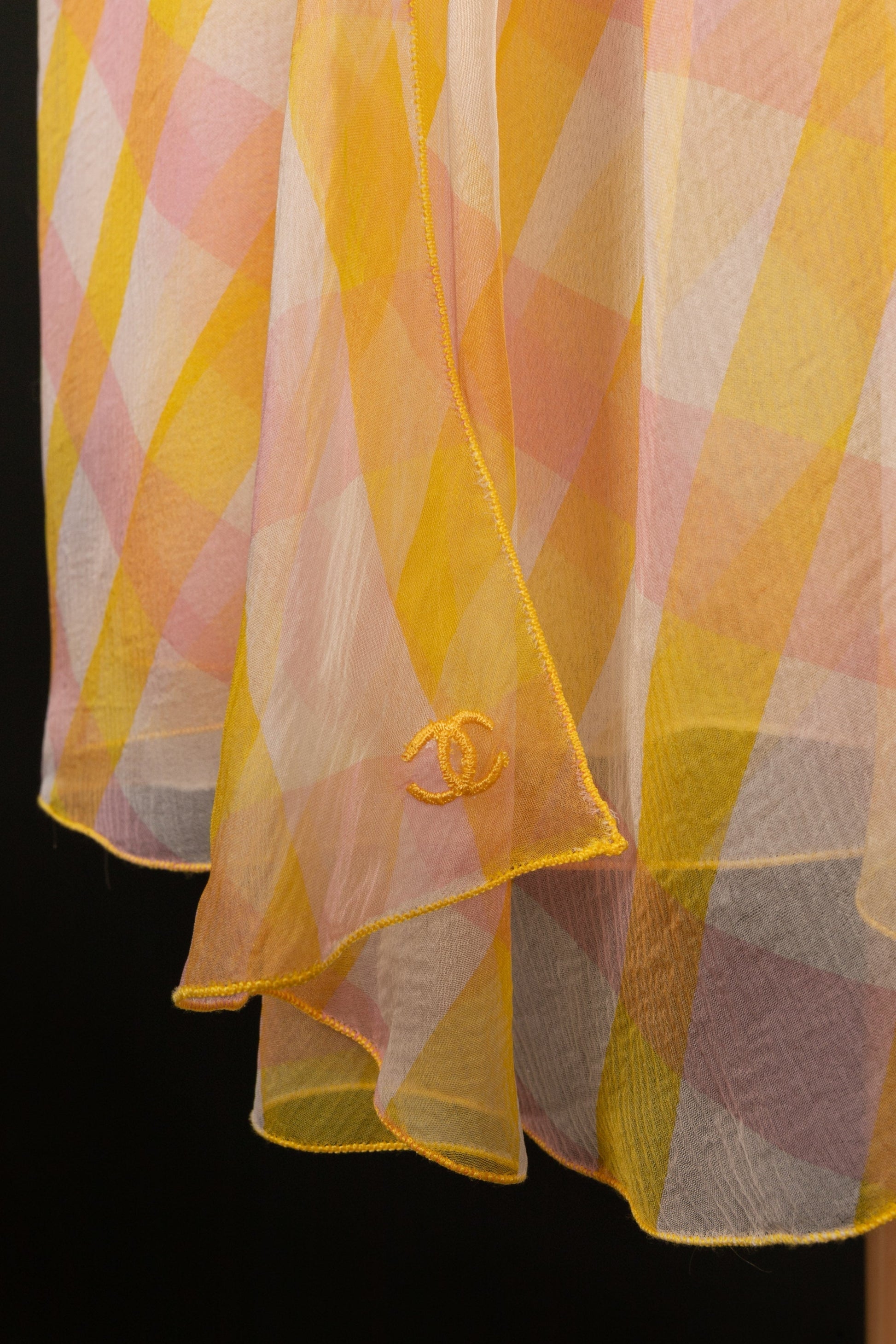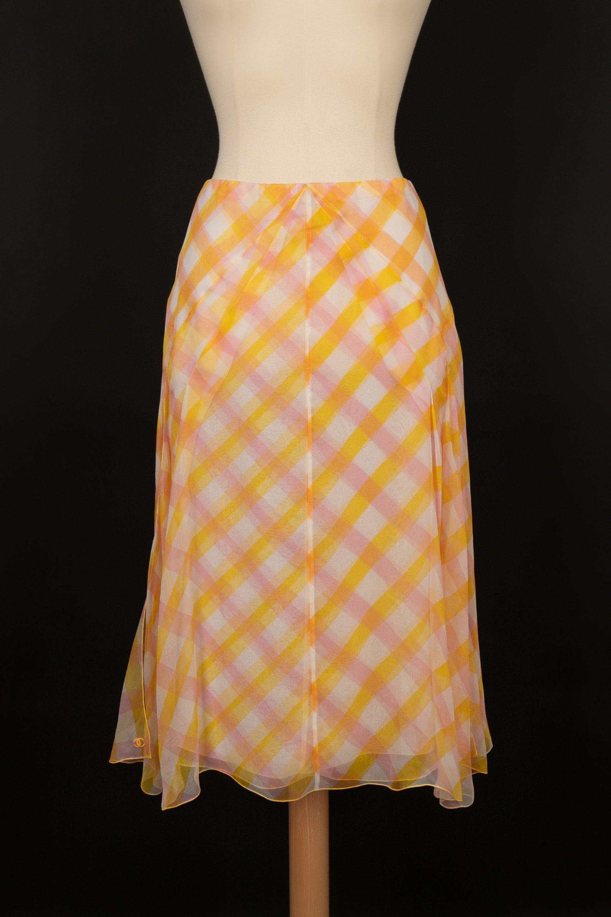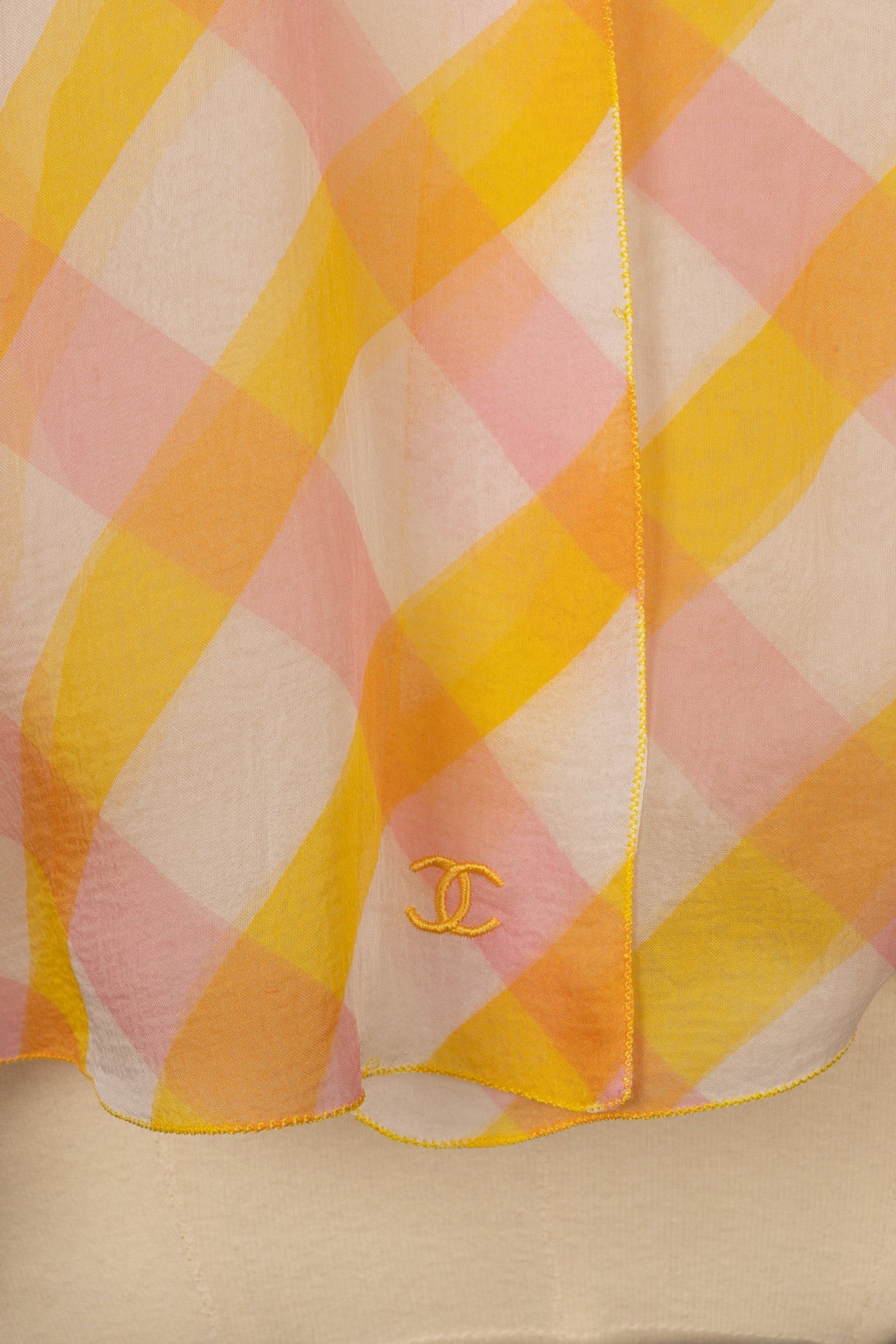 CHANEL - (Made in France) Ensemble compos dun top nouer et dune jupe en crpe mousseline de soie imprim dun motif de carreaux jaune, rose, cru. Taille indique 38FR. Collection croisire 1999.